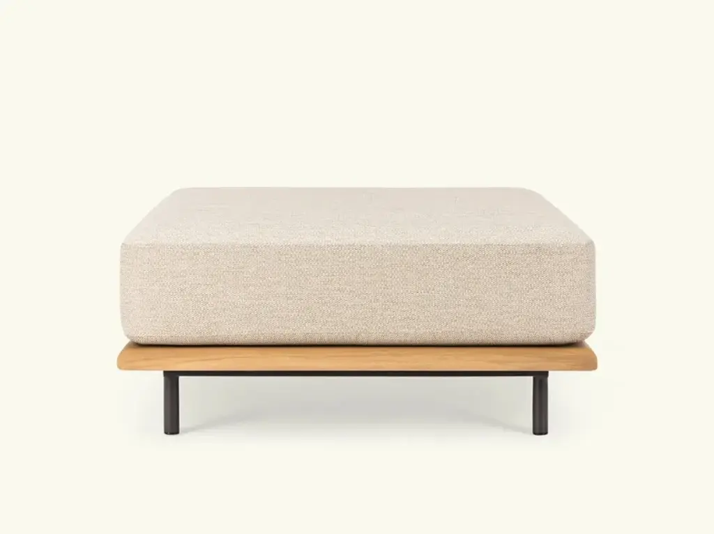 Rada is a garden pouf composed of a low coffee table with metal structure and wooden slat top and a removable cushion with outdoor quick dry foam padding (anti-humidity) with Sunproof Olefin fabric (100% polypropylene).Colors:7000009 - Rada square coffee table with square beige cushion7000012 - Rada square coffee table with square aquamarine cushion7000015 - Rada square coffee table with square blue cushionA living room without walls: the Rada collection reinvents the outdoor space as if it were a room in the house. Elegant and cozy. Rada draws The name from the natural cove that gives shelter to ships and echoes its cozy shapes. The sofa, an iconic element of the collection, through its modular design offers the possibility of configuring the outdoor space in different hospitality situations, like a real living area.The collection consists of lounge area, dining area and loungers. The whole line is generous in character, which is evident in the size, depth and softness of the upholstery. Different combinations of materials: teak base and tops, aluminum frame softened by a weave in the back of the sofas and thin padding in the dining area seats.