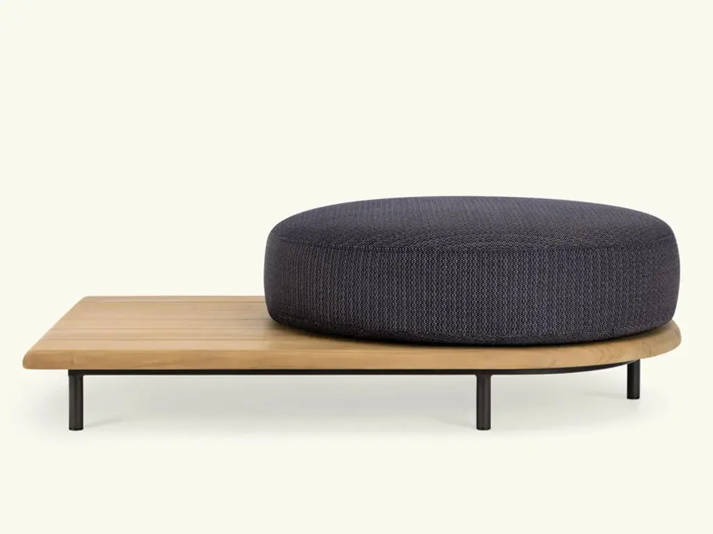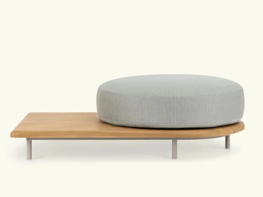 Rada is a garden pouf composed of a low coffee table with metal structure and wooden slat top and a removable cushion with outdoor quick dry foam padding (anti-humidity) with Sunproof Olefin fabric (100% polypropylene).Colors:7000007 - Rada coffee table with round beige cushion7000010 - Rada coffee table with round aquamarine cushion7000013 - Rada coffee table with round blue cushionA living room without walls: the Rada collection reinvents the outdoor space as if it were a room in the house. Elegant and cozy. Rada draws The name from the natural cove that gives shelter to ships and echoes its cozy shapes. The sofa, an iconic element of the collection, through its modular design offers the possibility of configuring the outdoor space in different hospitality situations, like a real living area.The collection consists of lounge area, dining area and loungers. The whole line is generous in character, which is evident in the size, depth and softness of the upholstery. Different combinations of materials: teak base and tops, aluminum frame softened by a weave in the back of the sofas and thin padding in the dining area seats.