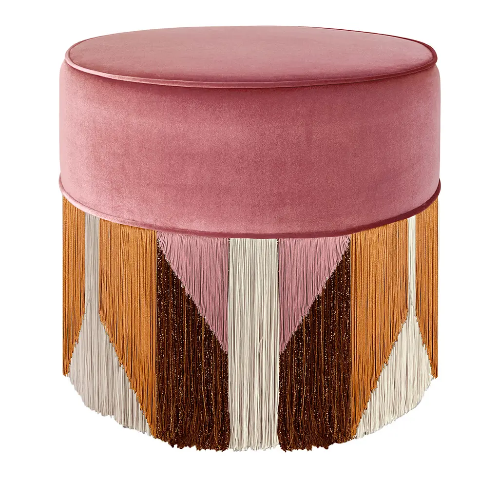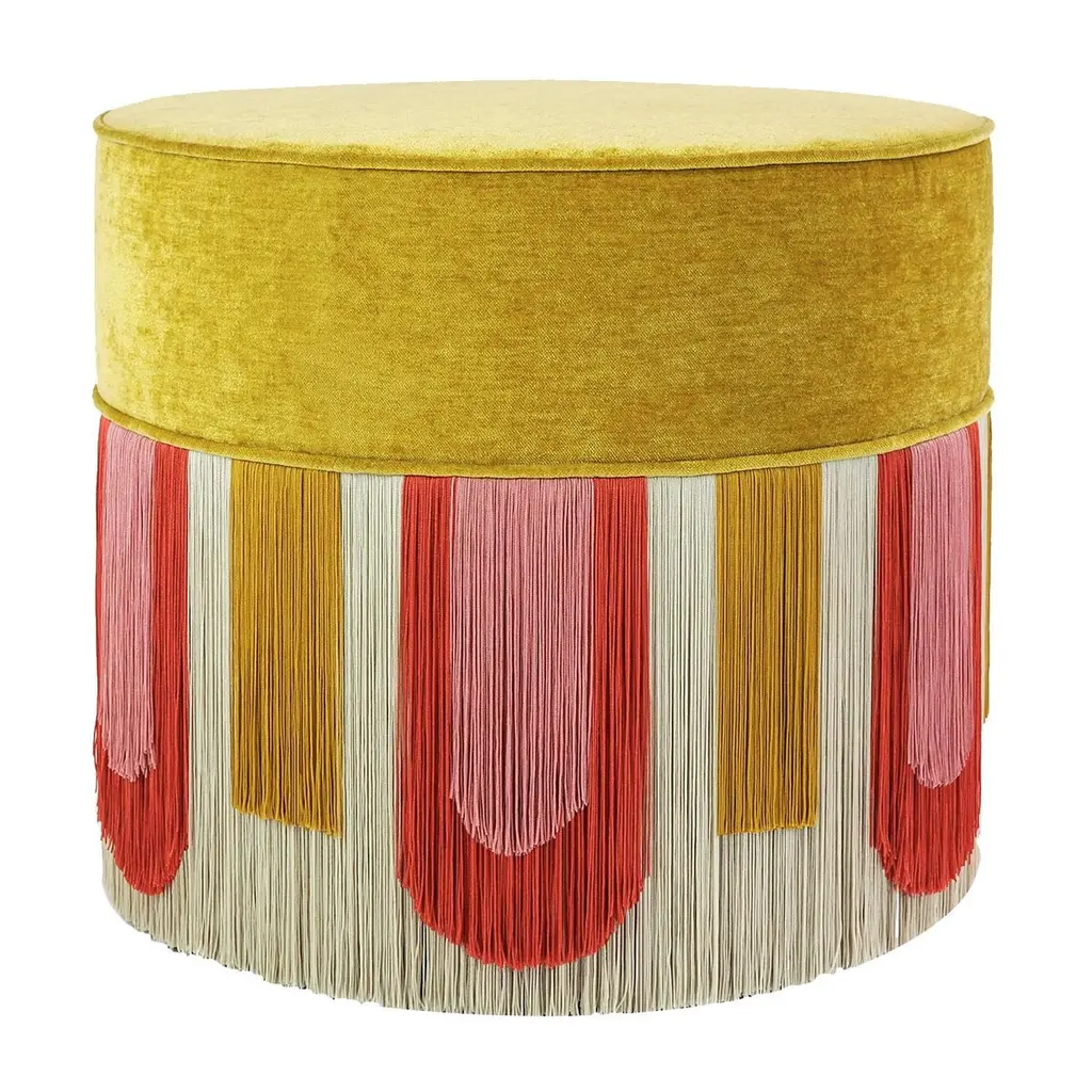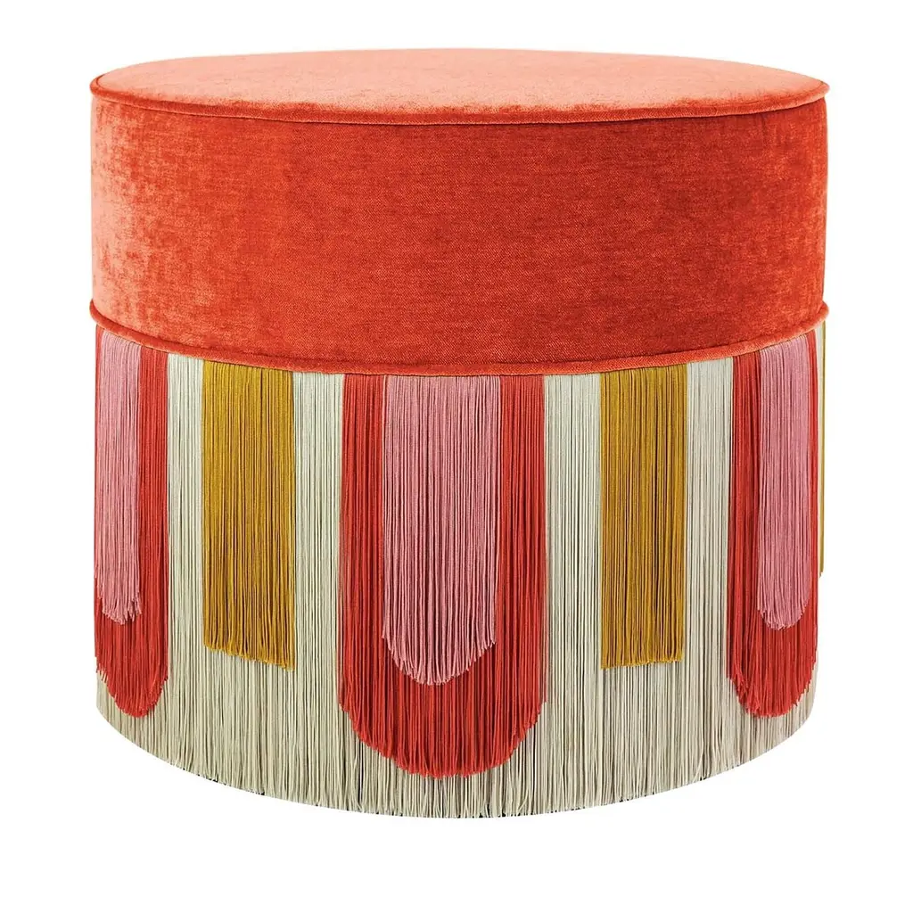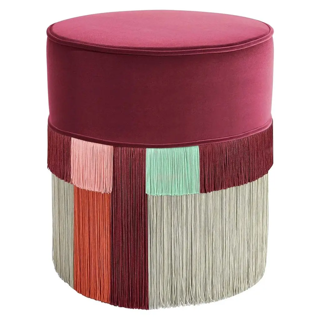 Red Cylinder Beechwood Pouf With Geometric Fringe
