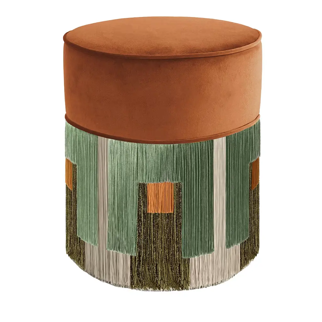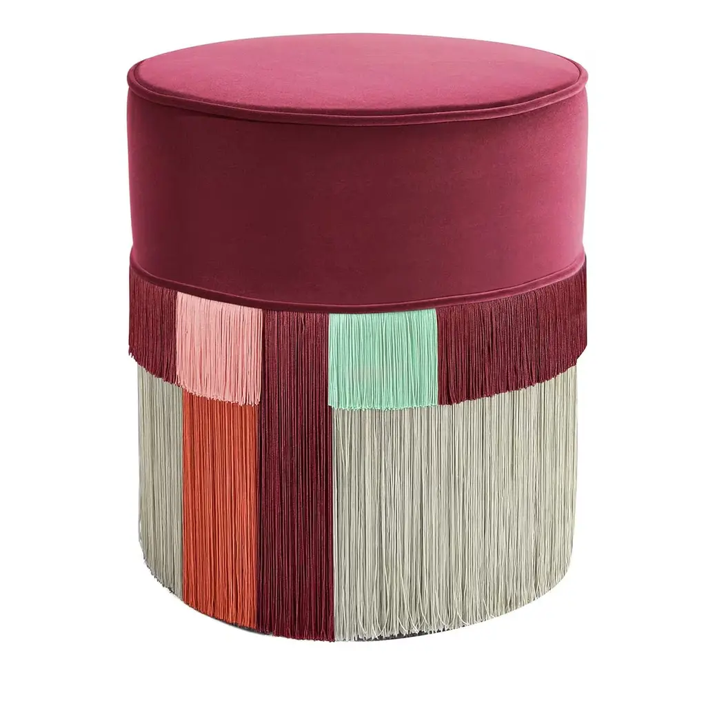 Versatile and stylish, this refined pouf is a testament to aesthetic balance and exceptional craftsmanship. Handmade of beech wood, the wide and round frame on four black-finished legs boasts an upholstered seat cushion in a bold garnet-red velvet, complemented by a geometric, block-color bottom half in hand-woven, viscose fringe. Reminiscent of tribal motifs, layers of long beige fringe are accented by geometric panels in burgundy, green, and light-blue, the original color combination creating an animated piece of furniture. Each bespoke piece is stamped at the bottom of the lining of the pouf, signed, numbered and dated personally by the designer Lorenza Bozzoli. The original authenticity of each product highlights the artisanal quality and the art of a luxury dedicated design.