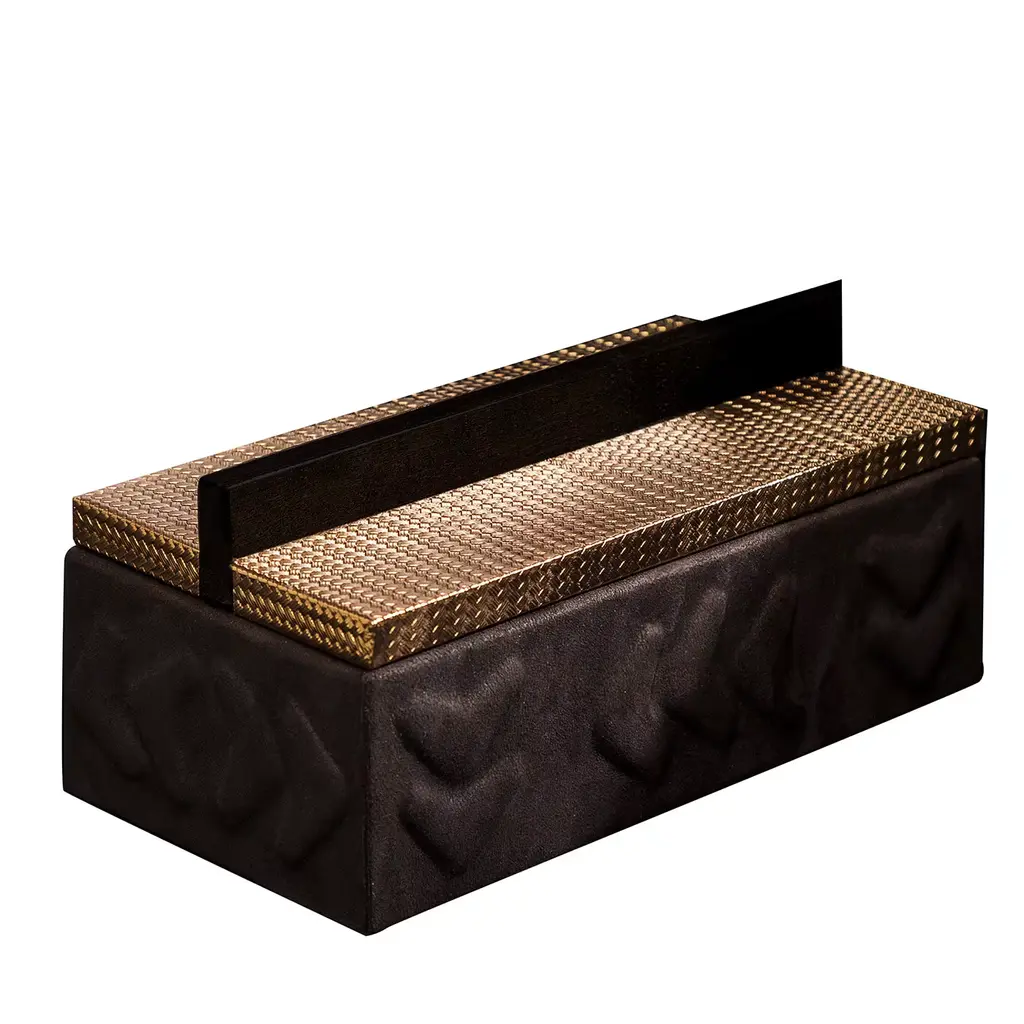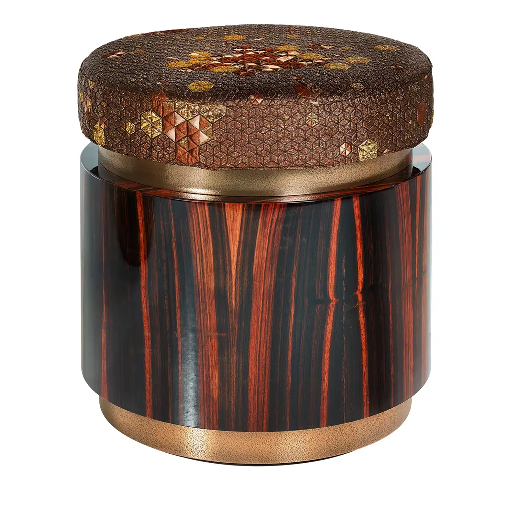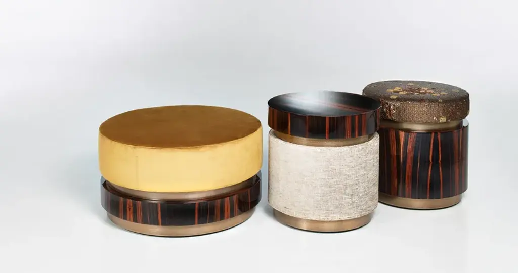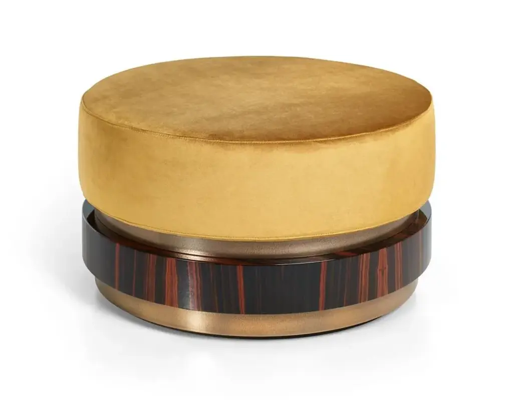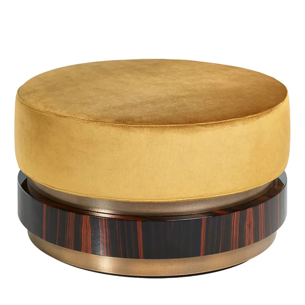 Ring is a pouf with ebony veneer or lacquered finish. Top in polyurethane upholstered in fabric or leather. Base and decorative bands with coated finish.