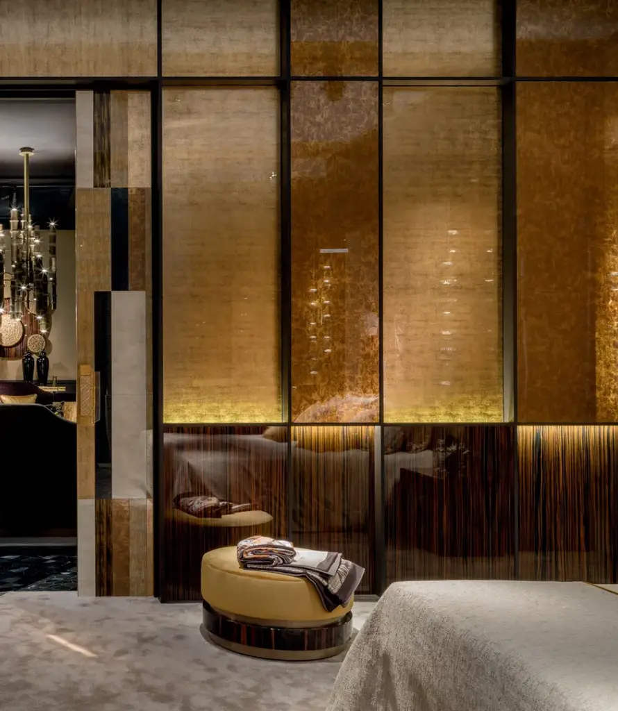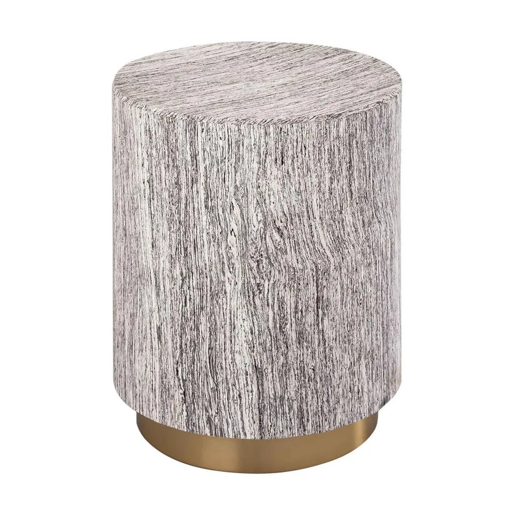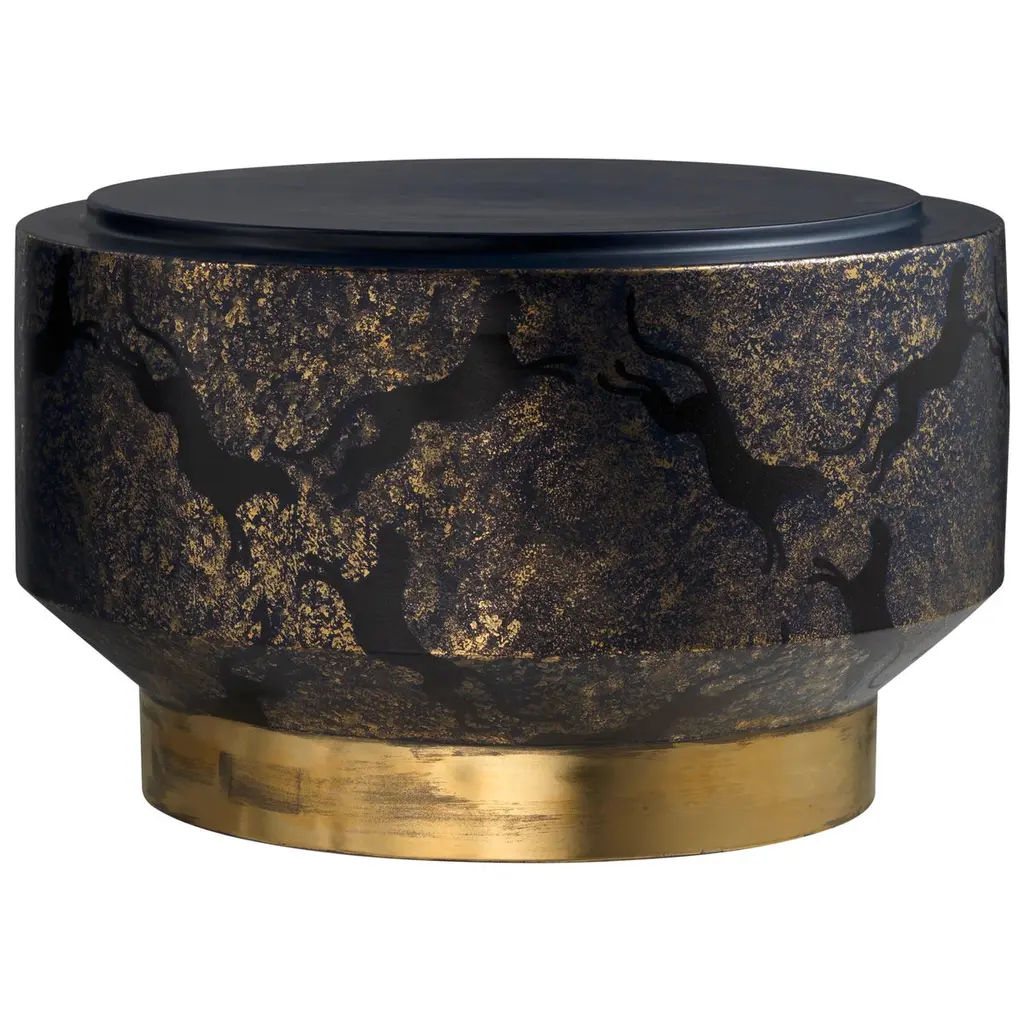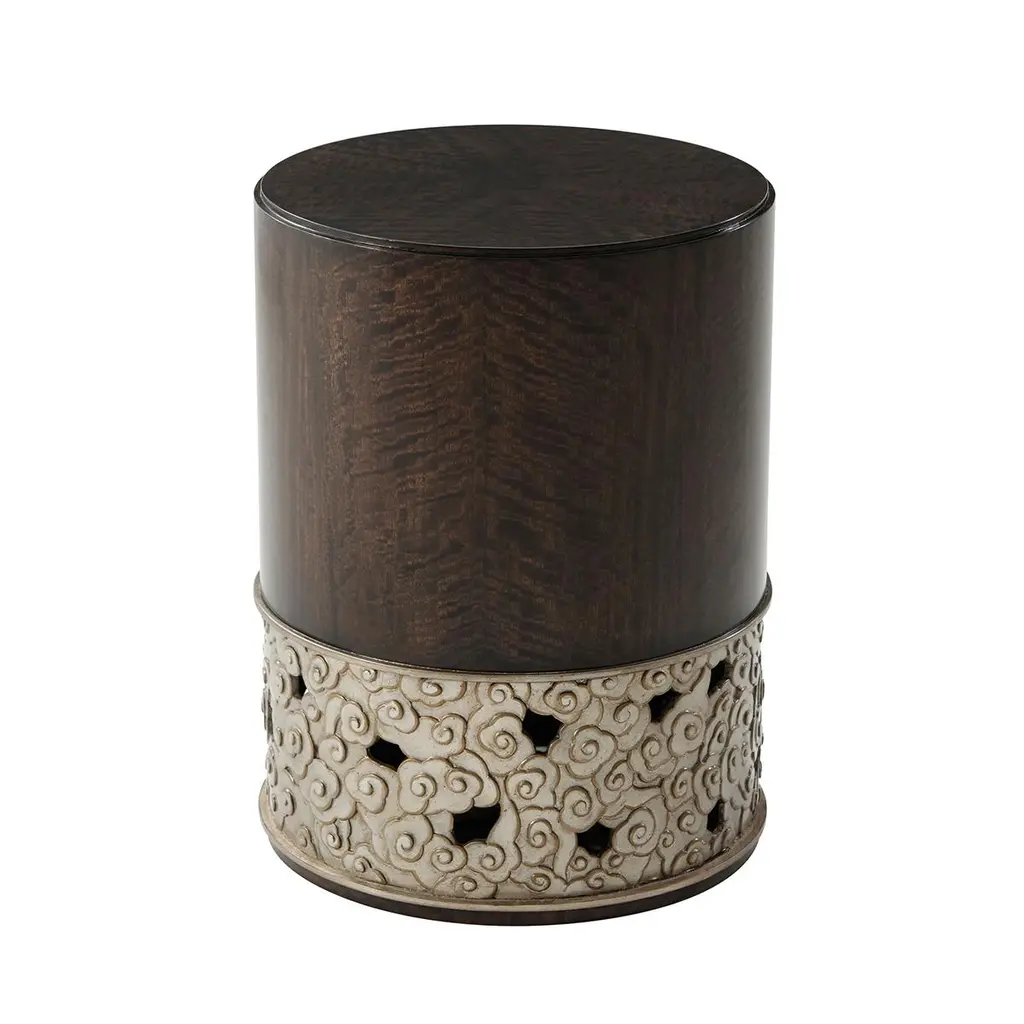 Ring is a pouf with ebony veneer or lacquered finish. Top in polyurethane upholstered in fabric or leather. Base and decorative bands with coated finish.