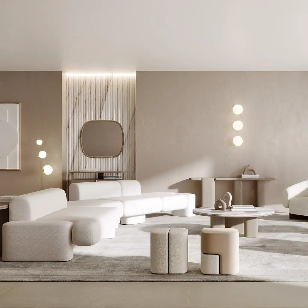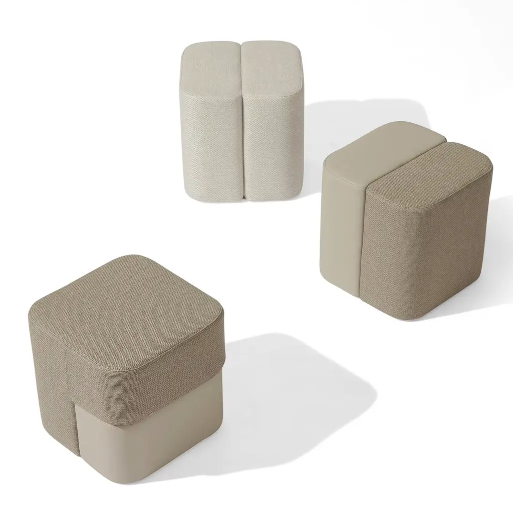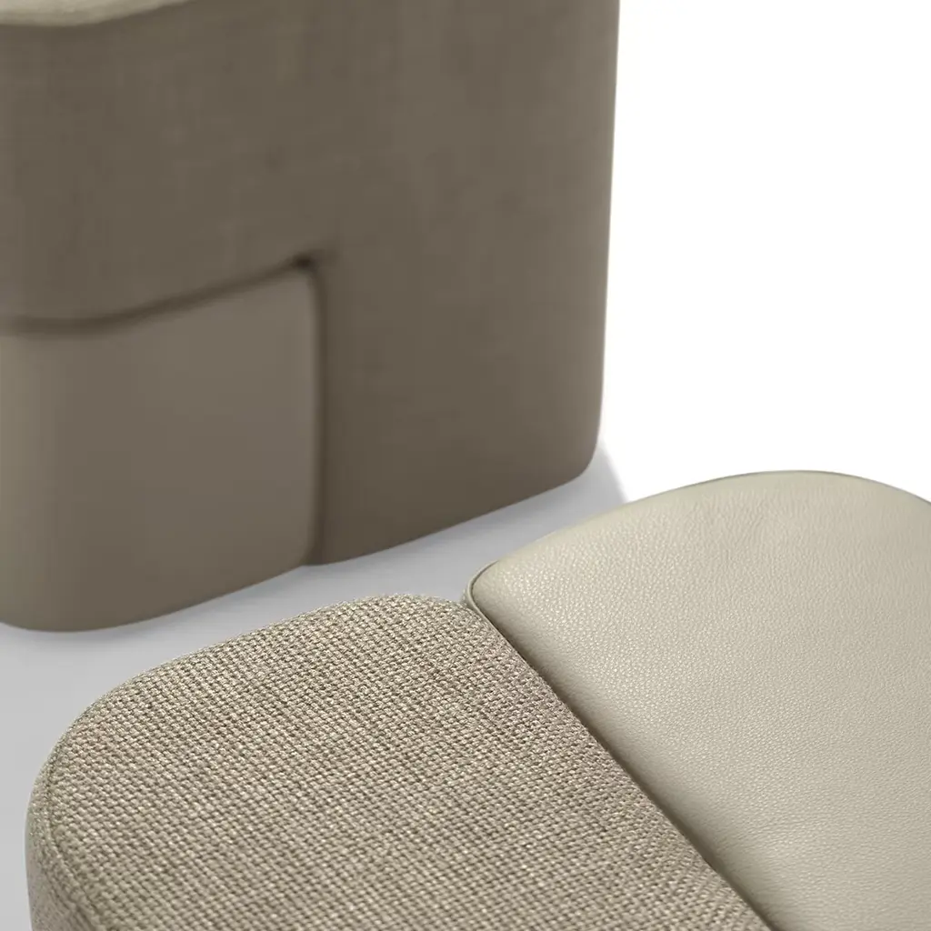 This pretty pouf is completely upholstered and the peculiarity lies in the possibility of mixing and matching different types of fabrics and colors. Its shape recalls a Tetris composition. The upholstery is Leather and Fabric Dove gray color. Other fabrics and leathers are available.