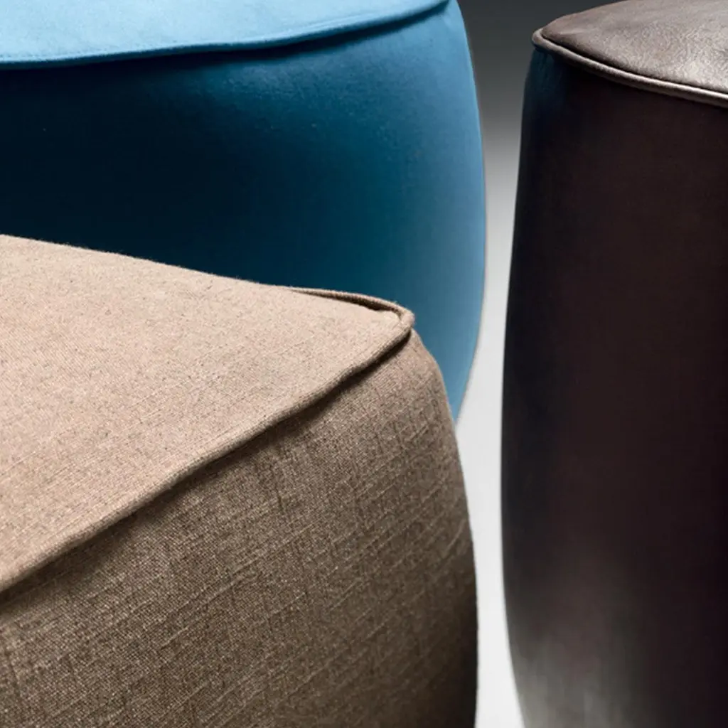 This pouf has a minimal enhanced by high-quality materials. It features a structure in poplar wood, padded of high-resistance and multi-density polyurethane and memory foam. Upholstered in non-removable brown leather, the top is filled with 100% European goose feathers for utmost comfort. Contract and commercial certifications available upon request.