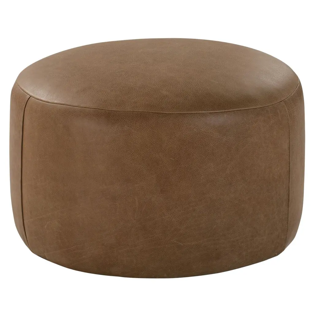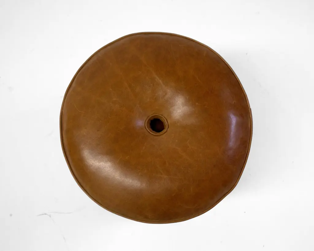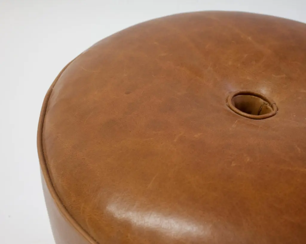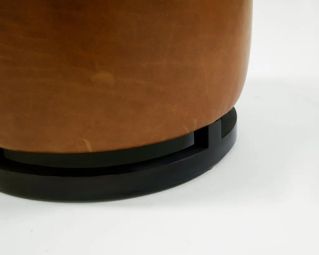 Round Leather Pouf On Dark Mahogany Base With Circular Detail At Seat