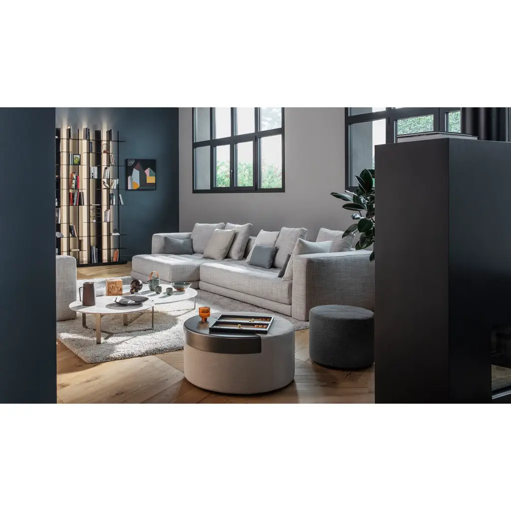 Introducing the Flou Moon Round Padded Table Pouf, a luxurious addition to any room. With its eye-catching asymmetrical stitching and variety of diameters and fabrics, this pouf is both functional and stylish. Accessorize with detachable trays for a stable surface, or use the cleverly-designed metal tray for added versatility. The perfect blend of form and function, this pouf is a must-have for any sophisticated space.