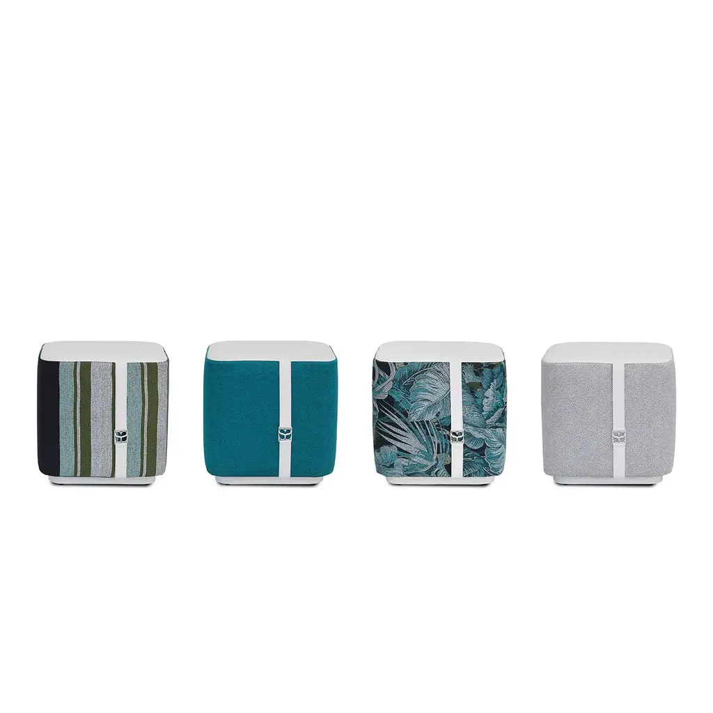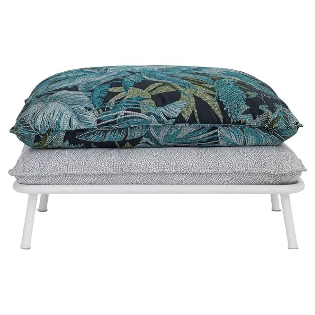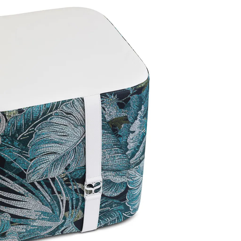 Enjoy some unwinding fresh air comfortably resting in an outdoor patio or garden furnished with this extraordinary pouf from the Salina series, available in a variety of elegant finishes. Resting on a marine plywood base, it is resistant to humidity and salinity. Padded with polyurethane foam, it is upholstered with waterproof cotton fabric and enriched with a decorative belt in white leather suitable for outdoors. Please consult the Artemest catalog for available finishes.
