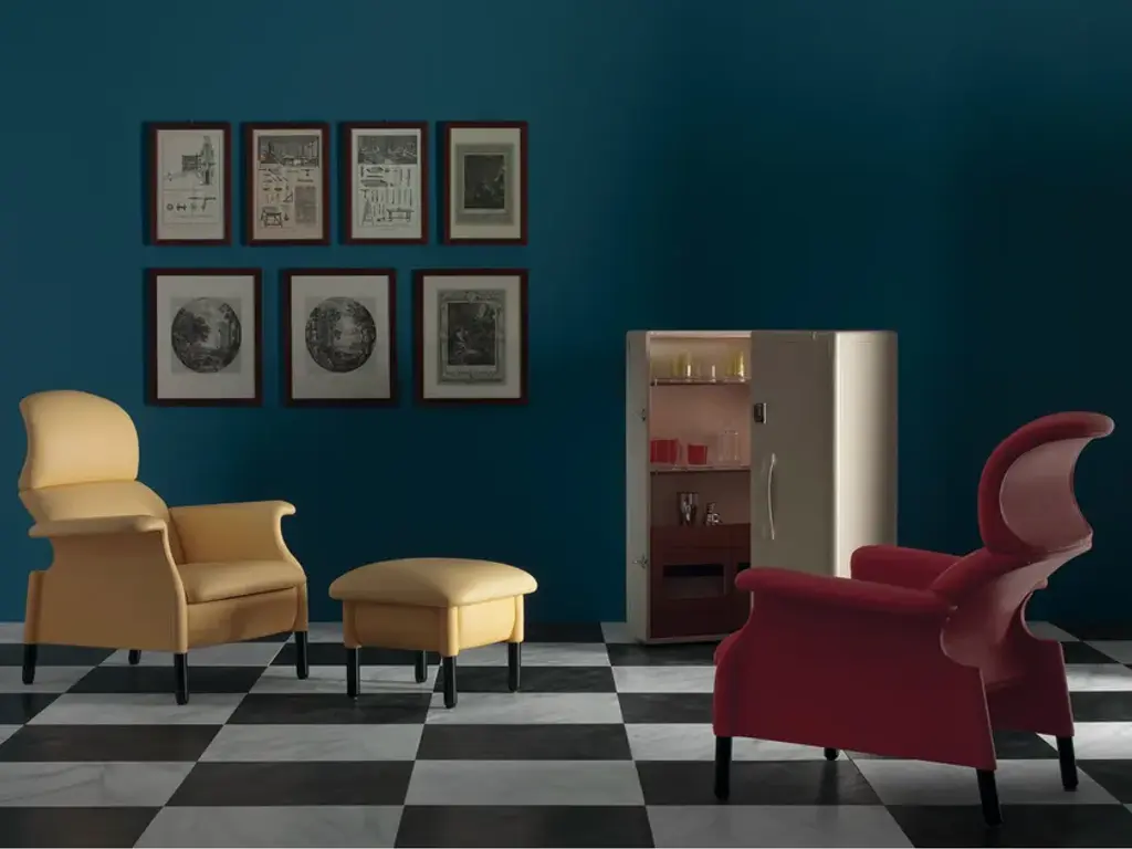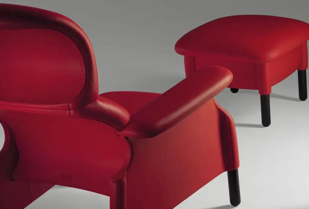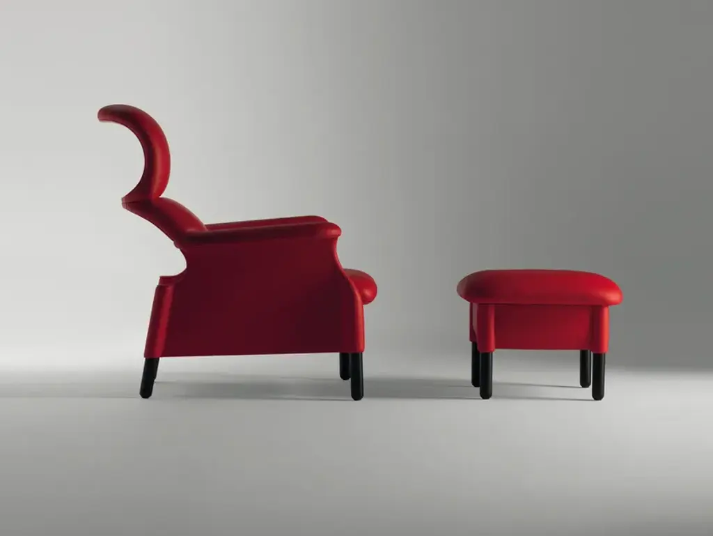 Inspired by Achille and Piergiacomo Castiglioni’s idea of removing traditional padding to leave only the “strictly necessary” curves for optimum support, the Sanluca armchair is an extraordinary example of Italian design at its very zenith. Ergonomic and still cutting-edge today, Sanluca has an extremely comfortable double profile, of great formal power, that seems to perfectly envelop the body. The Sanluca armchair can be complemented with the Luca pouf designed by Achille Castiglioni in 1991.The rigid structure, a series of elements in birch plywood and solid beech and poplar, is formed of separate components that are subsequently assembled. Semi-glossy black-lacquered beechwood feet. The upholstery of the Sanluca armchair and Luca pouf is in Pelle Frau® leather, also two-tone.