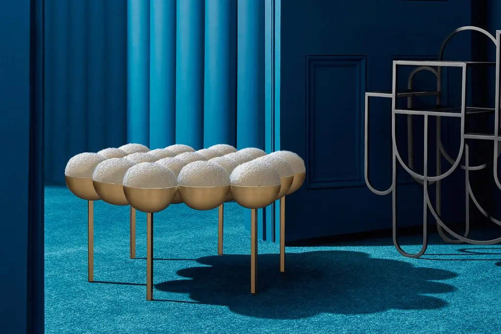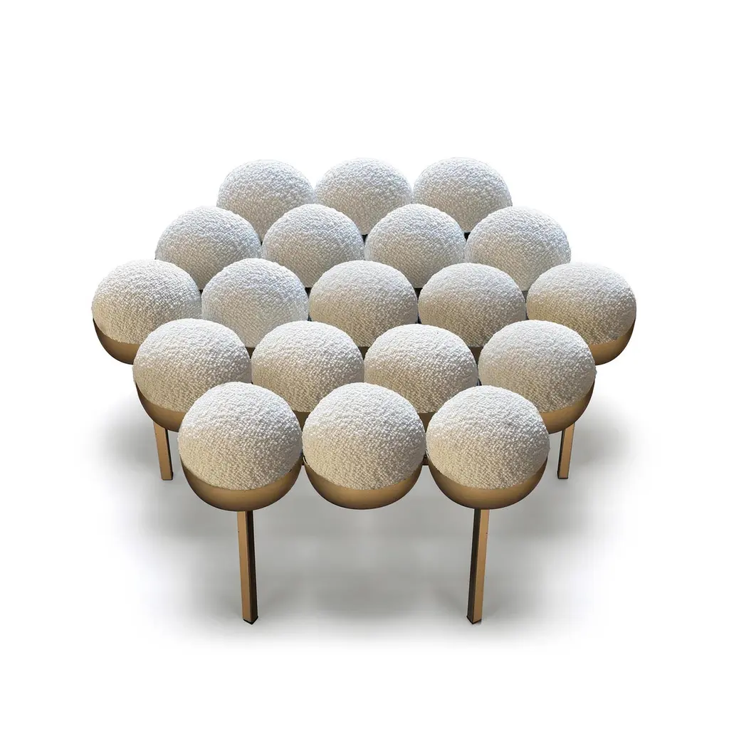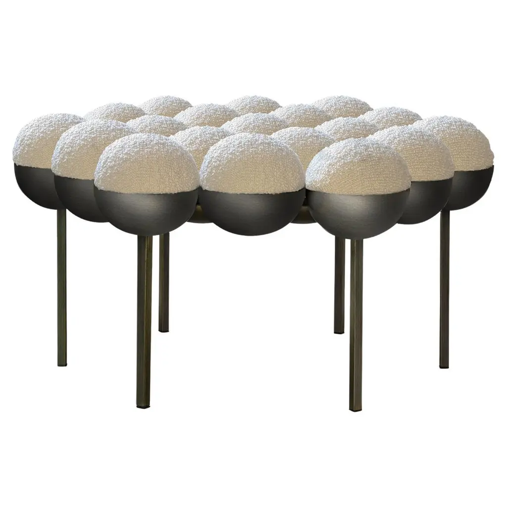 Saturn Pouffe Large, Ottoman, Modern, Sculptural, Brass Frame And Cream Boucle