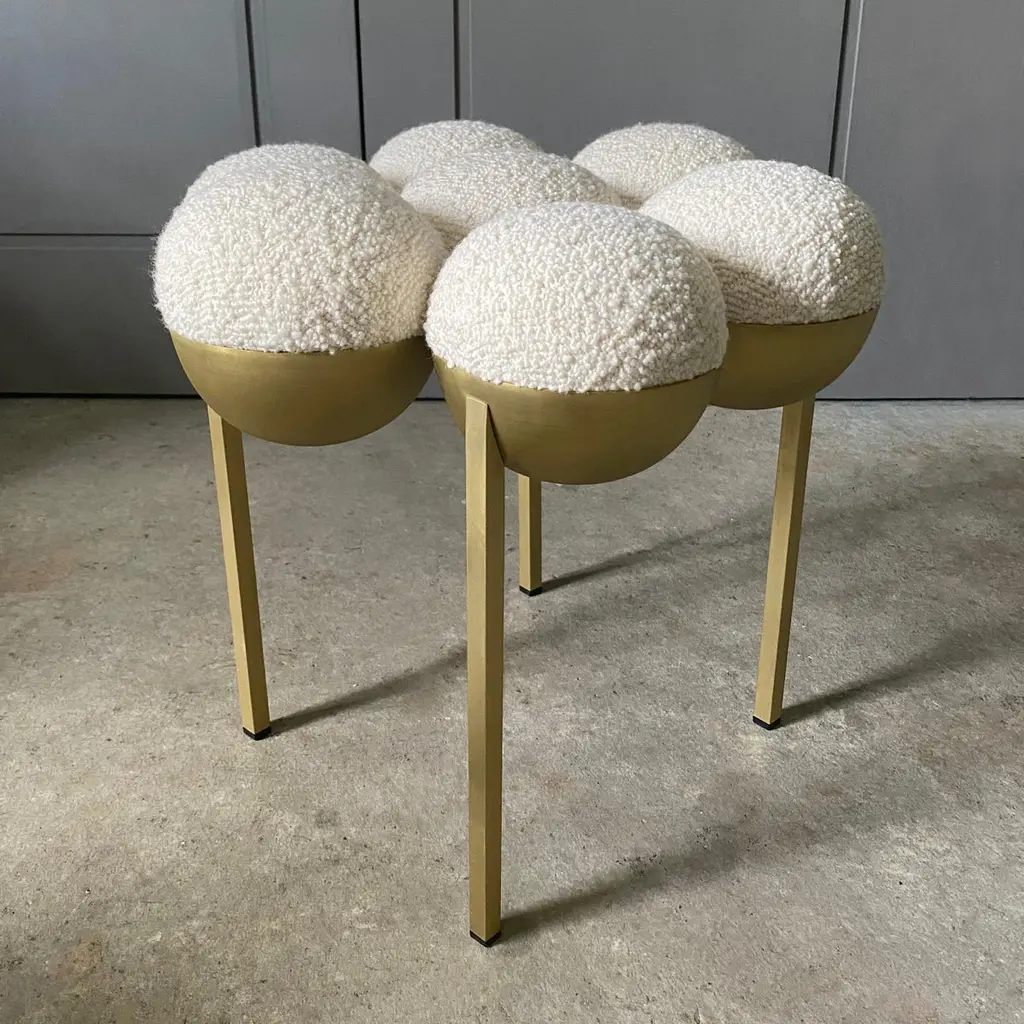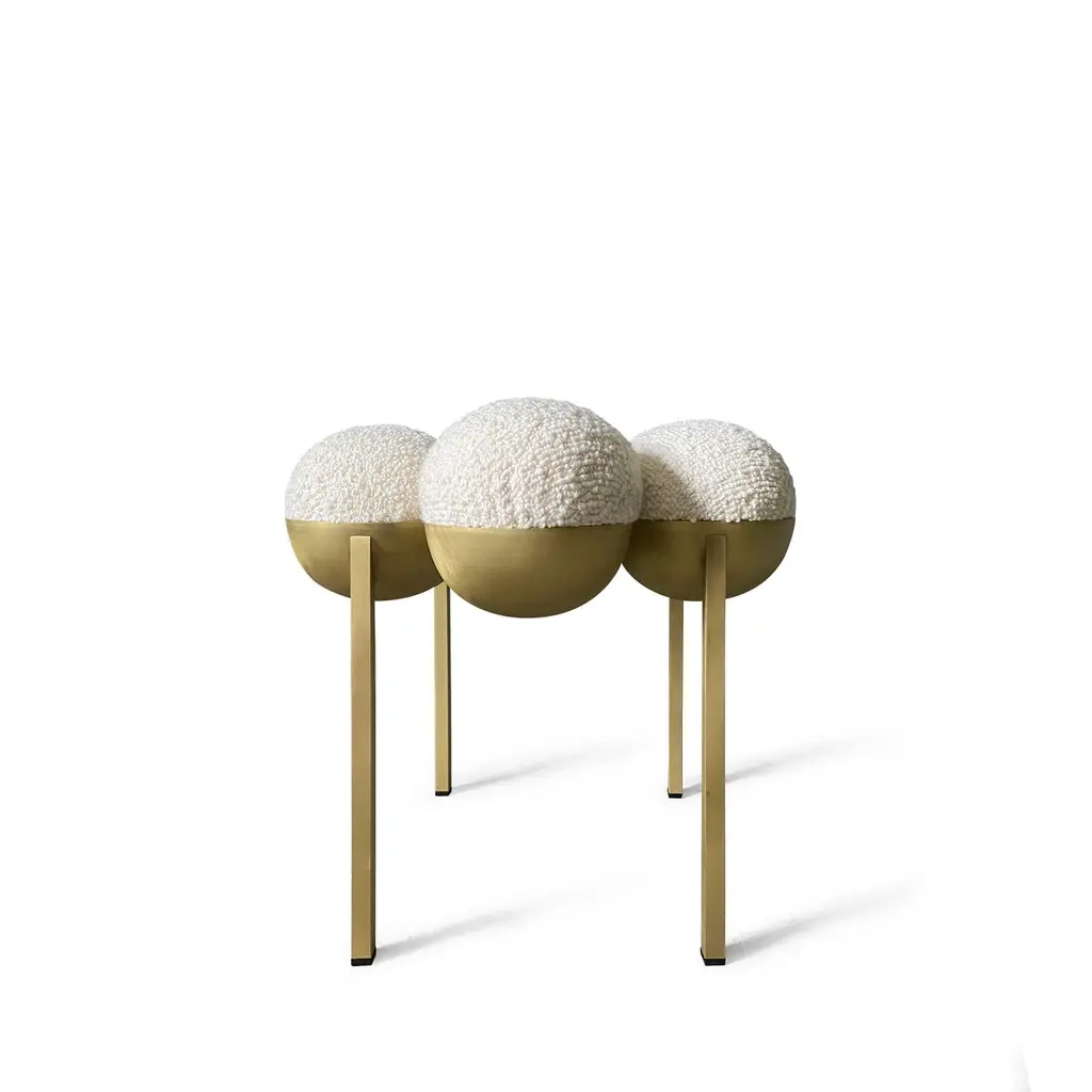 The Saturn pouffe utilises gathered bilboquet seat construction, to create a more simplified but still incredibly distinctive form. The The Saturn pouffe utilises gathered bilboquet seat construction, to create a more simplified but still incredibly distinctive form. The sumptuously undulating seat instantly appeals with its invitingly upholstered comfort, while the graceful supporting metalwork establishes the sense of floating and airiness.The Saturn Pouffe is available in sizes small (diameter 445 x height 400mm) and large (diameter 740 x height 400 mm)The chair is made in brushed brass and wool fabric. Please note that even though brass is protected by clear varnish, it may still oxidise over the years which is a natural ageing process. The chair is made by hand so slight imperfections are part of its charm.Each piece of furniture is individually numbered and comes with a signed "Certificate of Authenticity" to prove that it is Bohinc Studio original.Material: brushed brass, a bouclé wool and viscose Dedar fabricDimensions: diameter 445 x height 400mmMade by hand in Portugal.