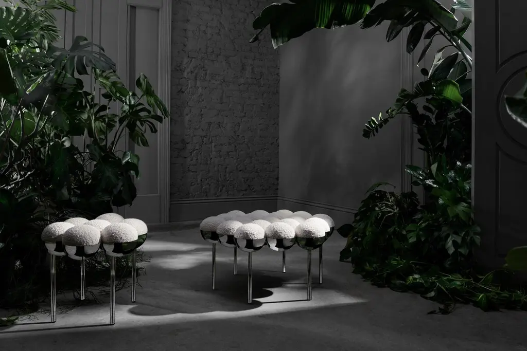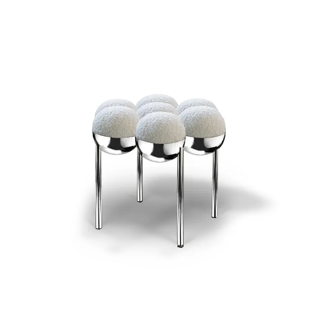 Saturn Pouffe Small, Ottoman, Modern, Sculptural, Chrome Frame And Ivory Boucle