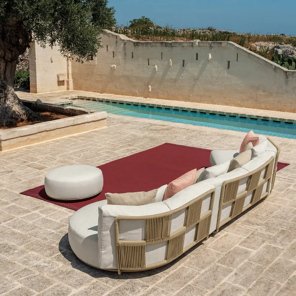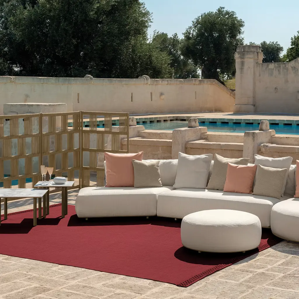 Creating an elegant contrast in a colorful contemporary outdoor setting thanks to a timeless total-white look, this round pouf is a stunning design by Ludovica and Roberto Palomba. The round base is fashioned of beige-lacquered aluminum, while the cover is fashioned of fabric. Please inquire with the Concierge for customization details.