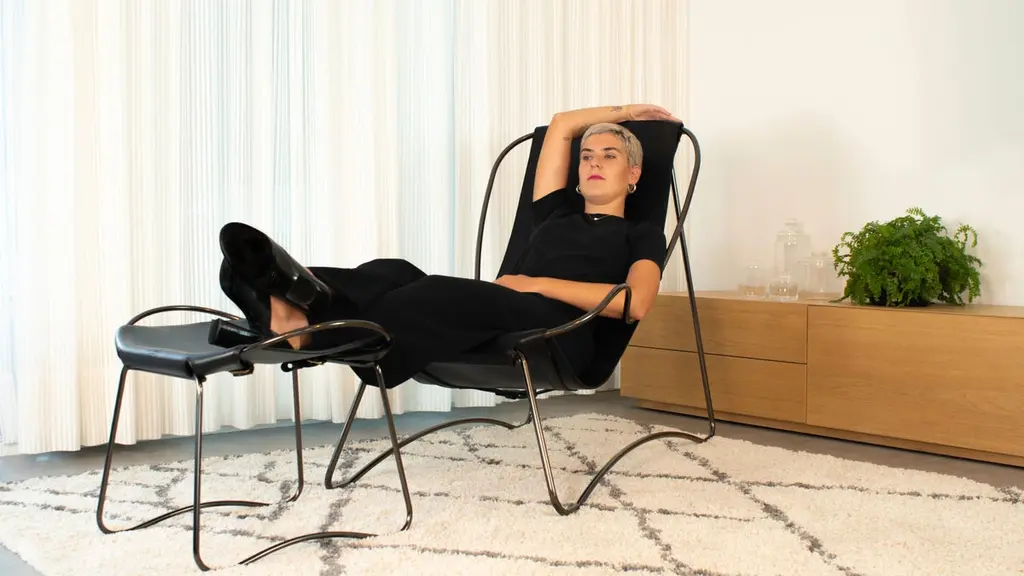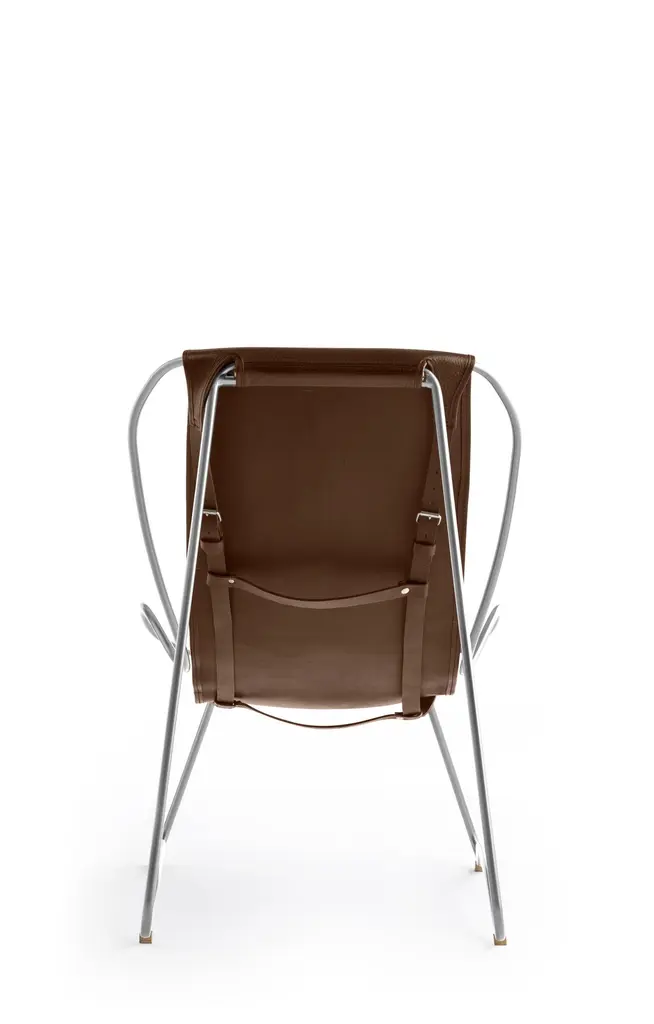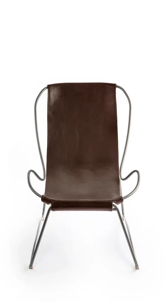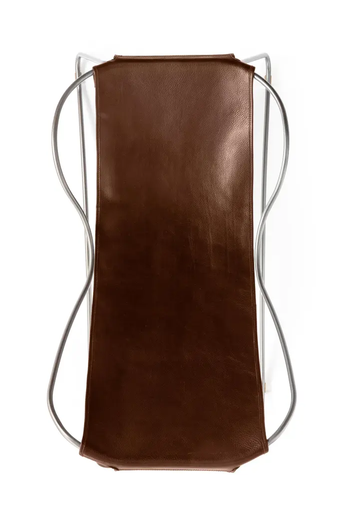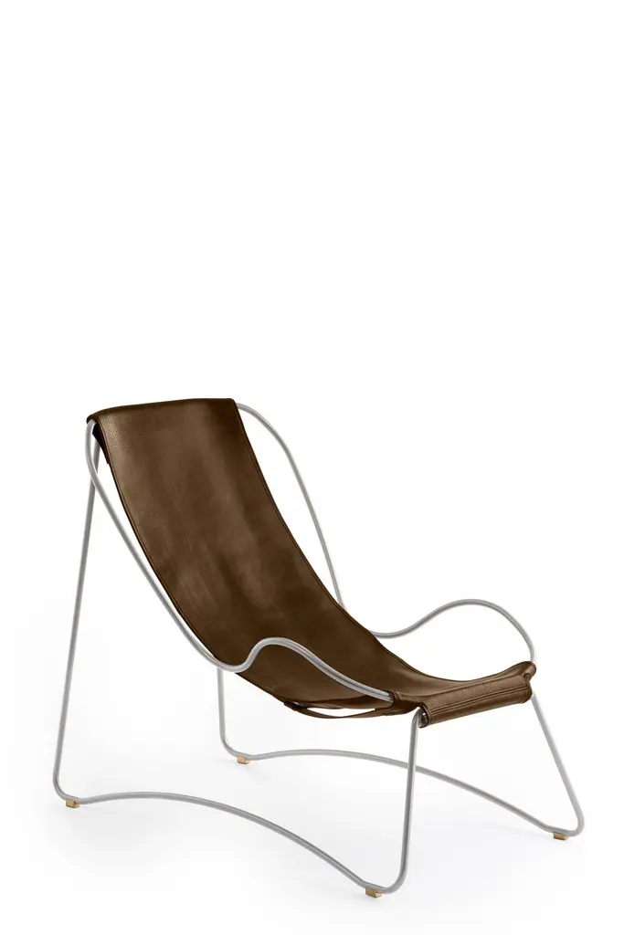 The Hug contemporary chaise longue and ottoman is designed and conceived with a light aesthetic, the slight oscillation of the steel rod of 16 / 12 mm is complemented by the flexibility of the double 3.5 mm thick leather. When sitting in this furniture you feel an enveloping sensation, like being hugged, since the weight of the body is distributed evenly. Each unit becomes a refuge of visual and ergonomic wellbeing.Our Hug Collection is inspired by the organic lines of a landscape, the curves of nature, and the imaginary silhouette of the wind inspire this collection of organic forms, almost like metallic sculptures. All pieces are done with cold bended steel rods, polished, nickel plated, colored by electrolysis, and lacquered. The process of polishing and lacquering the steel, goes through a manual and delicate chroming process, which gives its final and unique metal color finish. This precise technique gives a uniform metallic finish of minimum 50 microns over the entire Surface. Our metal finishing has successfully passed a corrosion resistance test in a salt spray chamber according to UNE-EN ISO 9227: 2017 and UNE-EN ISO 1456: 2010. Our signature screws are made with brass turning lathed, polished, and lacquered, these are the pieces that fix the saddle leather to the metal frame.Leathers are Spanish hides vegetable tanned. We use premium saddles in multiple colors to adjust to your taste and interior needs. This traditional vegetable dying and tanning method is an organic technique that relies on natural tannings from bark or plant tissues. The use of oils and natural fats give the leather a distinctive flexibility and texture, allowing it to be molded, retain its shape and age graciously.All skins are carefully selected from food industry, with a minimum thickness of 3.5 mm / 0,02 in, using the part of the animal's shoulder, which allows for larger pieces and uniformity, even though signature wrinkle from the animal’s neck may be recognizable. The vegetable tanning is a traditional and artisan treatment, which is respectful to the environment. Even with careful selection natural marks as a result of the contact with other animals, the age, origin and characteristics of the skin, or even the season in which the tanning takes place cannot be avoided. We still believe that these factors only add authenticity and uniqueness to every piece. Our leather parts are made with double saddles, always showing the top side of the hides that presents the better quality.Customization options.With the aim of creating customized pieces, clients can select from the various metal finishes, and leather colors to create pieces that complement their home décor. Leather colors available, black, navy, dark brown, cognac and natural tobacco, and steel polished finishing available, aged brass, black smoke and aged silver.Normally we use tone on tone threats for stitches, but client can select a contrast option, being possible to select any color to make a unique piece for the project it belongs. The finish on the edges of our leather components are sanded and hand painted. We have the option of select an alternative color if not tone on tone will be applied.Please consult in case you are interested on having a particular heat embossing stamp on the leather with your own branding.Our collections are made to full fill home spaces where to gather and enjoy great conversation with families and friends. Occasional furniture for exquisite homes, from cottages to exclusive resorts. Our product is understood as a sculptural piece of design, as an art object to be displayed at different house spaces as library, bar, living, foyer, bedroom, powder, meeting, grand or great room.The different finishes options make the furniture perfect combinations on diverse styles, from rustic mountain home, a small cottage, a ski lodge retreat, or industrial a minimalist look.