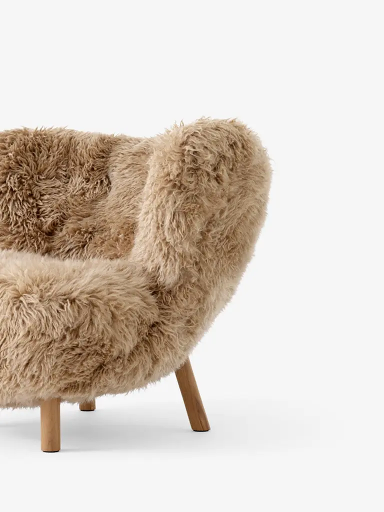 Initially introduced back in 1938, Little Petra won instant praise at the Copenhagen Cabinetmakers Guild Exhibition, subsequently winning awards at exhibits in New York and Berlin. It’s one of just a few designs by architect Viggo Boesen, who became associated with Denmark’s signature design aesthetic in the 1930s called funkis style. Little Petra is surprisingly petite, able to fit into all kinds of spaces, interiors and environments.Low to the ground, open and embracing, it embodies the essence of a lounge chair, allowing for all kinds of seating positions in any cozy setting imaginable.DimensionsH: 75cm/29.5in, D: 83cm/32.7in, L: 81cm/31.9inSeat height: 40cm /15.7in, Seating d: 55cm/21.6inPouf ATD1 : Soft and nurturing, the Pouf is an ideal companion. With rounded legs in either oak walnut, and upholstery in a wide variety of fabrics that include sheepskin, it lends an organic warmth to any interior. Pair with the Little Petra for an elegant lounge seating arrangement.DimensionsH: 37cm / 14.6in, W: 53cm / 20.9in, D: 53cm / 20.9inMaterial: Sheepskin 50mm, Honey & Oiled Oak.