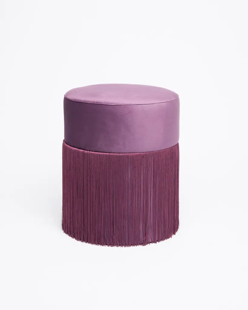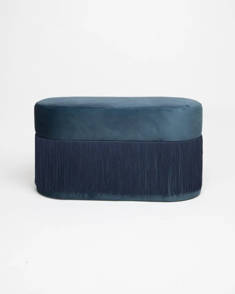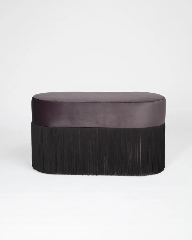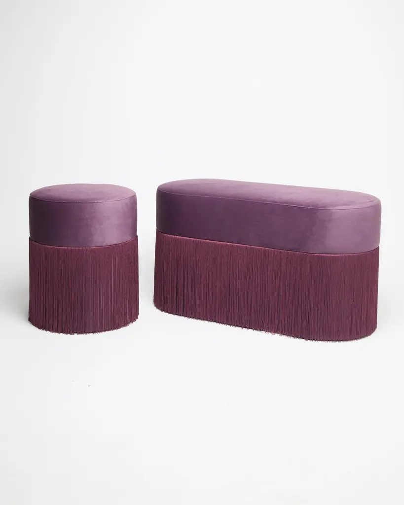 Set of 2 Pouf Pill L and S Contemporary Sculptural Pouf with Velvet and Fringes by HoutiqueDimensions: H 45 x 80 x 35 cmH 45 x 35 x 35 cmMaterials: Velvet upholstery and 30cm fringesArt-Deco style pouf with wood structure and velvet fabric.2 fiber-board discs of 16mm, joined by wooden tufts.Upholstery Velvet 100% polyester with backing. 345 gr/m. 50000 Martindale cycles.TEAD foam with fibre-covered.Designed by Houtique. Made in Spain.All of our products are original designs.We only use high quality raw materials.All components follow international safety standards.2 years warranty in production failures.HoutiqueExotic rhythms, champagne toasts and velvet words. We were dancing when we found a sign that said "back to the future" and so we followed it. The sign took us here, to a sexy, luxe and fun dimension.We keep on dancing, we won't stop.