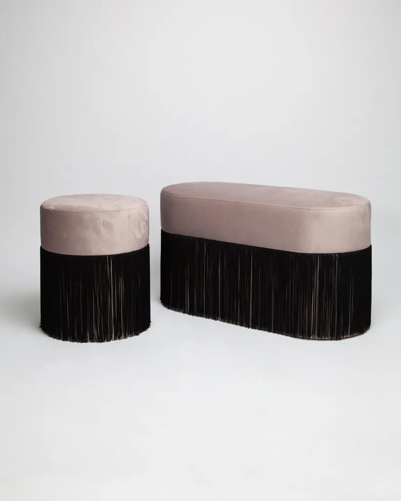 Set of 2 Pouf Pill L and S Contemporary Sculptural Pouf with Velvet and Fringes by HoutiqueDimensions: H 45 x 80 x 35 cmH 45 x 35 x 35 cmMaterials: Velvet upholstery and 30cm fringesArt-Deco style pouf with wood structure and velvet fabric.2 fiber-board discs of 16mm, joined by wooden tufts.Upholstery Velvet 100% polyester with backing. 345 gr/m. 50000 Martindale cycles.TEAD foam with fibre-covered.Designed by Houtique. Made in Spain.All of our products are original designs.We only use high quality raw materials.All components follow international safety standards.2 years warranty in production failures.HoutiqueExotic rhythms, champagne toasts and velvet words. We were dancing when we found a sign that said "back to the future" and so we followed it. The sign took us here, to a sexy, luxe and fun dimension.We keep on dancing, we won't stop.