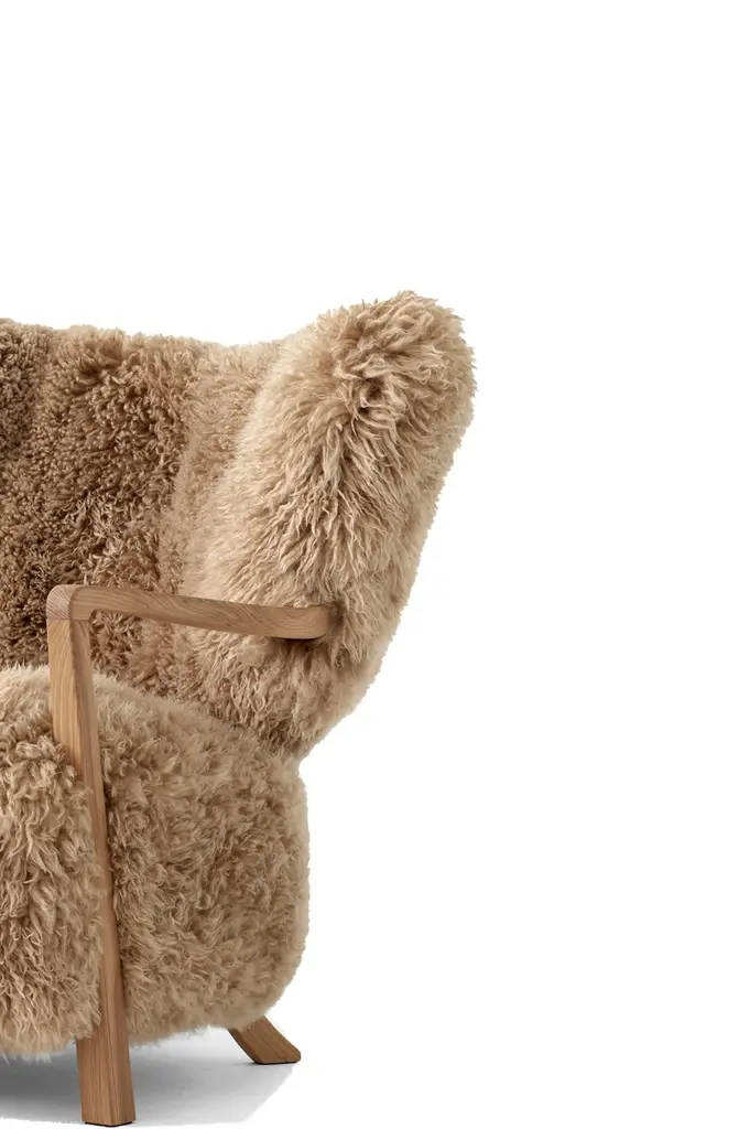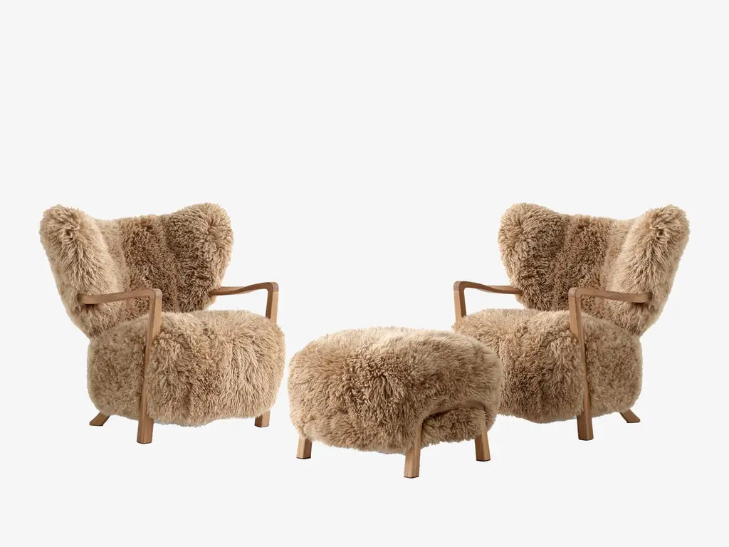 Introducing Wulff, a lounge chair whose upholstered form pays tribute to the hand-crafted designs of the 1930s. Wulff promises superior craftsmanship and outstanding comfort with luxuriantly soft upholstery that covers its seat and backrest. Intended as a lounge chair for the living room or bedroom, its architectural shape will add a stylish statement to any interior.Material: Sheepskin 50mm, honey & oiled oak.DimensionsH: 85 cm / 34 in, W: 85 cm / 34 in, D: 84 cm / 33.6inSeat height: 41 cm /16.4 inArmrest height: 59cm / 23.2 inWulff Pouf Based on the signature aesthetics of the sculptural Wulff lounge chair, the Wulff pouf is handcrafted with solid oak or walnut legs and is available in the same stylish upholstery as its namesake. Whether you use it as a footrest for the Wulff chair or as a quaint lounge stool on its own – the ultimate goal is relaxation.DimensionsH: 39 cm / 15.3 inW: 58 cm / 22.8 inD: 53 cm / 20.8 inSeat Height: 39 cm / 15.3 inWeight6.7 kg
