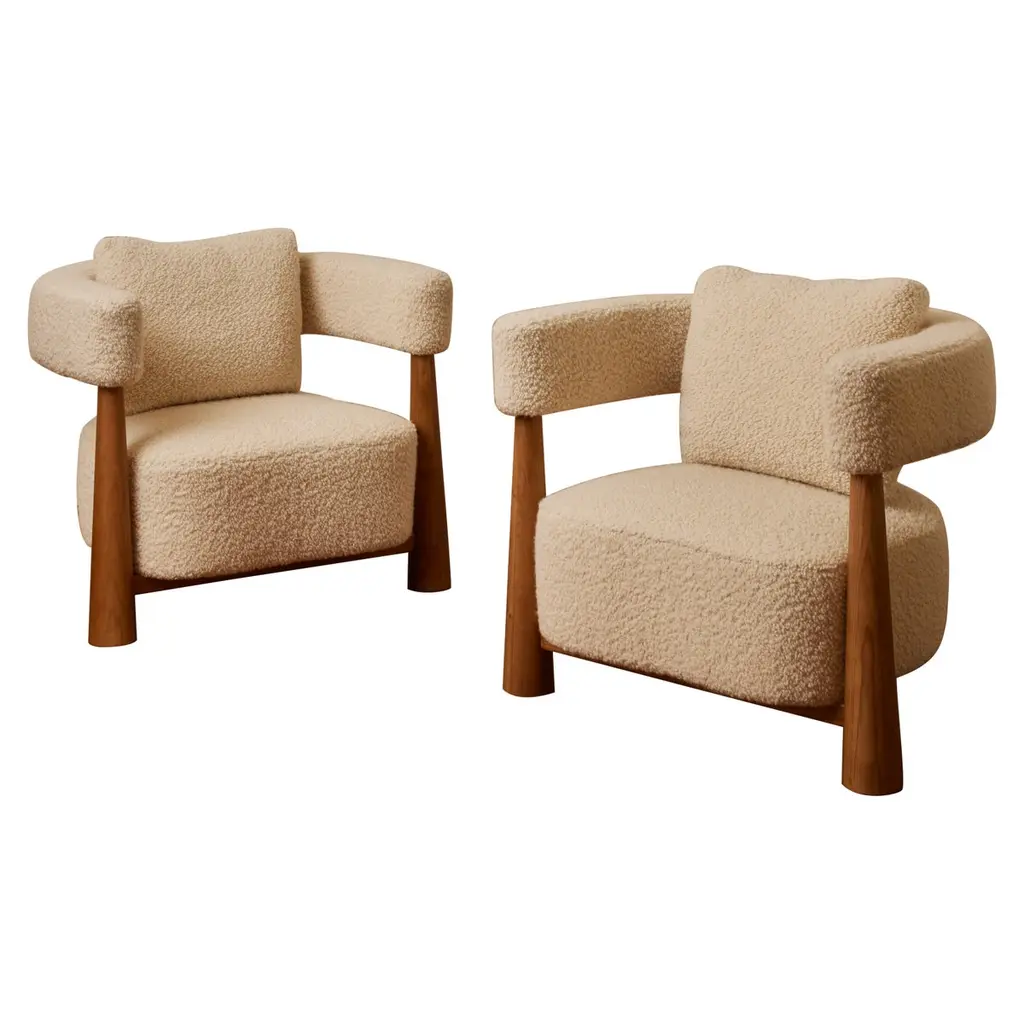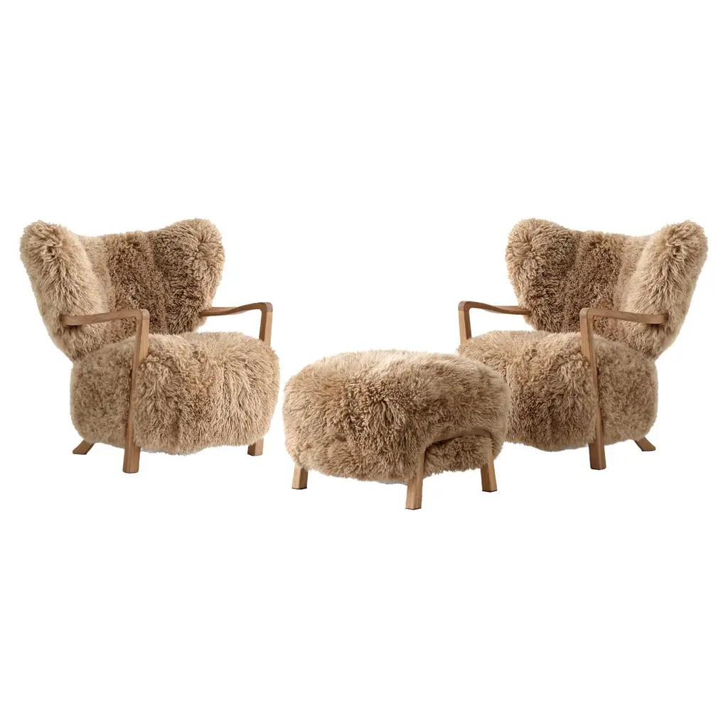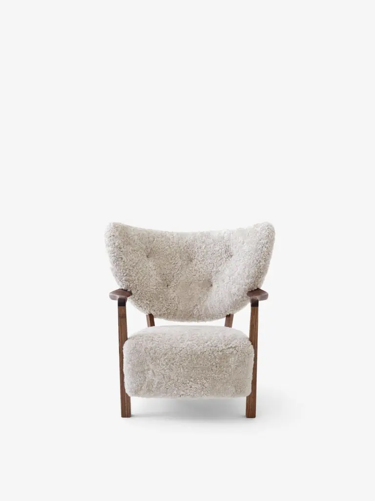 Introducing Wulff, a lounge chair whose upholstered form pays tribute to the hand-crafted designs of the 1930's. First produced in a traditional Danish workshop in the first half of the 20th century by Cabinetmaker Jørgen Wolff, the Wulff lounge chair is a striking example of the ‘Danish Modern’ design movement. The intricacies of hand-made, small-scale production are readily apparent in its form: the boundary-pushing sculptural armrests, which join to an expansive, wing-shaped backrest, are underpinned by the finest craftsmanship. Reissued by &Tradition for modern audiences, the chair's timeless architectural shape adds a stylish statement to any interior.Wulff promises superior craftsmanship and outstanding comfort with luxuriantly soft upholstery that covers its seat and backrest. Intended as a lounge chair for the living room or bedroom, its architectural shape will add a stylish statement to any interior.Pouf: Based on the signature aesthetics of the sculptural Wulff lounge chair, the Wulff pouf is handcrafted with solid walnut legs. Whether you use it as a footrest for the Wulff chair or as a quaint lounge stool on its own – the ultimate goal is relaxation.Material: Sheepskin 17mm, moonlight & oiled walnut.Chair DimensionsH: 85 cm / 34 in, W: 85 cm / 34 in, D: 84 cm / 33.6inSeat height: 41 cm /16.4 inArmrest height: 59cm / 23.2 inWeight: 15 kgPouf Dimension:H: 39cm/ 15.3in, W: 58cm/ 22.8in, D: 53cm/ 20.8inSeat Height: 39cm/ 15.3inWeight: 6.7kgProduction Process:The frame is made from solid beech and plywood and subsequently covered in HR foam and polyester wadding. The solid wood legs are turned and CNC milled.