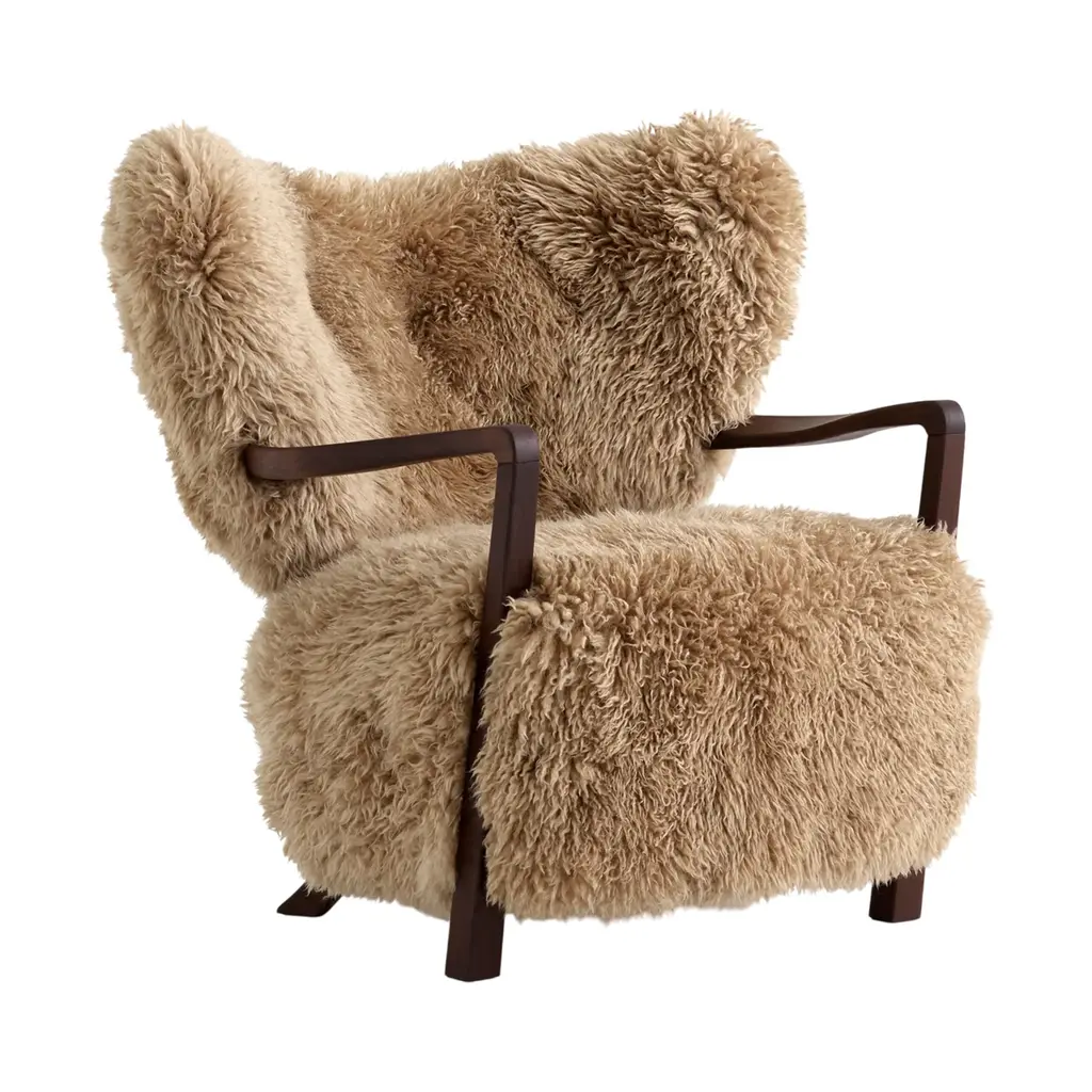Introducing Wulff, a lounge chair whose upholstered form pays tribute to the hand-crafted designs of the 1930s. Wulff promises superior craftsmanship and outstanding comfort with luxuriantly soft upholstery that covers its seat and backrest. Intended as a lounge chair for the living room or bedroom, its architectural shape will add a stylish statement to any interior.Material: Sheepskin 50mm, honey & oiled oak.DimensionsH: 85 cm / 34 in, W: 85 cm / 34 in, D: 84 cm / 33.6inSeat height: 41 cm /16.4 inArmrest height: 59cm / 23.2 inWulff Pouf Based on the signature aesthetics of the sculptural Wulff lounge chair, the Wulff pouf is handcrafted with solid oak or walnut legs and is available in the same stylish upholstery as its namesake. Whether you use it as a footrest for the Wulff chair or as a quaint lounge stool on its own – the ultimate goal is relaxation.DimensionsH: 39 cm / 15.3 inW: 58 cm / 22.8 inD: 53 cm / 20.8 inSeat Height: 39 cm / 15.3 inWeight6.7 kg