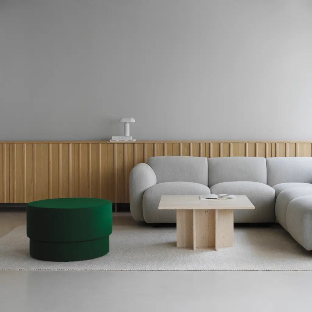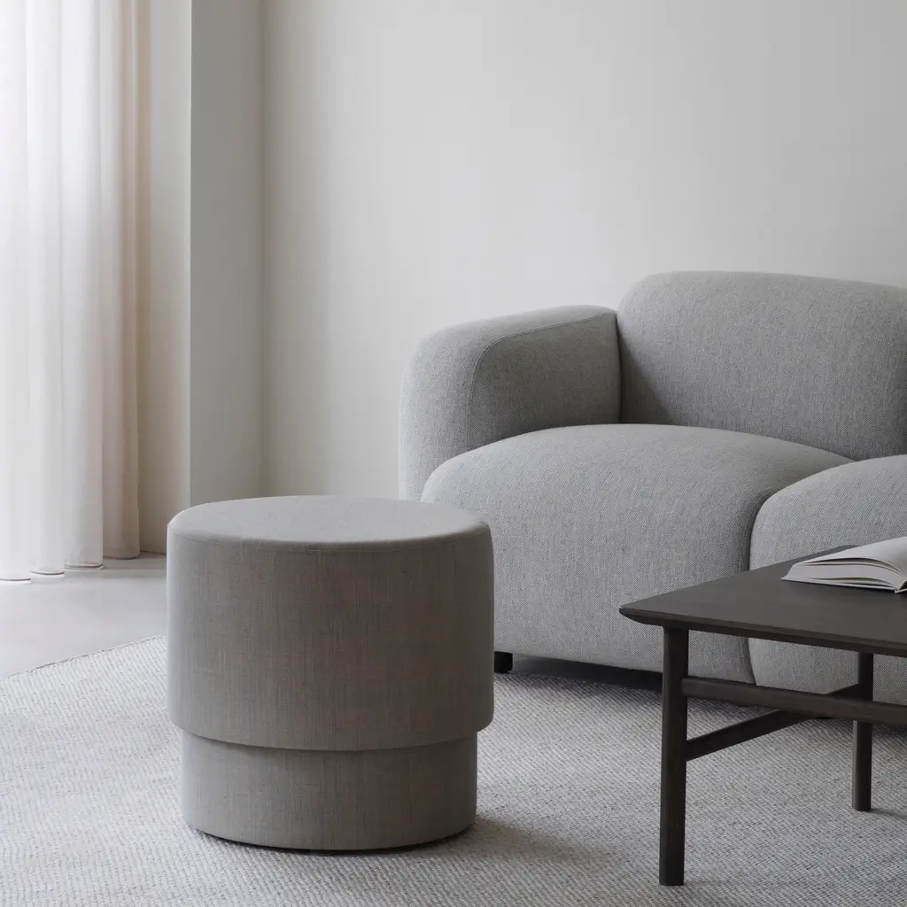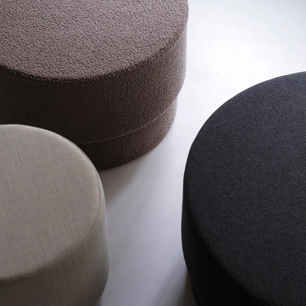 Luxurious woven-textile upholstery elevates Silo, a pouf with a tiered cylindrical shape. Available in 3 sizes in a trio of colorways each the piece has a soft but firm surface created with underlying foam padding over a plywood structure for stability and a sharply defined shape. Silo can serve as a coffee table or act as a footrest or extra seating in the living room, dressing room or bedroom.