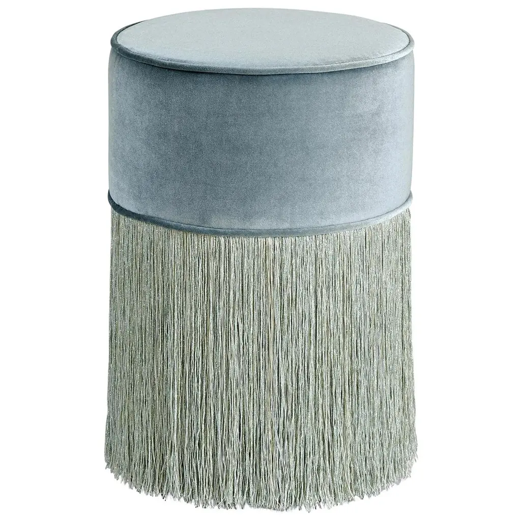 A striking, original design with a retro flair that evokes the magic atmosphere of the roaring 20s, this pouf will add a haute-couture touch to any interior. Showcasing a simple round frame of solid beechwood, the padded cushion seat is upholstered in soft velvet, whose delicate shade of lilac contrasts with the vibrant and glamorous, cascading fringe of gold lurex threads. This piece from the Sparkle Collection can be displayed with others in complementing color combinations to create a striking look in any home.