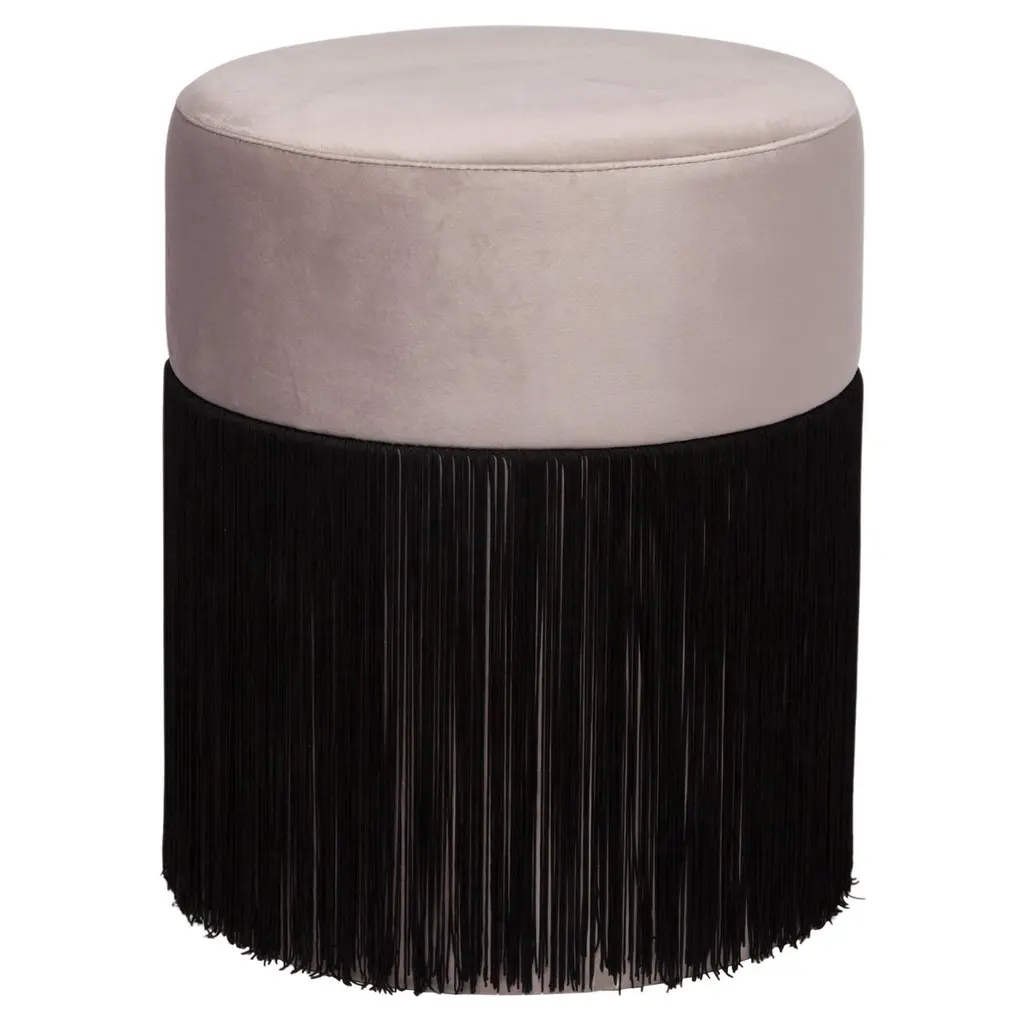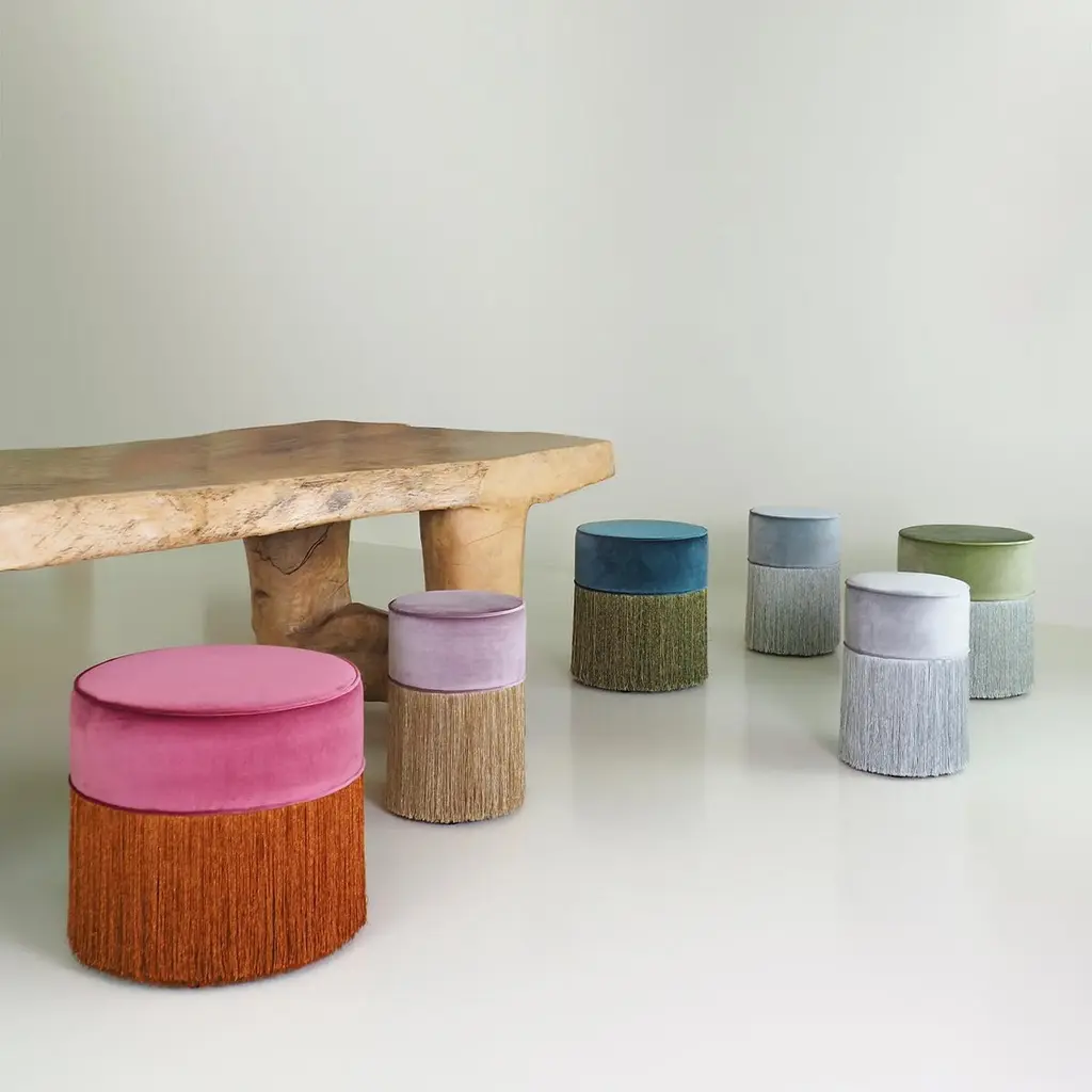 Inspired by Art Deco style, this glamorous pouf boasts a shimmering look with its silver velvet upholstered seat and matching lurex fringe. A chic addition to a living room dominated by a cool chromatic palette, this original piece belongs to the Sparkle Collection of poufs characterized by an elegant retro flair and crafted with attention to detail using high-quality materials.