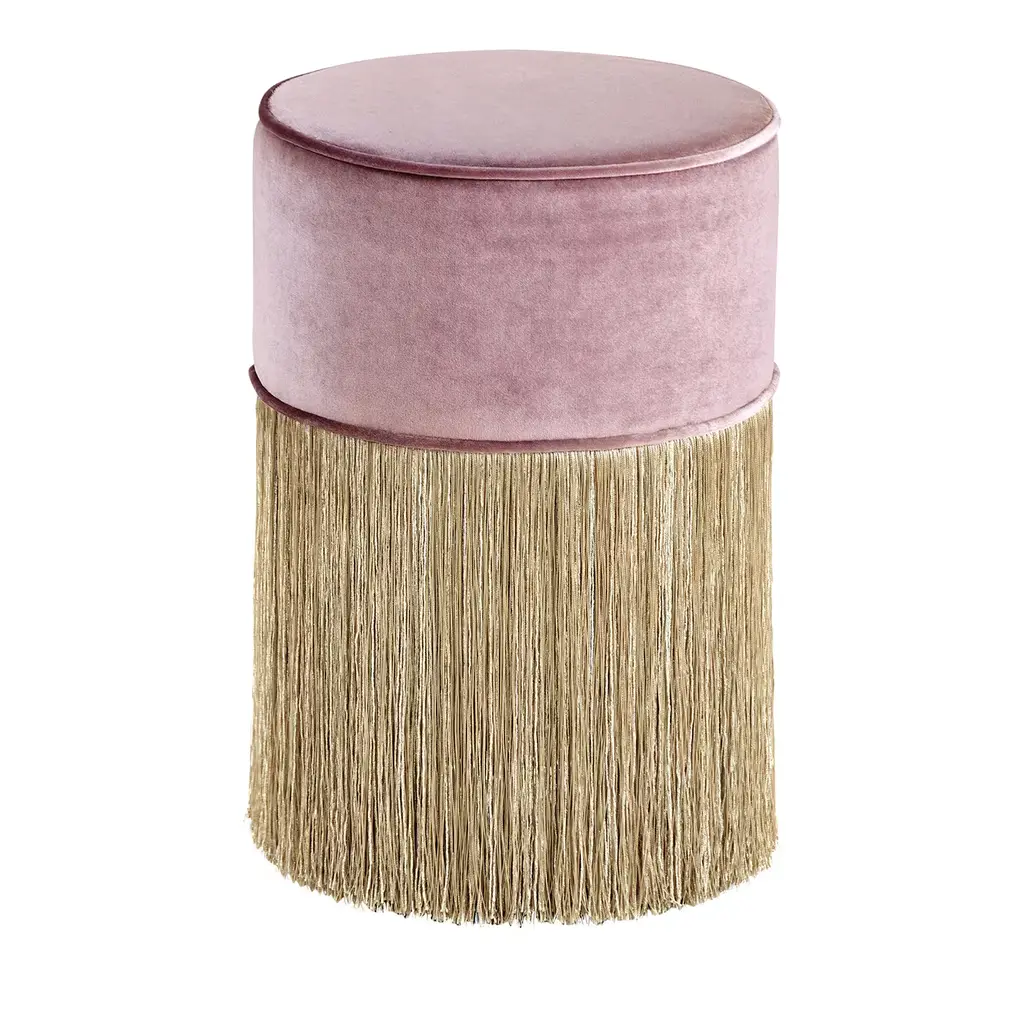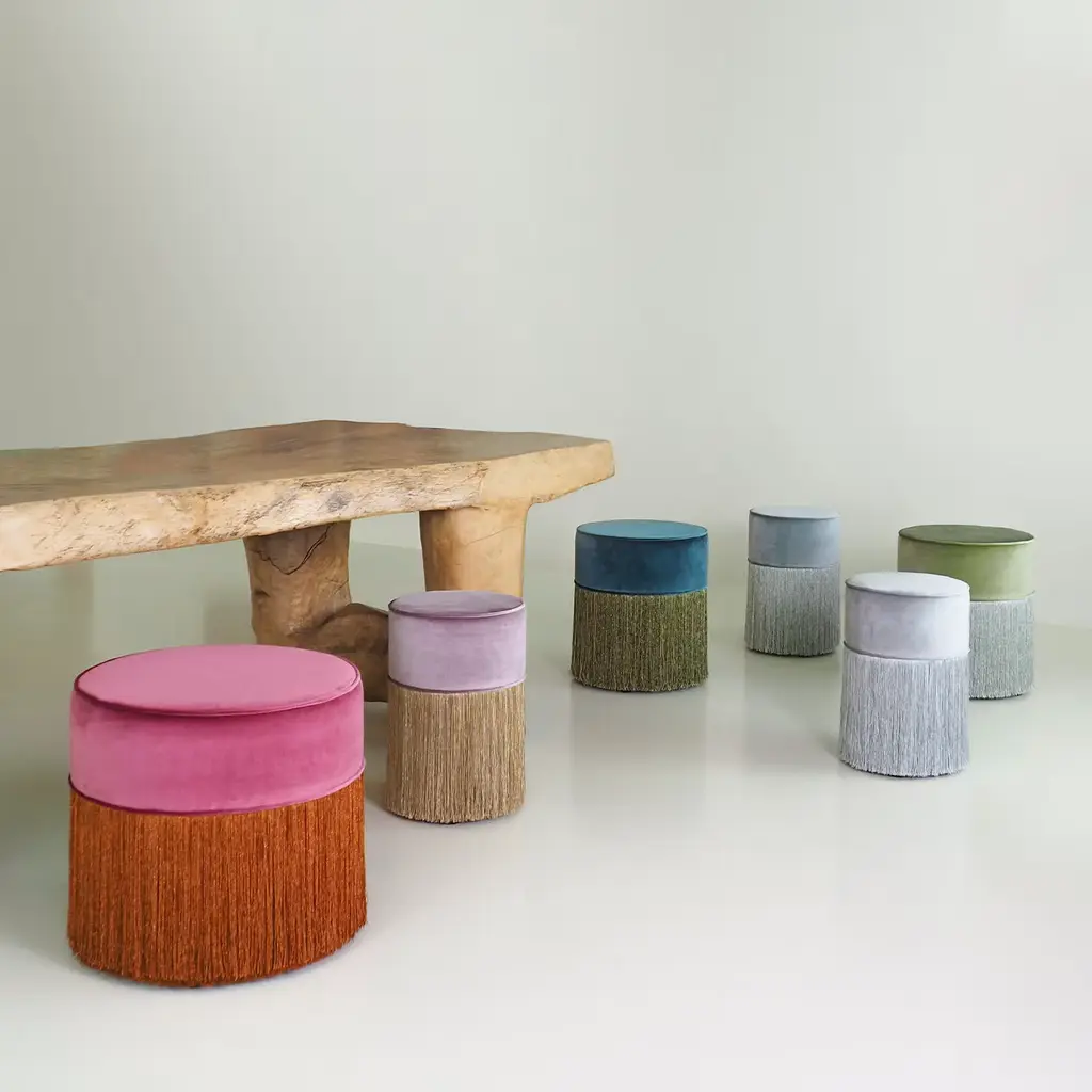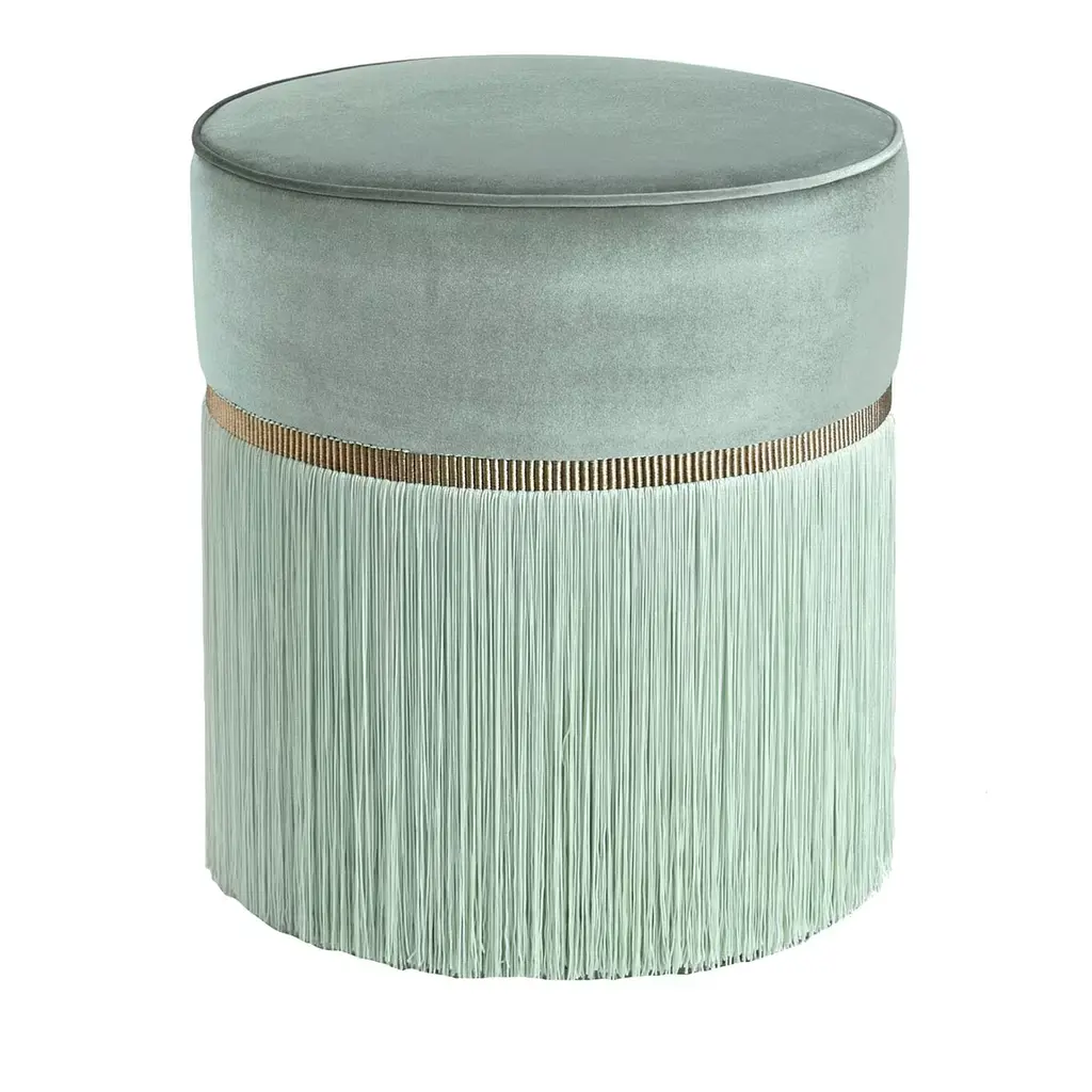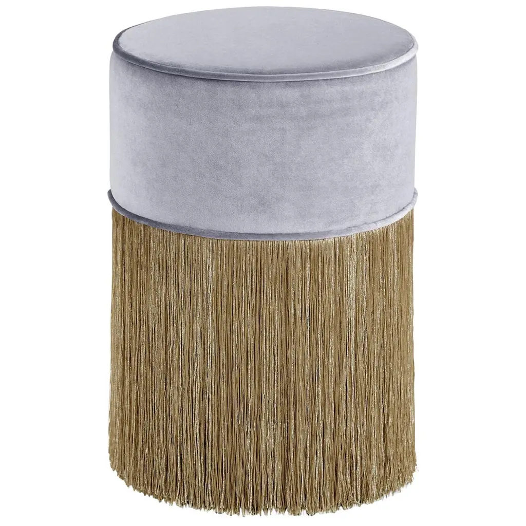 Inspired by Art Deco style, this glamorous pouf boasts a shimmering look with its silver velvet upholstered seat and matching lurex fringe. A chic addition to a living room dominated by a cool chromatic palette, this original piece belongs to the Sparkle Collection of poufs characterized by an elegant retro flair and crafted with attention to detail using high-quality materials. Each bespoke piece is stamped on the bottom of the pouf’s lining and personally signed, numbered, and dated by designer.