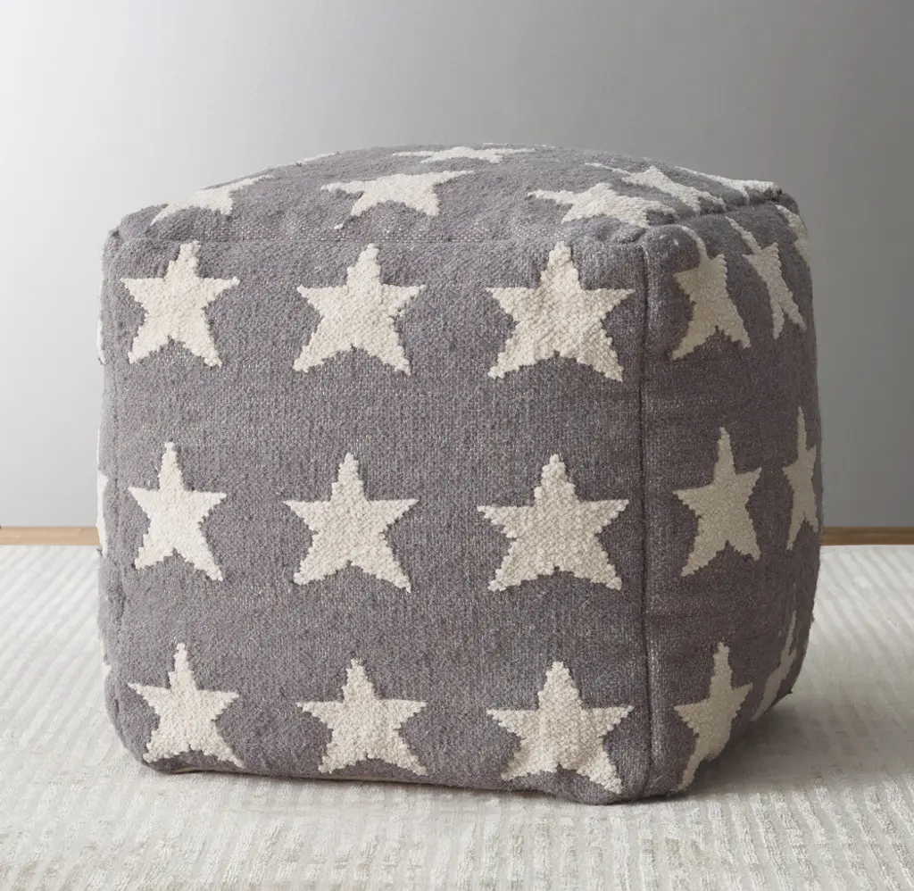 We borrowed the bold, cheerful star print from one of our favorite rugs and reimagined it in a portable, kid-friendly seat for the bedroom or playroom. Using traditional techniques, the flatweave is handwoven from a blend of washed wool and cotton and strewn with plush chenille stars – a stellar focal point in any space.