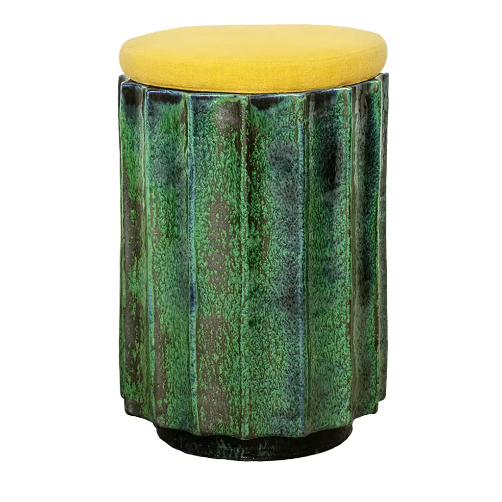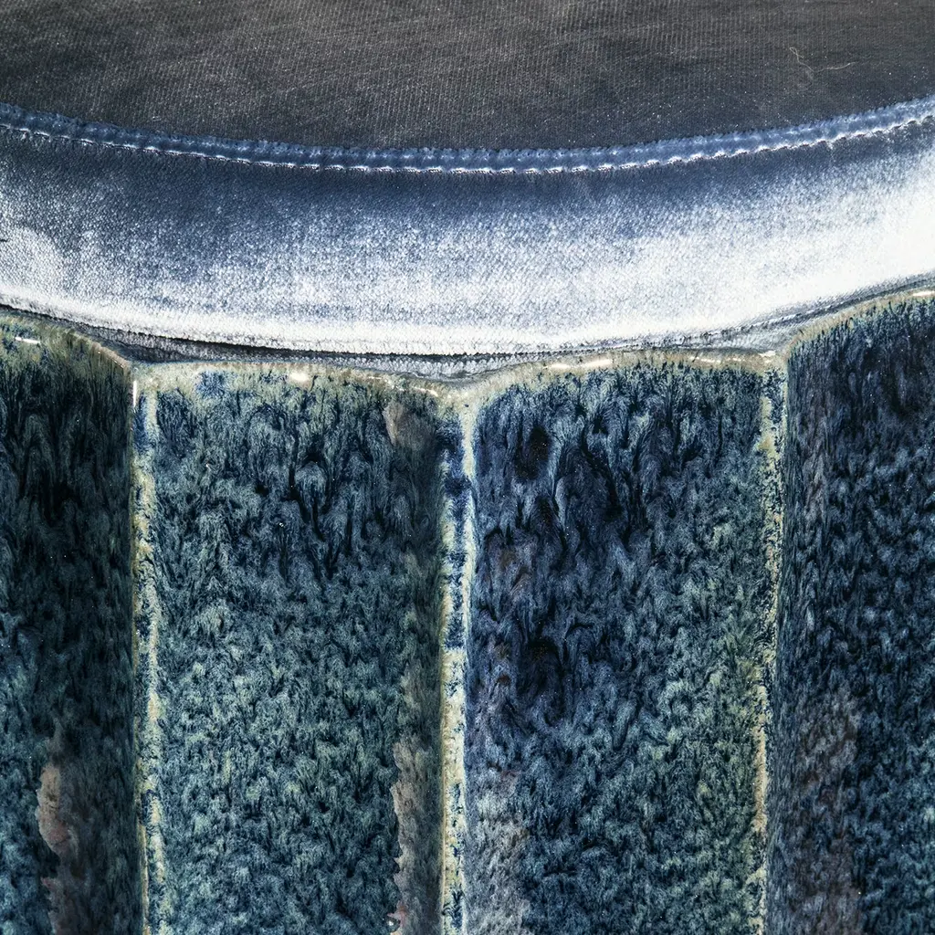 Part of a series of column-like poufs that can be easily stacked reminding of the Endless Column by C. Brancusi, this pouf boasts an artful sculptural silhouette fashioned of ceramic and offered in a vibrant dappled-blue finish. A soft round cushion covered in turquoise velvet complements the seat, sealing a design that was inspired by the decrepit scenarios of engraver and architect Giovanni Battista Piranesi.