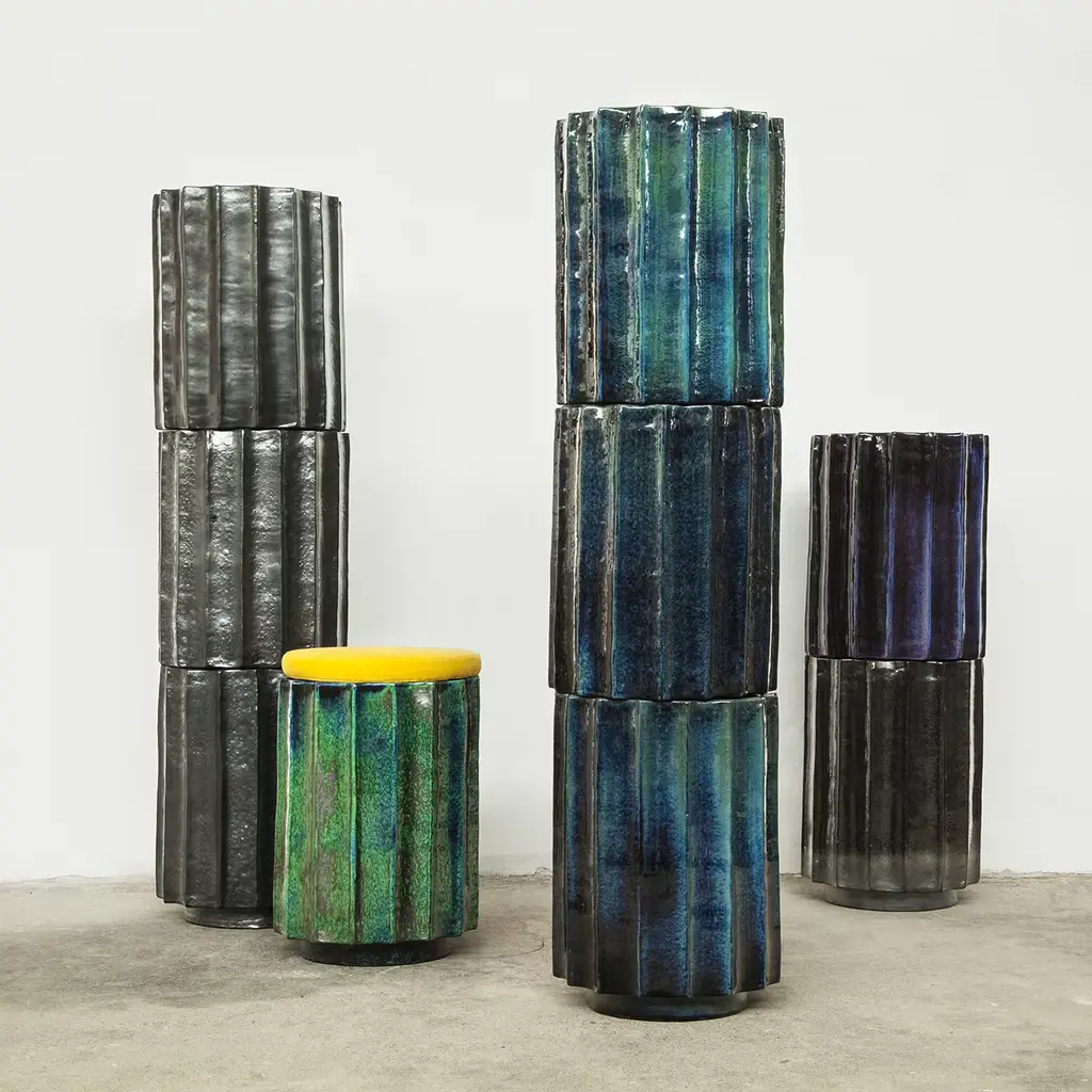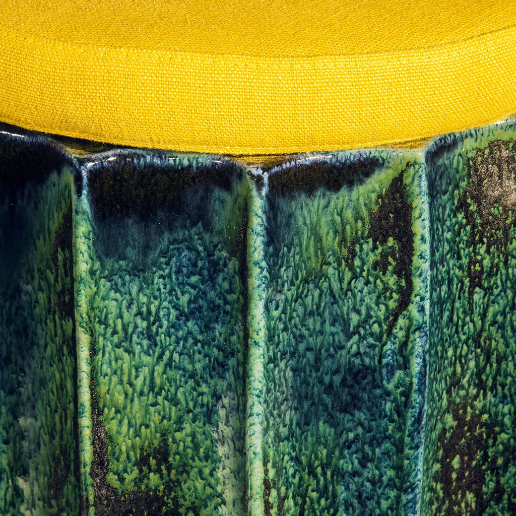 Inspired by the decrepit scenarios of the 18th-century engraver and architect Giovanni Battista Piranesi, the design of this sculptural ceramic pouf recreates the one of an ancient truncated column. A bright-yellow cushion completes the seat, while a vibrant melange shade of green accents the column and its round plinth base for the pouf to be stacked with twins.