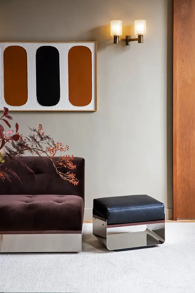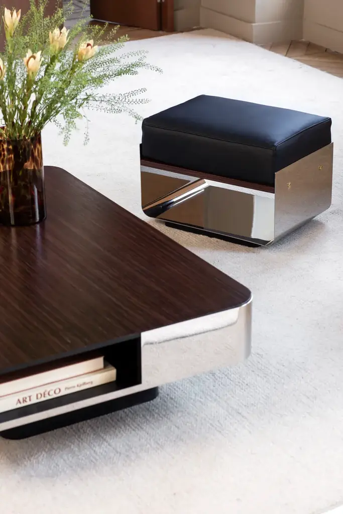With its low seating module, Stellar remains faithful to the codes and lines of the beloved 70s era, so cherished by the brand. With its monobloc aesthetic, Stellar subtly combines stainless steel and rosewood with a touch of brass. The generous cushion offers a comfortable and customizable seat. Removable, it allows for the transformation of the seat into a side table when needed. Paired with the Stanley sofa and lounge coffee table, this piece takes us on a journey into a retro-futuristic universe.