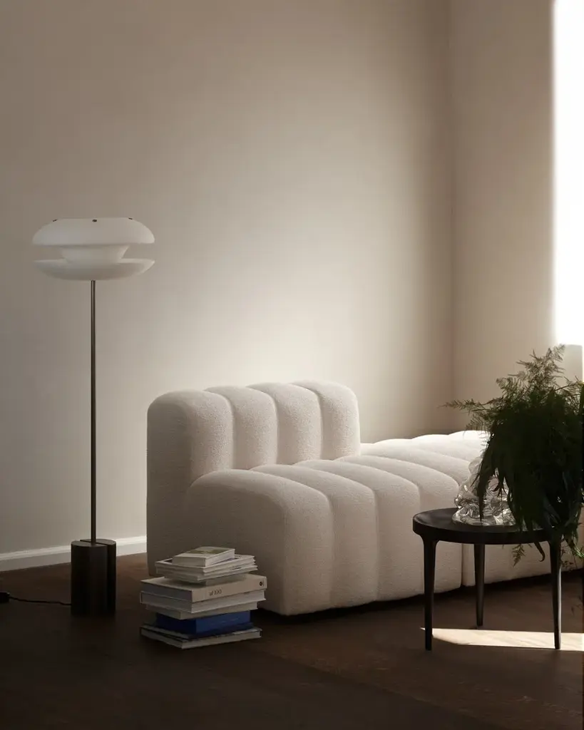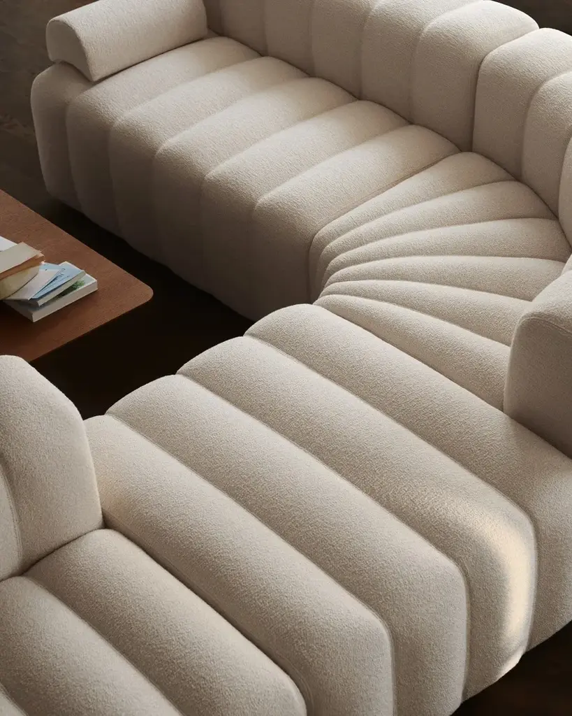 Studio is a fabric pouf.A tribute to a timeless era of the 70s and its expressive aesthetics. Featuring a versatile but simple system of modules, appearing in limitless options to form numerous settings, shapes and styles to adhere to all types of environments, whether for a small living setting or spacious public site, Studio collection is defined by its bold fluted upholstery characteristics inspired by late 70s sofa styles, refined in a contemporary way - giving the series a unique identity. Each module of Studio articulates soft and welcoming lines ideally suited for living, socialising and relaxing where one can feel totally at ease. The armrest cushion is loose and can be moved and repositioned across the series, balancing the fluted upholstery. A plywood structure with elastic belts & foam. 360-degree finish, each module can be a stand-alone. Modules can be reversed to create a two-sided sofa. Click-Link system connects modules. Soft foam mix for ultimate comfort. Available in a wide variety of high-quality eco-fabrics or leather from Sørensen Leather. Made in Italy.