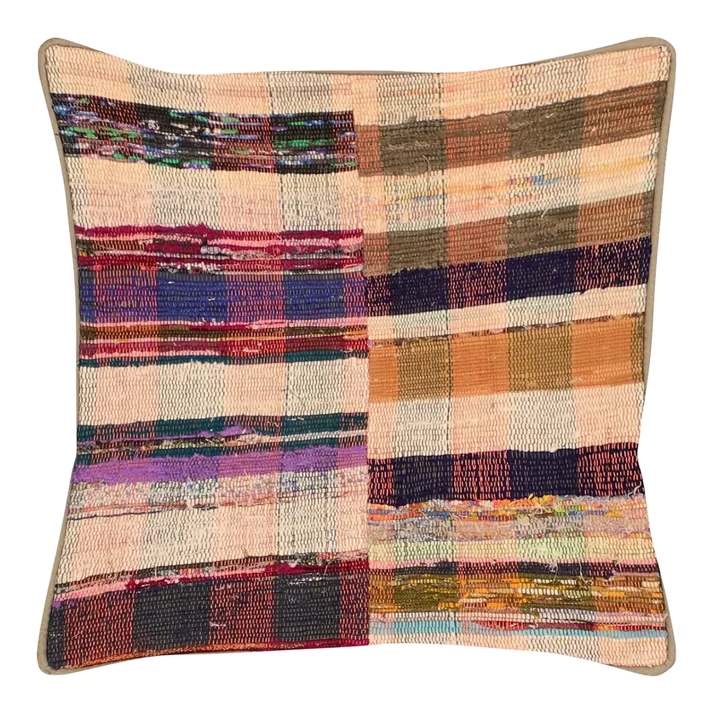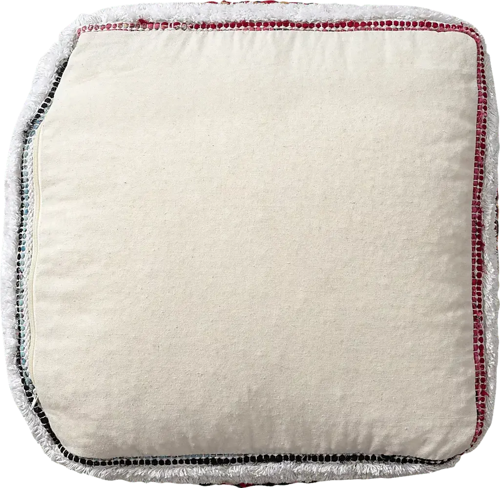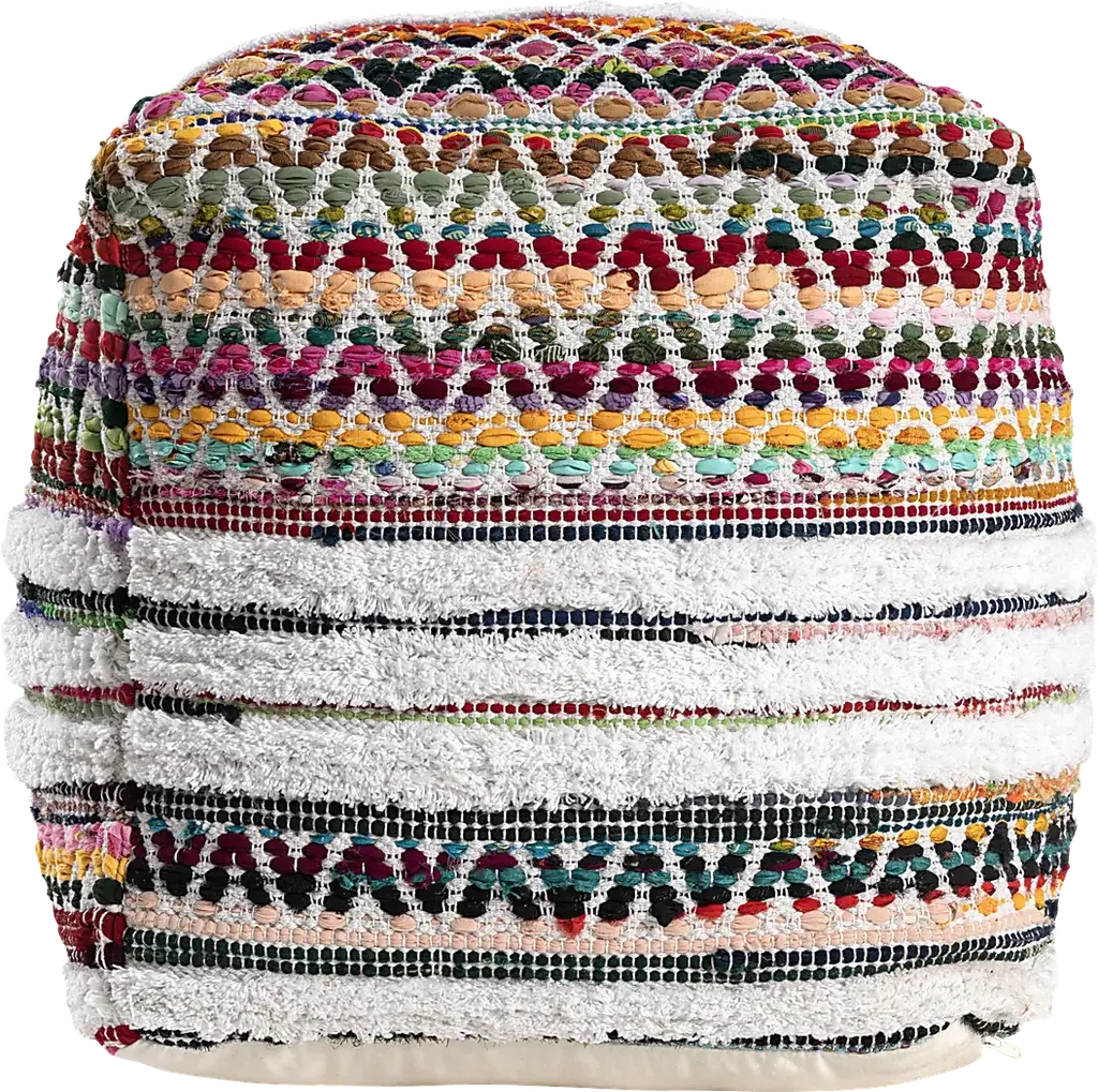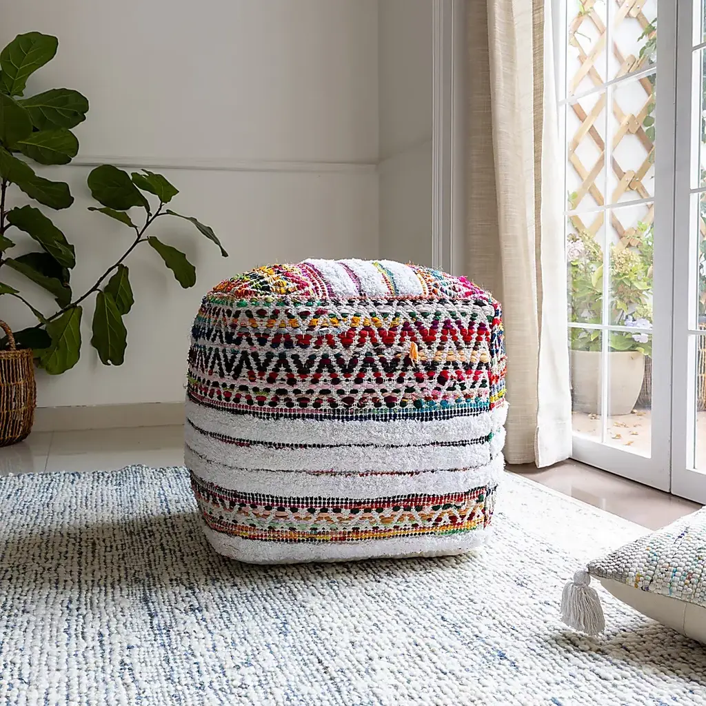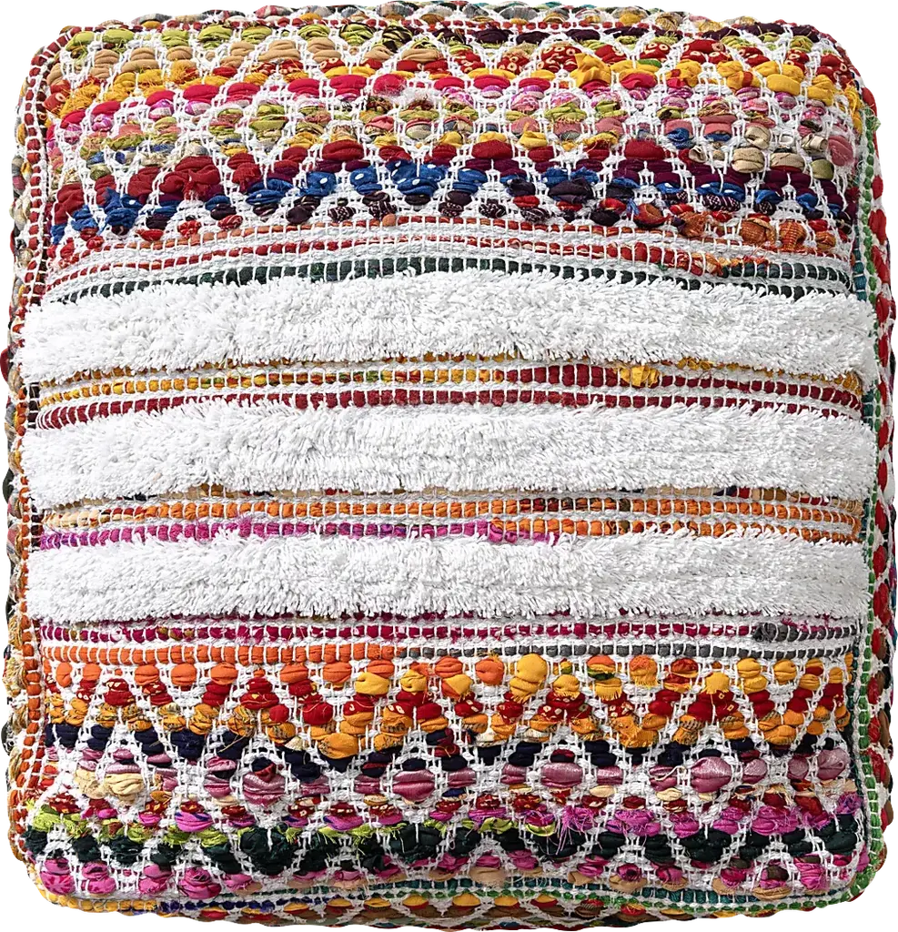 Introducing the multicolor square pouf, a versatile addition to your home decor. This handmade pouf features a blend of 60% cotton and 40% polyester, ensuring durability and comfort. Its chevron and striped pattern and eclectic Bohemian style bring a touch of casual elegance to any space. The multicolor design and over-tufted texture add visual interest, making it a standout piece. Ideal for indoor use, this chindi pouf is filled with EPS balls, offering a soft and supportive feel. Enhance your living area with this unique and functional pouf today