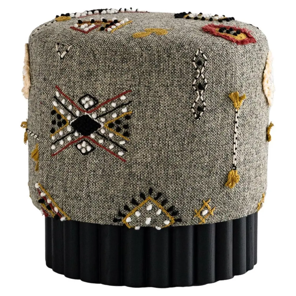 Part of the Sultan Collection, this pouf is the ideal choice to add a unique decorative accent to both a classic and a modern interior. Its cylindrical structure features a frame in solid wood and plywood padded with high-density polyurethane. The upholstery is divided between a solid leather cover below, and the top boasting an exclusive fabric printed with a mosaic effect of luxurious effect. Contract and commercial certifications available upon request.