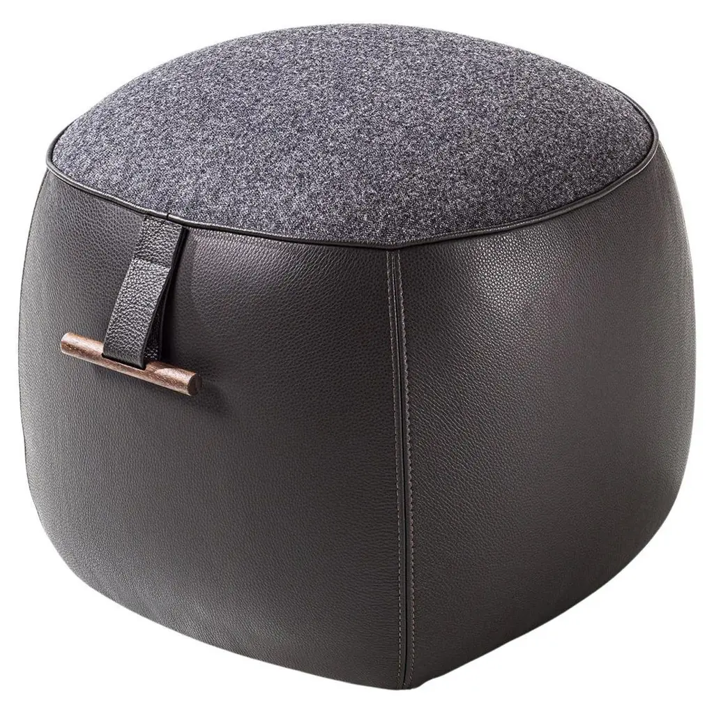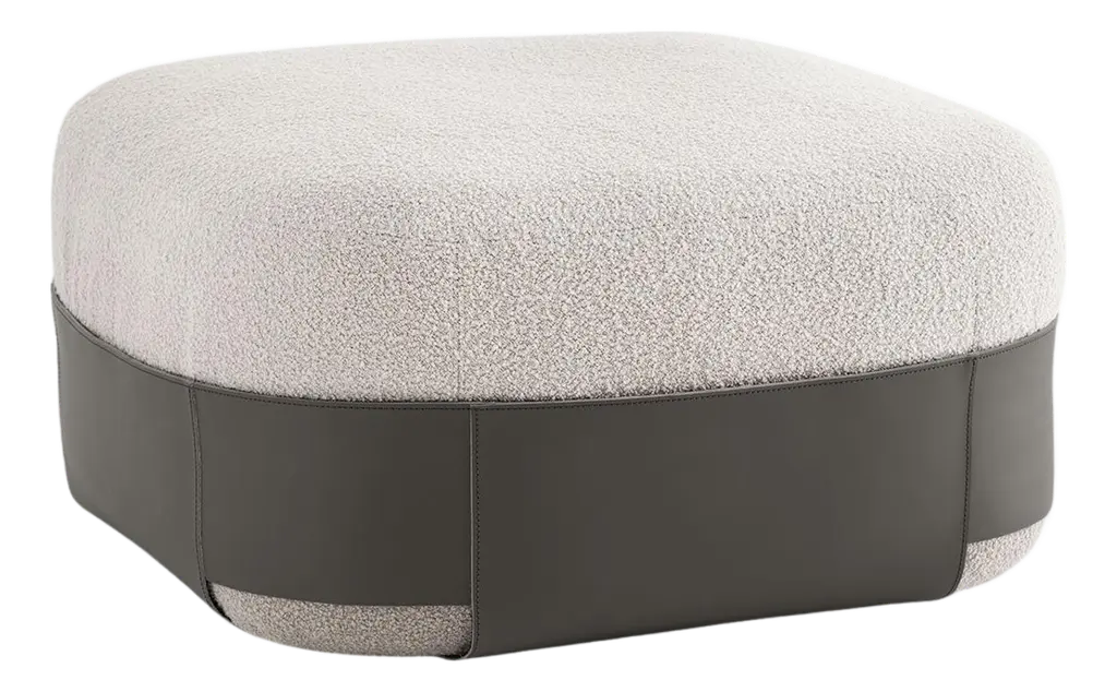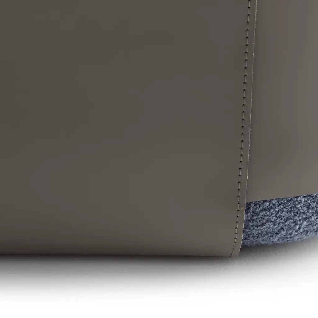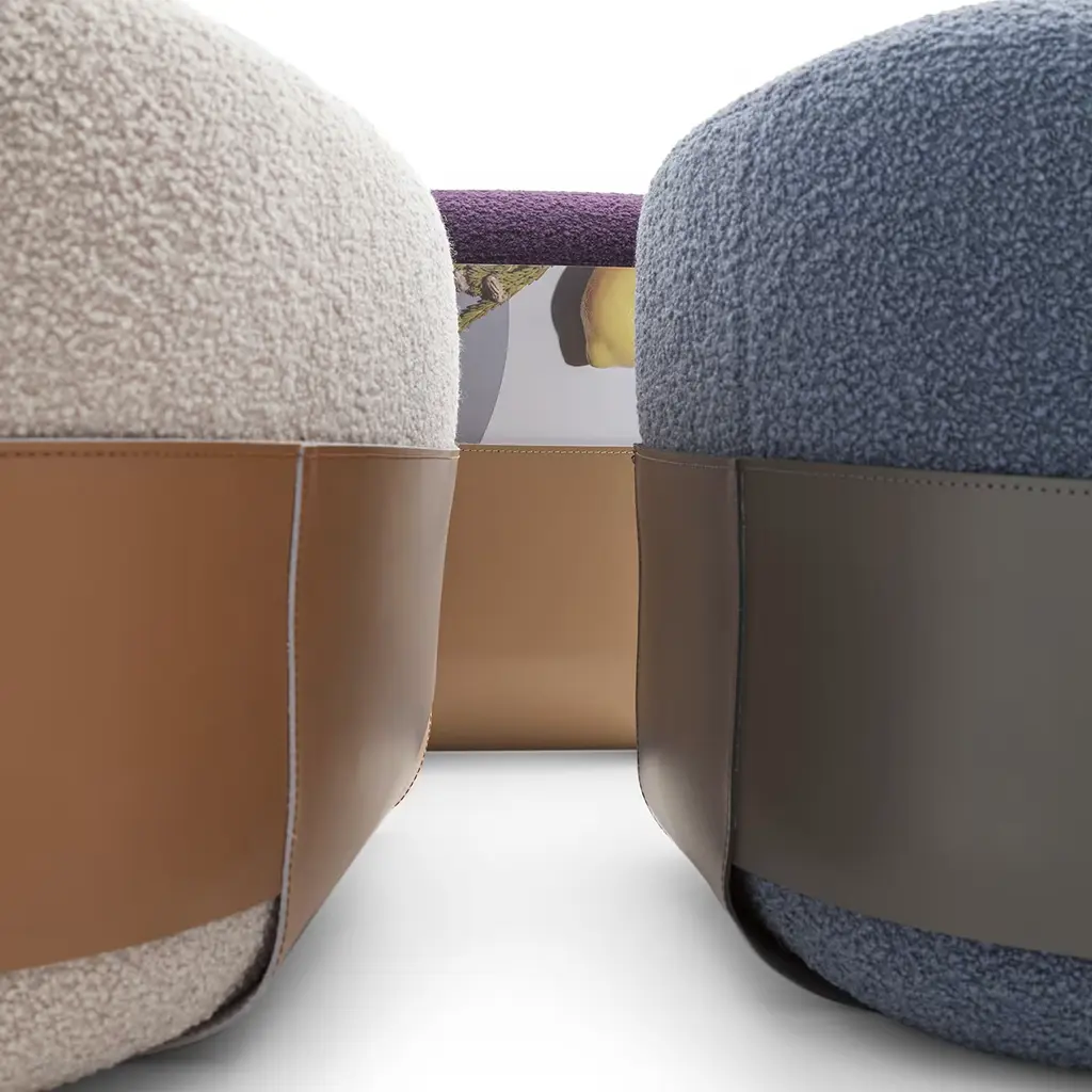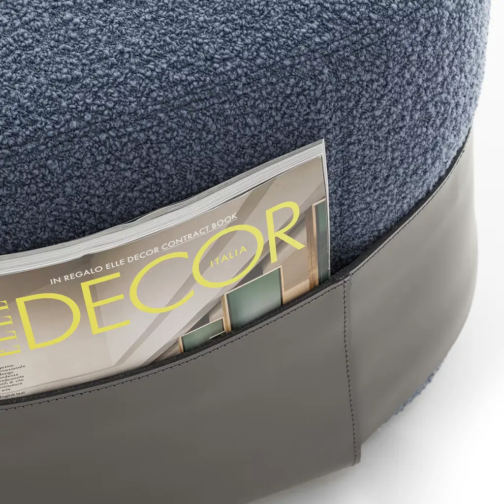 Playfully inspired by sumo wrestlers, this pouf offers a plush seating solution perfect when an unexpected guest comes over or as a footrest after a long workday. The generous inner padding in high-density foam is covered with warm blue-toned boucle wool, which is in turn embraced by a double combination of anthracite-gray leather bands creating a practical pocket for magazines or tablets.