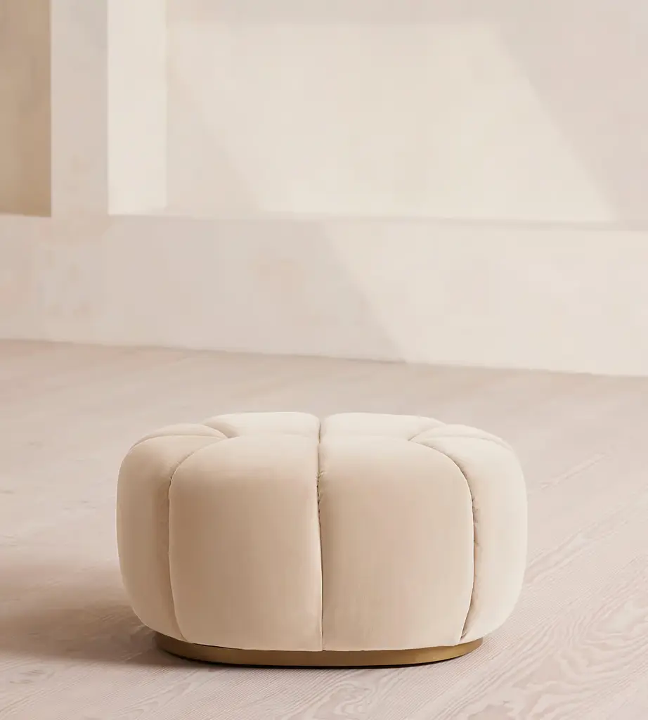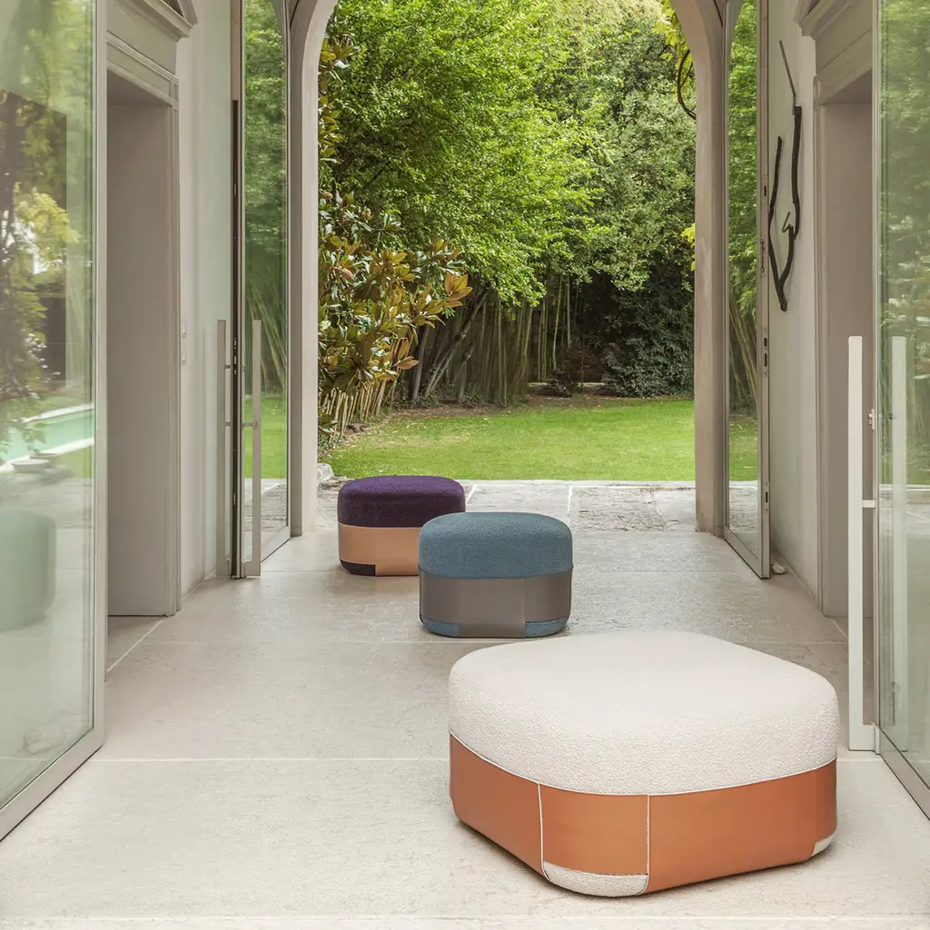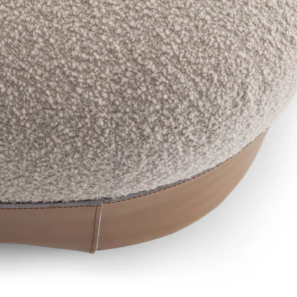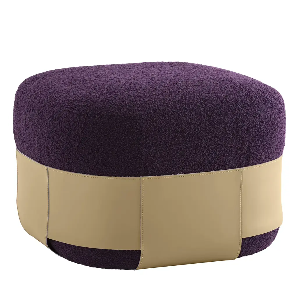 A combination of cognac-hued genuine leather strips envelops this pouf and reveals its playful inspiration by sumo wrestlers. Embracing the plush high-density foam silhouette covered in warm beige-hued boucle wool, the leather inserts create a practical solution for a quick arrangement of a magazine or a tablet. Its palette makes it an ideal accent piece for refined neutral-toned decors.