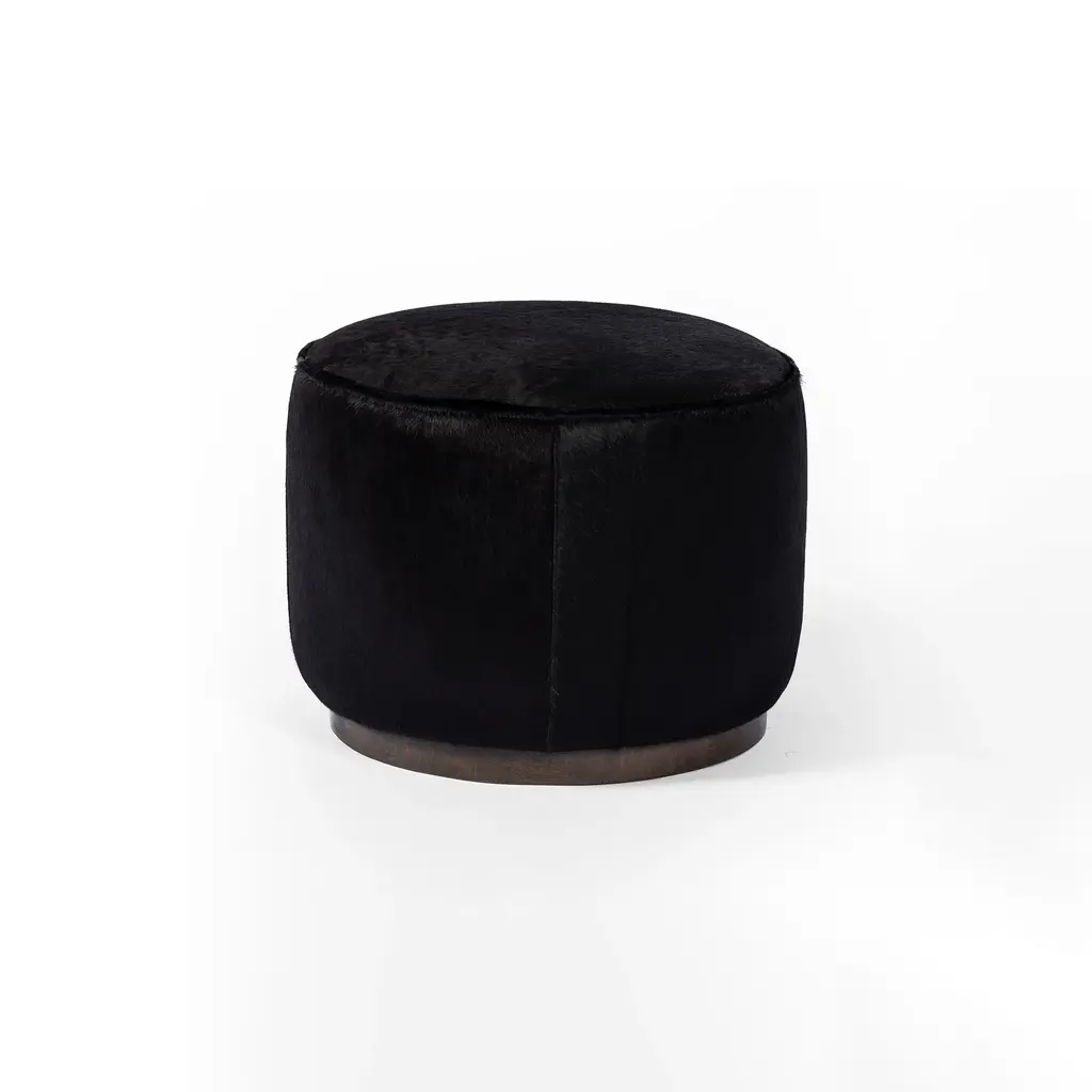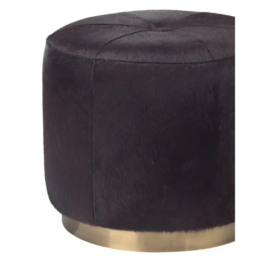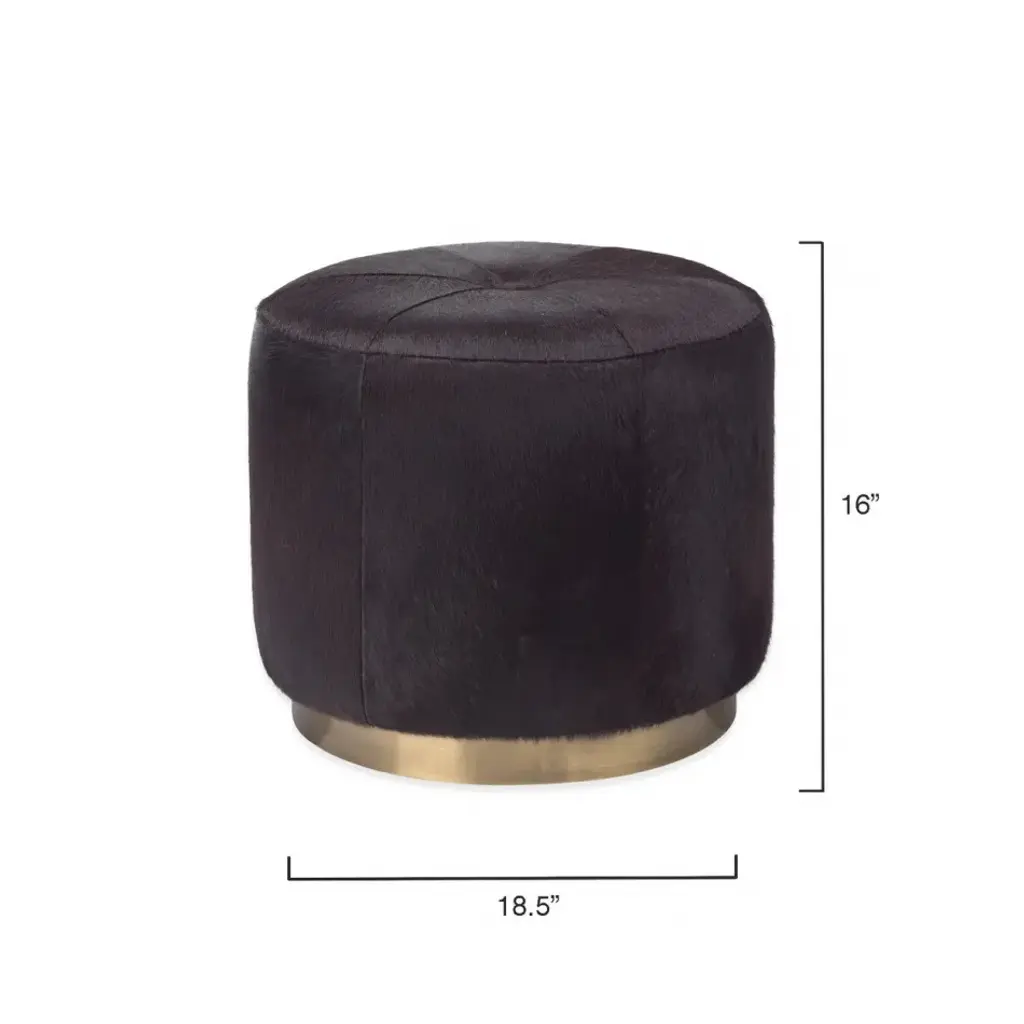 The Thackery collection of hair-on-hide poufs have the unique ability to add both glamour and comfort to any room of the home. Two sizes are available in your choice of white or espresso hides. Each is beautifully handcrafted and accented with a gleaming brass band at the base. Whether you want to pull up an extra seat or put up your feet, with a Thackery pouf you will do it in style! Natural color variation will occur in hide. Metal finish may vary.