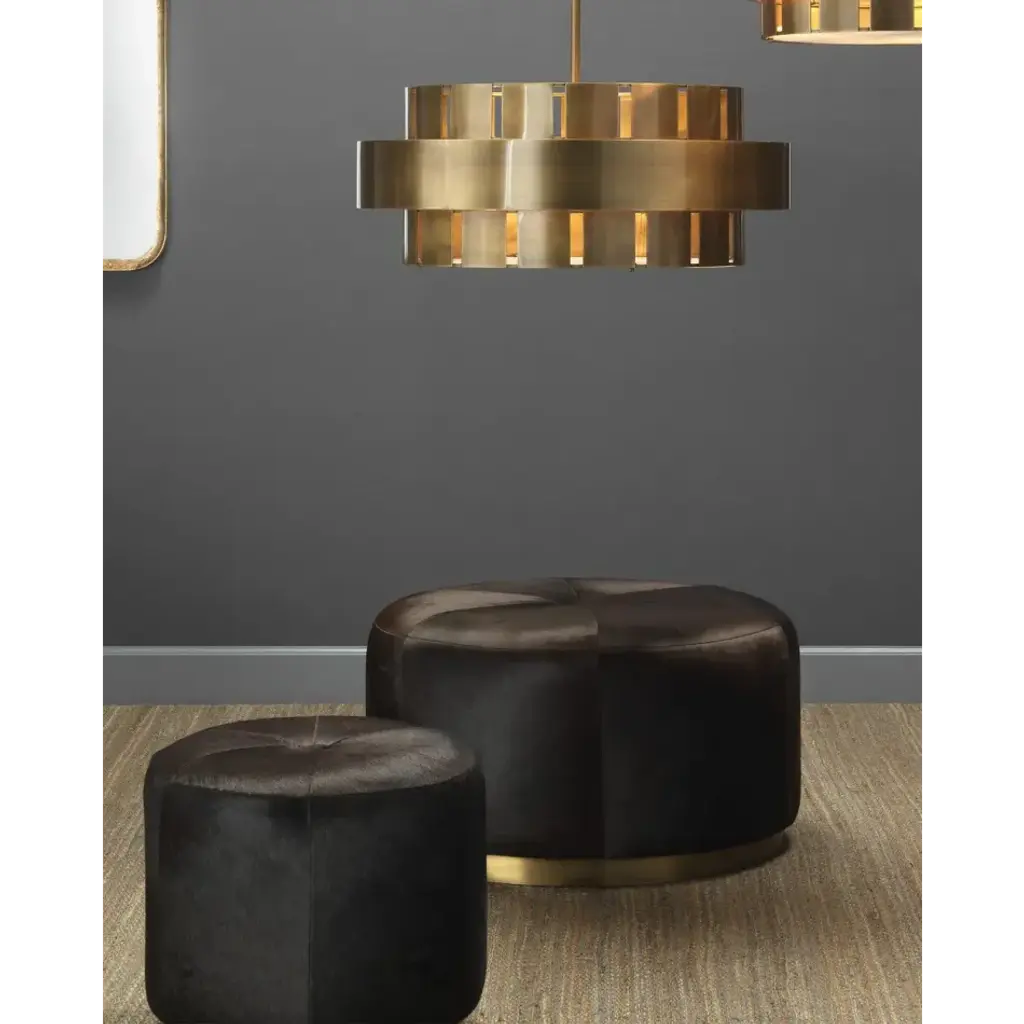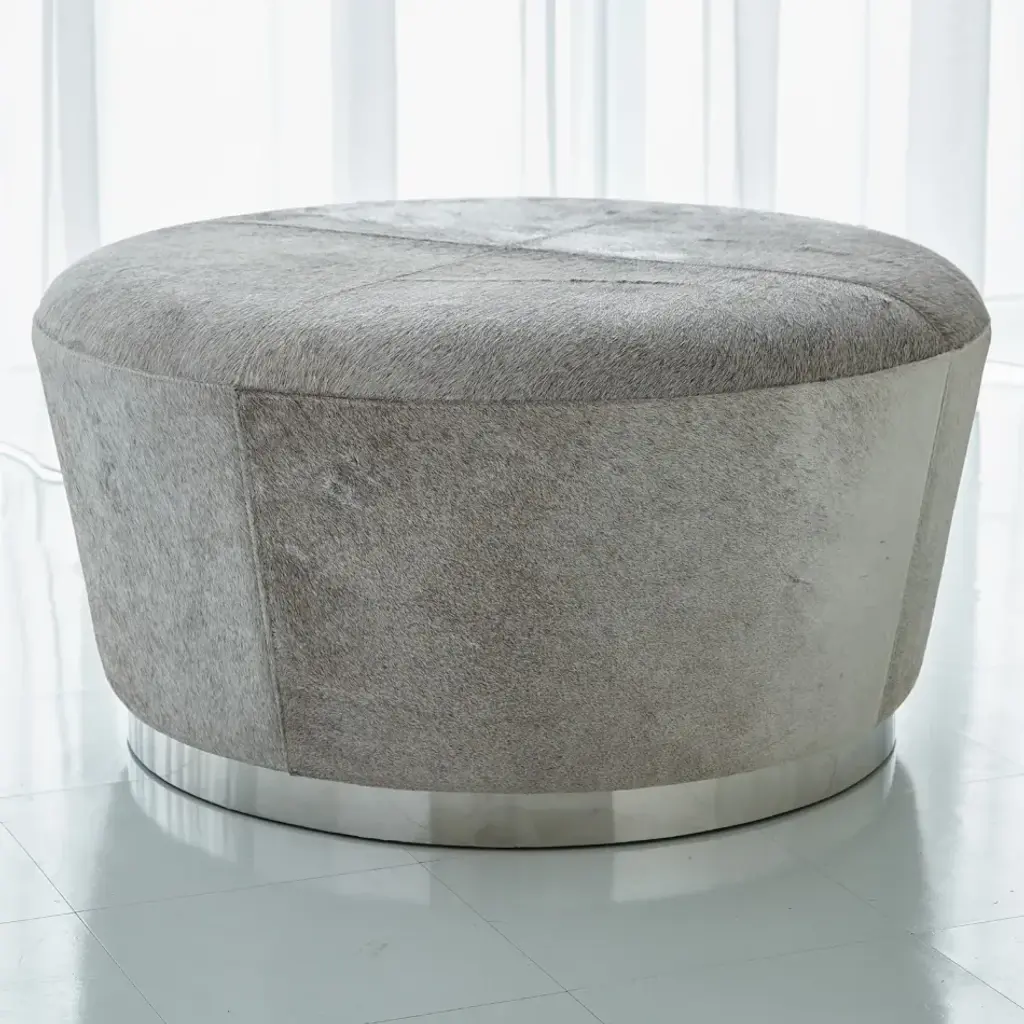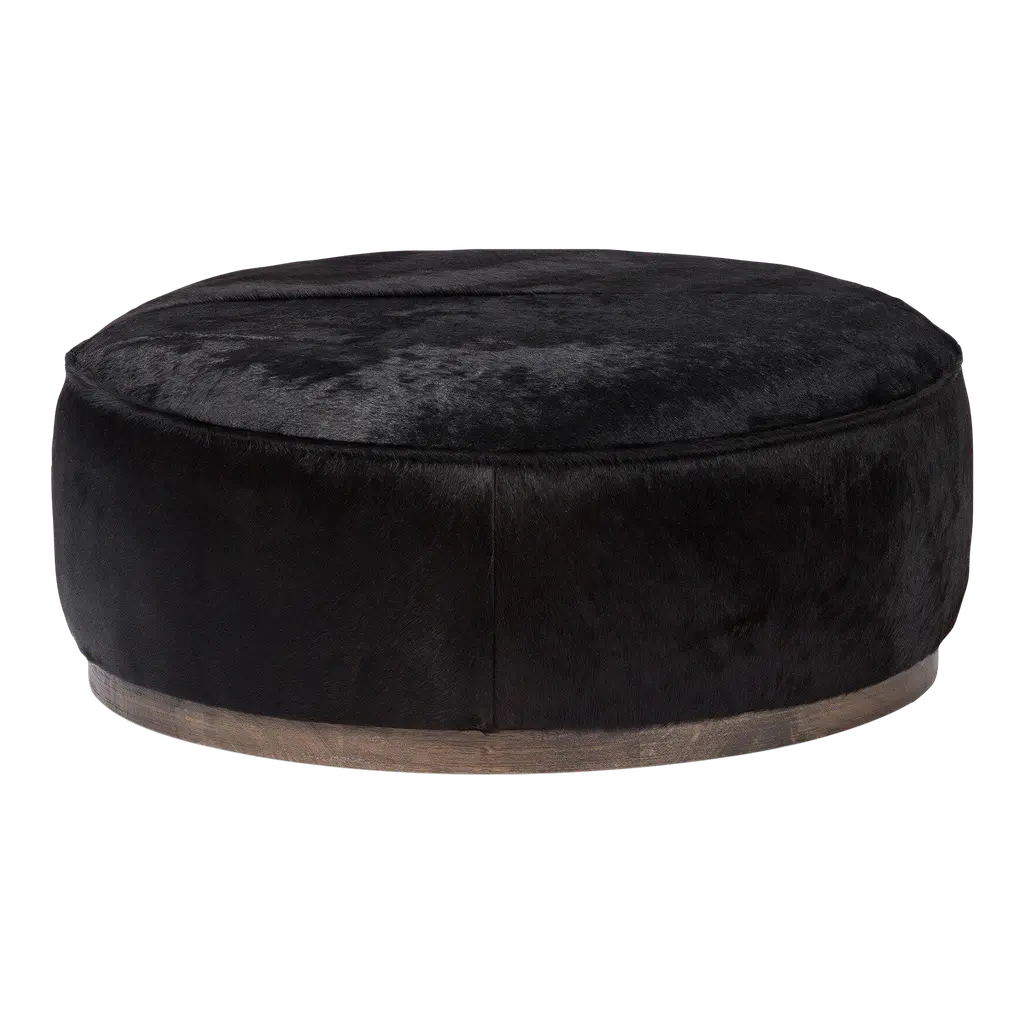The Thackery collection of hair-on-hide poufs have the unique ability to add both glamour and comfort to any room of the home. Two sizes are available in your choice of white or espresso hides. Each is beautifully handcrafted and accented with a gleaming brass band at the base. Whether you want to pull up an extra seat or put up your feet, with a Thackery pouf you will do it in style! Natural color variation will occur in hide. Metal finish may vary.