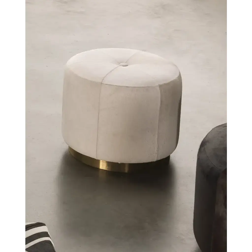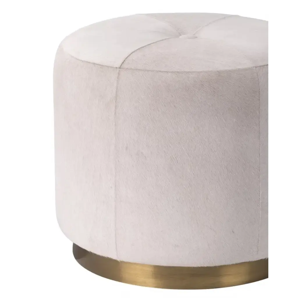 The Thackery collection of hair-on-hide poufs have the unique ability to add both glamour and comfort to any room of the home. Two sizes are available in your choice of white or espresso hides. Each is beautifully handcrafted and accented with a gleaming brass band at the base. Whether you want to pull up an extra seat or put up your feet, with a Thackery pouf you will do it in style! Natural color variation will occur in hide. Metal finish may vary.