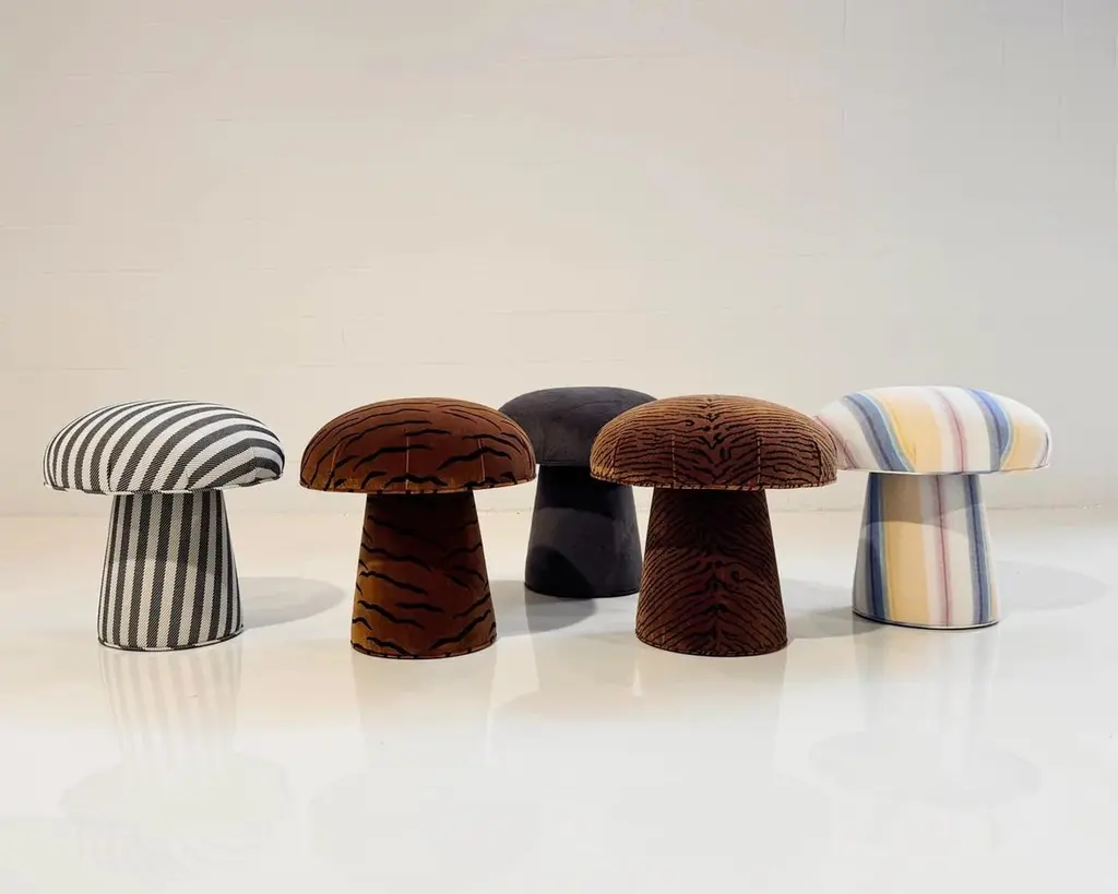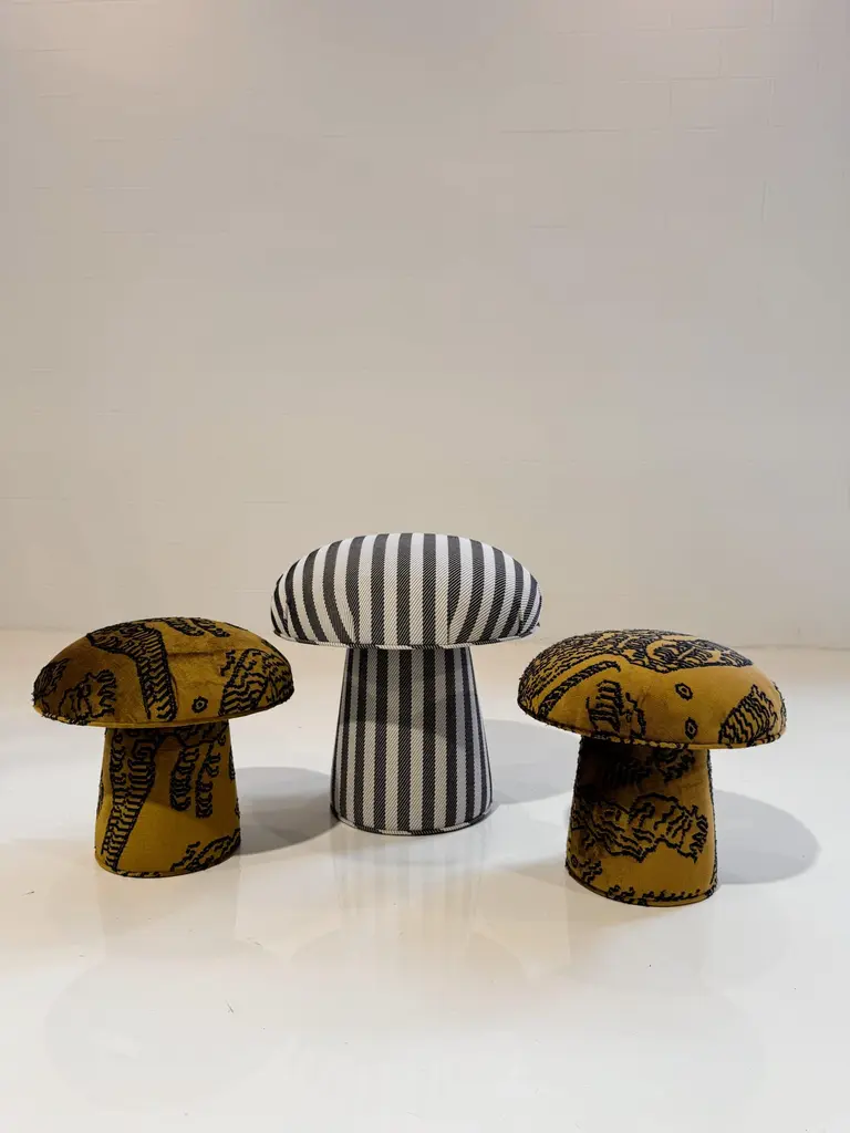 Our Mushroom Pouf is designed by Forsyth and handcrafted in Saint Louis. A cute decorative piece for any room adding natural texture and a bit of whimsy. The perfect ottoman or extra seat. Each mushroom pouf is completely handmade. Custom made to order. Please allow 6 to 8 weeks. The Fabric Shown in Dedar's beautiful jacquard velvet, A Tiger In The Orangerie. A vividly coloured jacquard velvet interprets the skin of a tiger, that magical and mysterious creature, in its purest and most natural expression. The vertical stripe, recalling the tiger’s back, confers a rhythmic cadence. With a soft and dense feel, this fabric is suitable for upholstery applications.Interested in a different color or fabric? The mushroom pouf can be made bespoke to meet your design needs. If you are interested in a different fabric for your space, just ask.