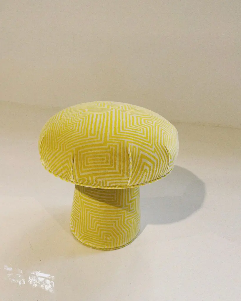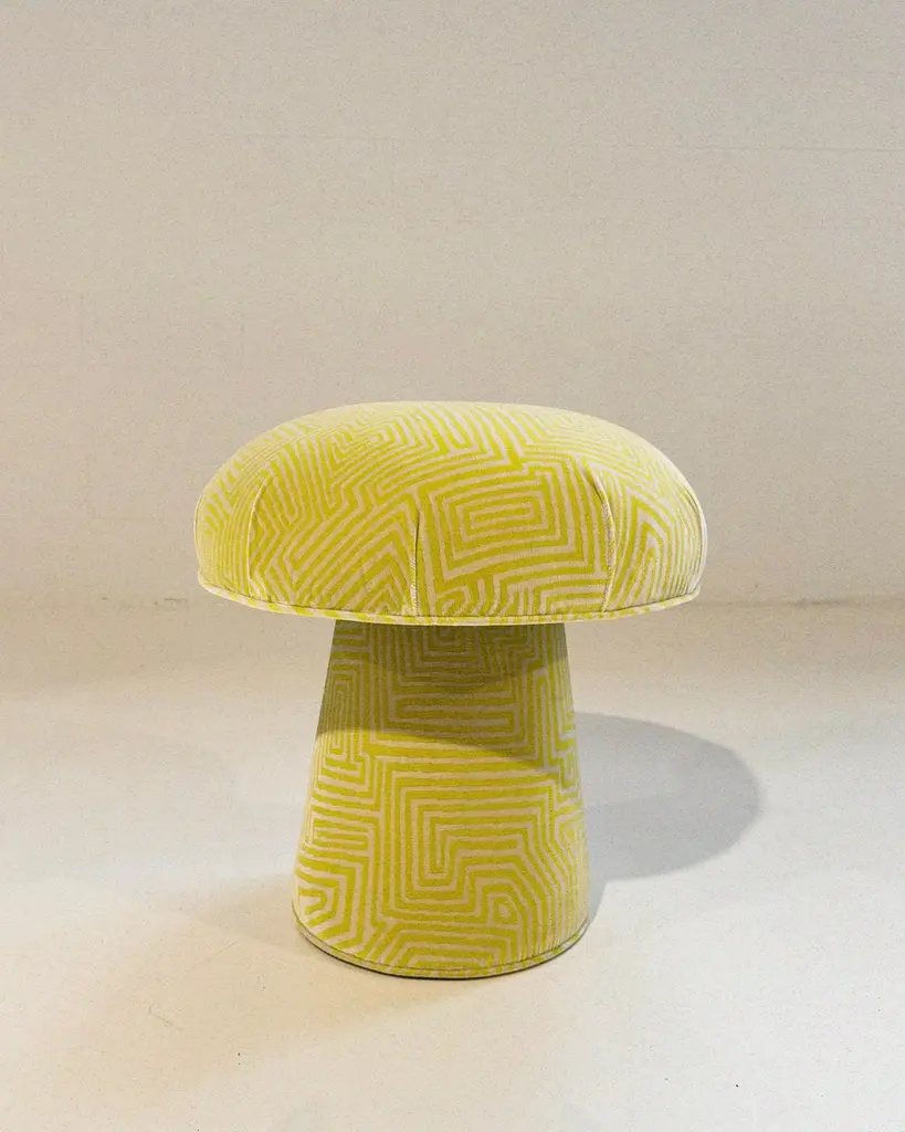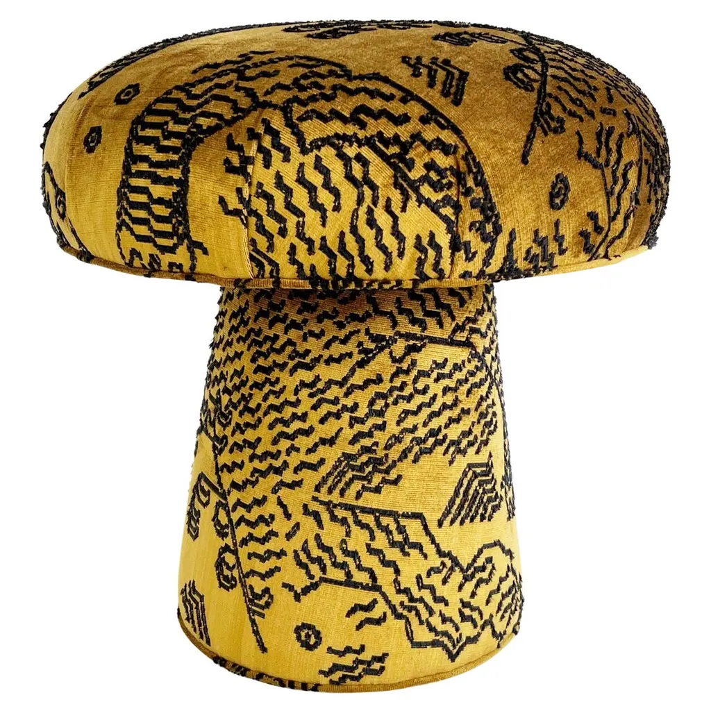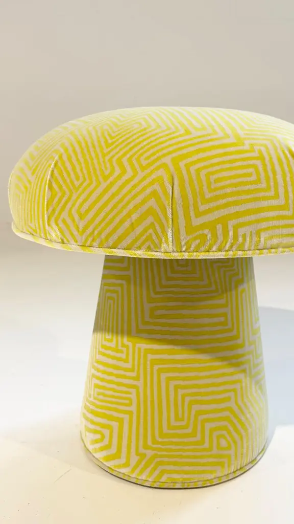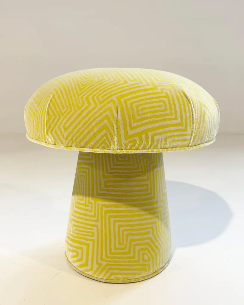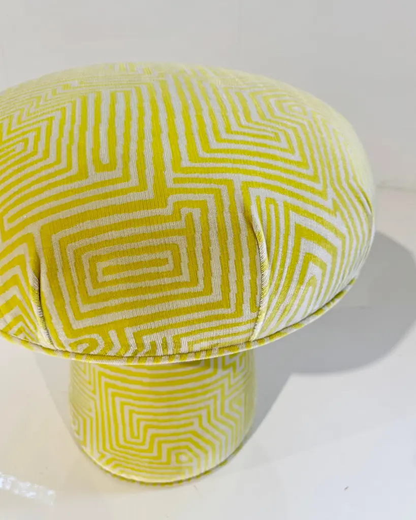 Our Mushroom Pouf is designed by Forsyth and handcrafted in Saint Louis. A cute decorative piece for any room adding natural texture and a bit of whimsy. The perfect ottoman or extra seat. Each mushroom pouf is completely handmade. Custom made to order. Please allow 6 to 8 weeks. The Fabric Shown in Dedar's beautiful cotton viscose, Jamu Jungle in 'Songbird' colorway, a stunning yellow. Jamu Jungle is an irregular labyrinth of archaic inspiration evokes the stylized language of Cubism and the intriguing atmospheres of the speakeasies in vogue in the twenties. This luminous jacquard velvet endowed with a pronounced chromatic identity recalls wild animal skins in natural tones and the multicolored plumage of tropical birds when interpreted in various vibrant colorways. With a soft hand-feel, it lends itself to intensive upholstery use and curtains. Jamu Jungle is available in 6 other colorways.Interested in a different color or fabric? The mushroom pouf can be made bespoke to meet your design needs. If you are interested in a different fabric for your space, just ask.