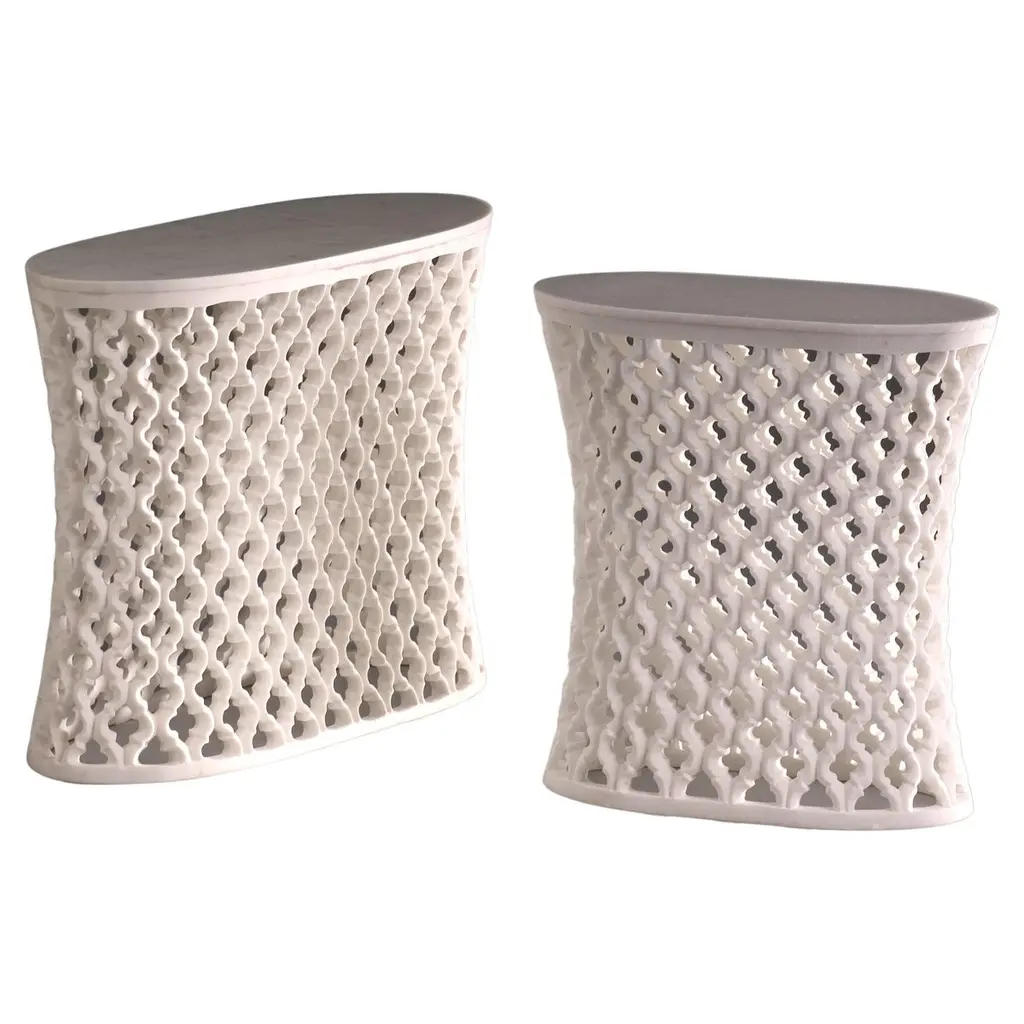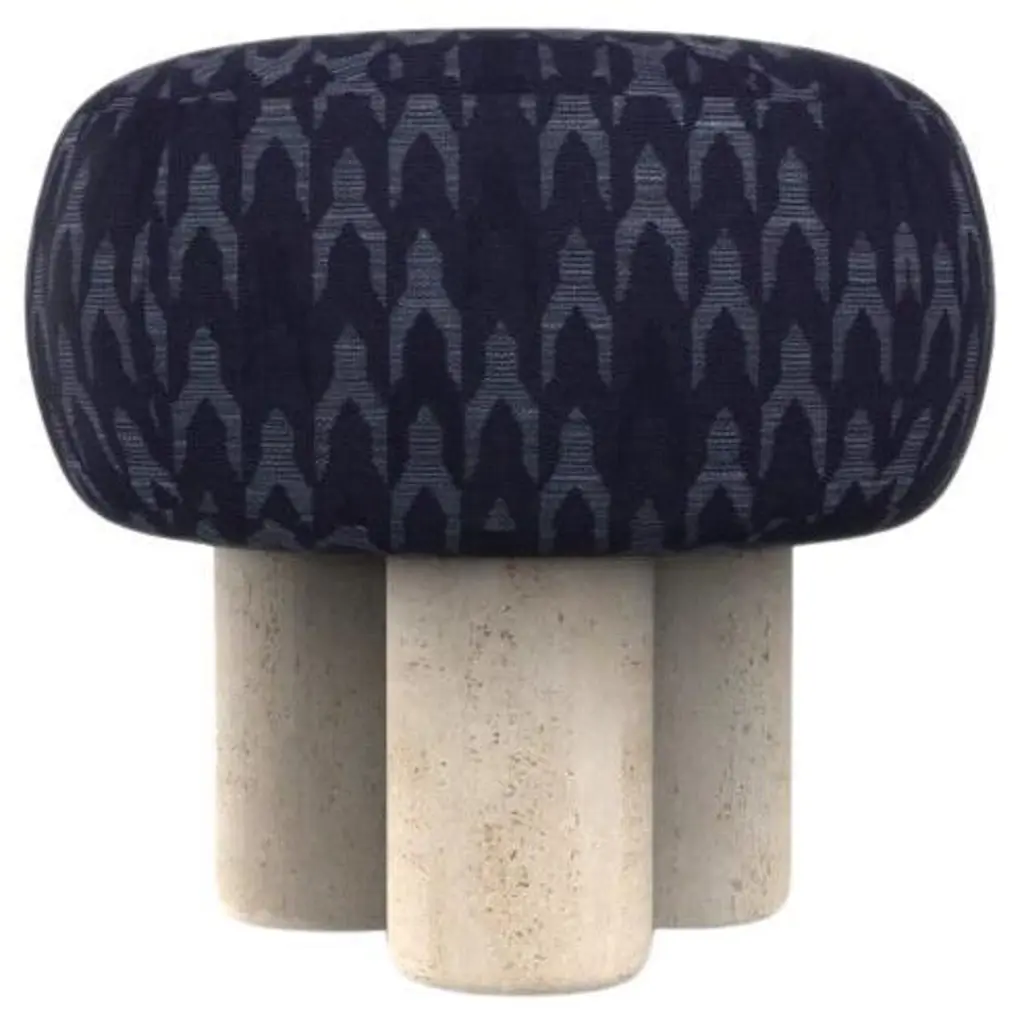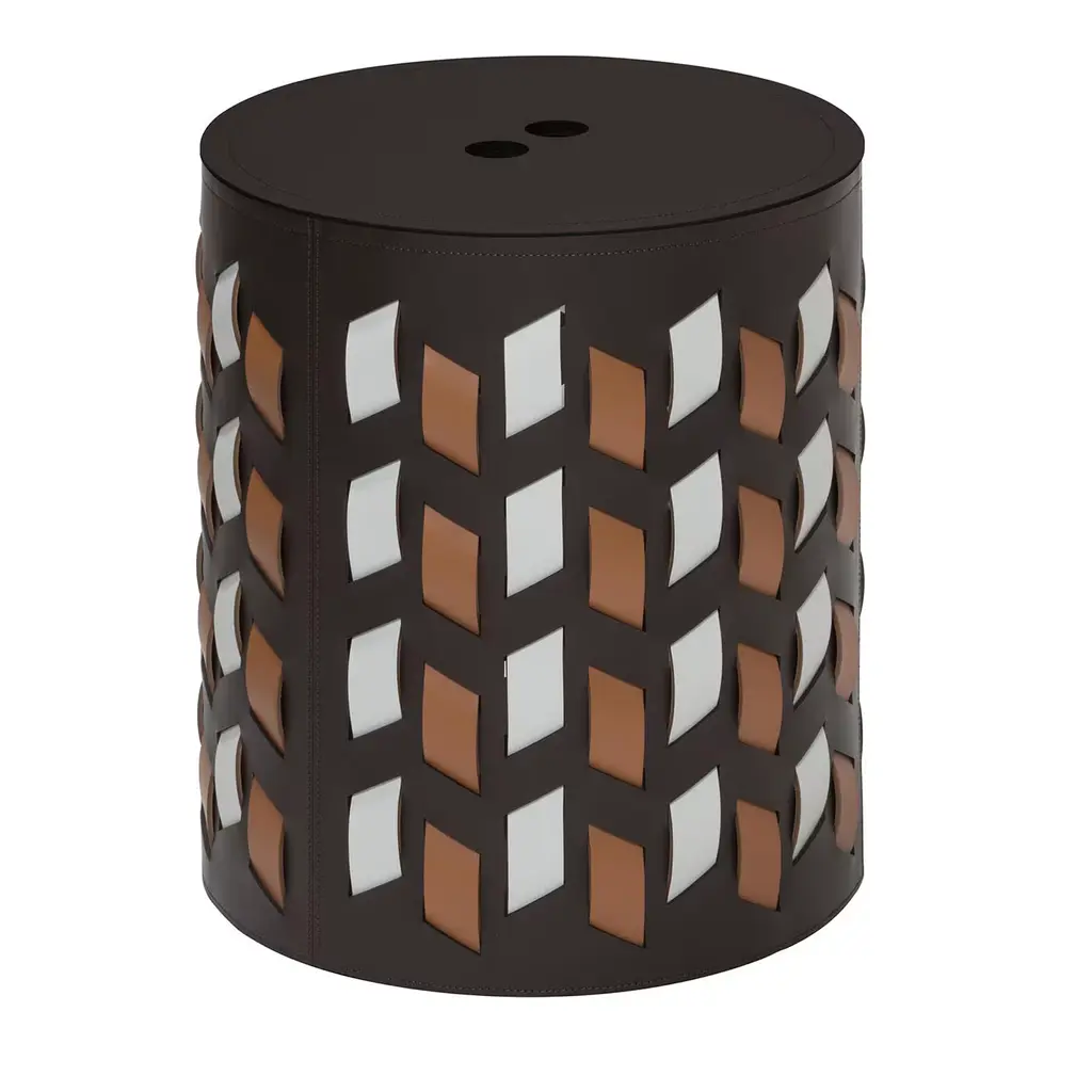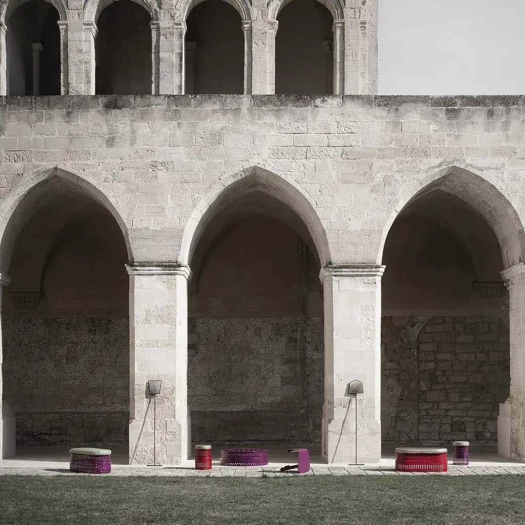 An exquisite piece of charming contemporary allure, this oval pouf is named after the skillful laser-cut work that defines the base structure recalling the warp and weft of handwoven fabric. Fashioned of red-lacquered steel, this pouf is enriched by a soft cushion padded with dry-fly and upholstered with removable indoor-outdoor fabric.