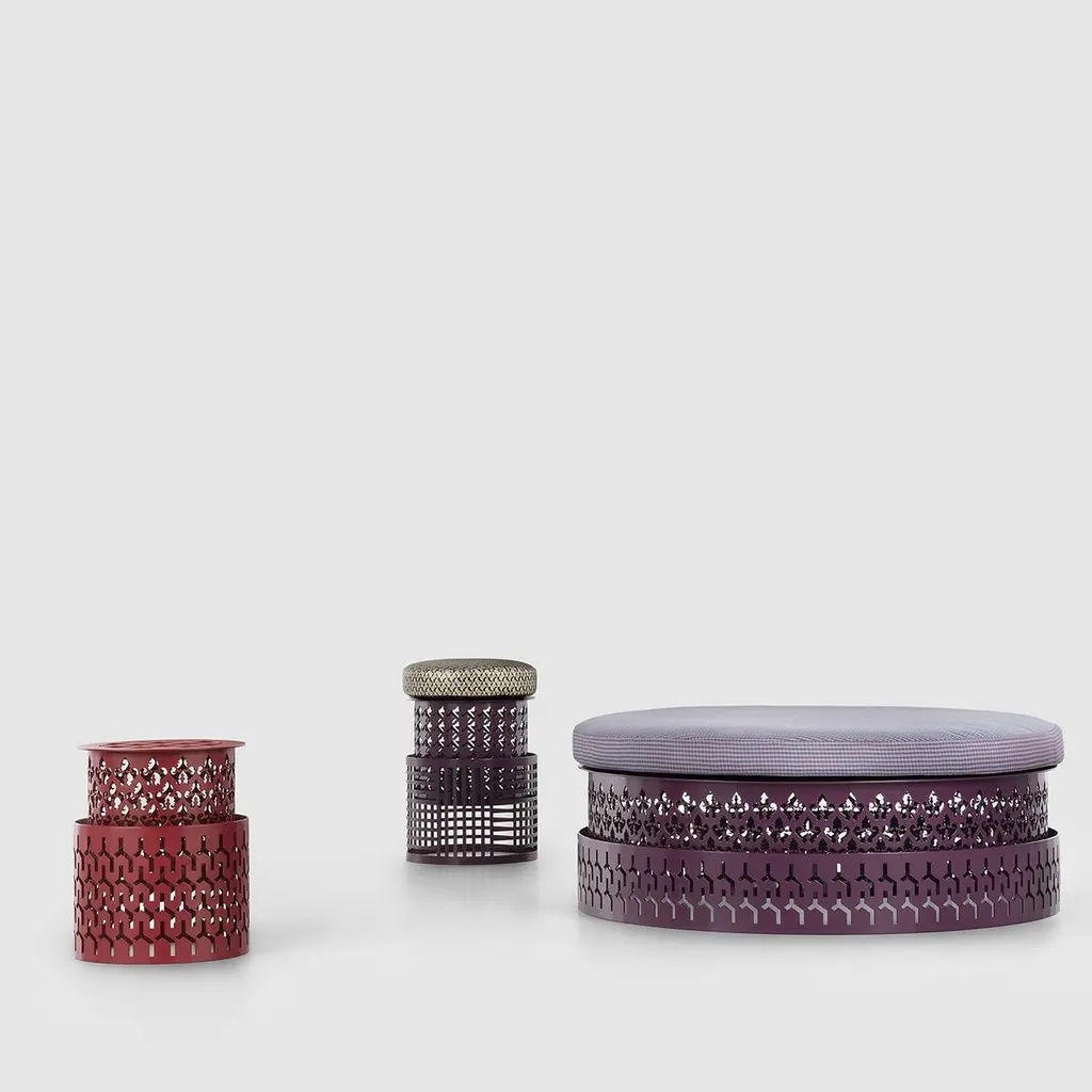 Contemporary and sophisticated, this pouf will be a charming addition to both an indoor or outdoor area. Boasting a dark purple hue, it is entirely crafted of steel. The structure is marked by two cylindrical pieces distinguished by a captivating laser-cut work covering the surfaces and is completed with a soft and comfortable cushion padded with dry-fly and upholstered in removable multi-color chevron fabric.