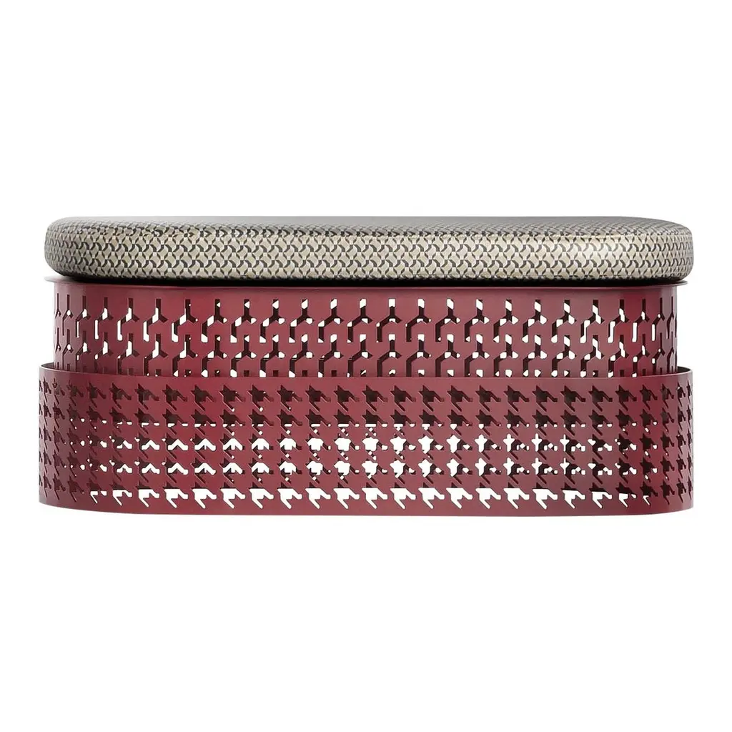 An exquisite combination of colors and geometric patterns, this striking pouf will make a statement in both indoor and outdoor decors, especially when matched to others from the same series. Entirely fashioned of red-lacquered steel, it is composed of two cylindrical pieces adorned with a masterful laser-cut work. The green cushion, with soft Dry-Fly padding, is upholstered with a removable indoor-outdoor chevron-style fabric. Also suitable for indoor areas. Please ask the Concierge for customization options.