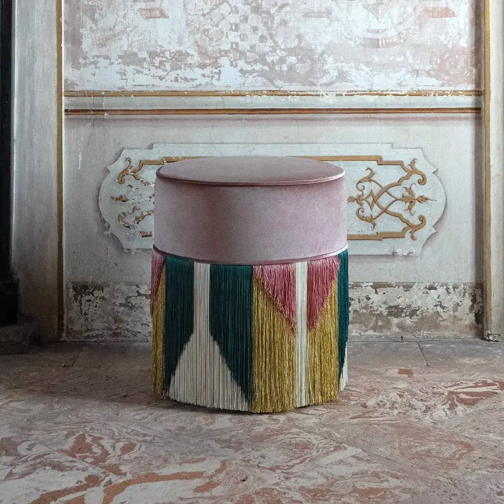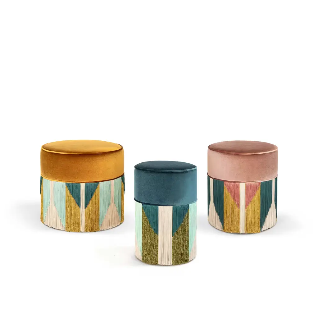 The Treasure Collection by Lorenza Bozzoli Couture seems to be coming straight out of the roaring twenties Art Deco. Beautifully balanced, geometric, and symmetrical, it is enriched by bold and contrasting colors recalling diamonds, combined with softer and paler ones, creating a sense of class and elegance. What is never missing are the luxurious and sophisticated metallic accents, reminding of rich and luscious jewels combined with the plush velvet. Each bespoke piece is stamped on the bottom of the pouf’s lining and personally signed, numbered, and dated by designer.