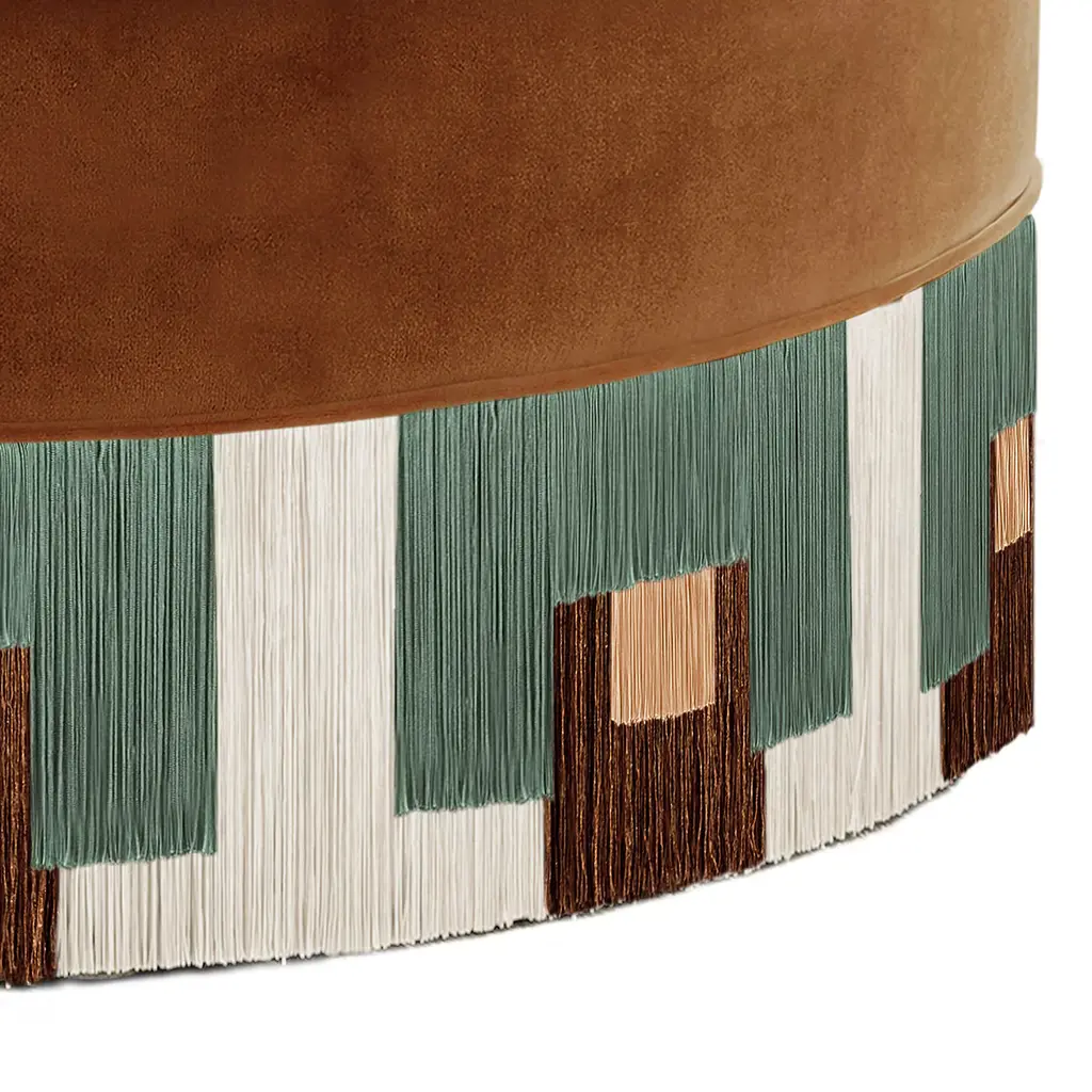 The Treasure Collection by Lorenza Bozzoli Couture seems to be coming straight out of the roaring twenties Art Deco. Beautifully balanced, geometric, and symmetrical, it is enriched by bold and contrasting colors recalling diamonds, combined with softer and paler ones, creating a sense of class and elegance. What is never missing are the luxurious and sophisticated metallic accents, reminding of rich and luscious jewels combined with the plush velvet. Each bespoke piece is stamped on the bottom of the pouf’s lining and personally signed, numbered, and dated by designer.