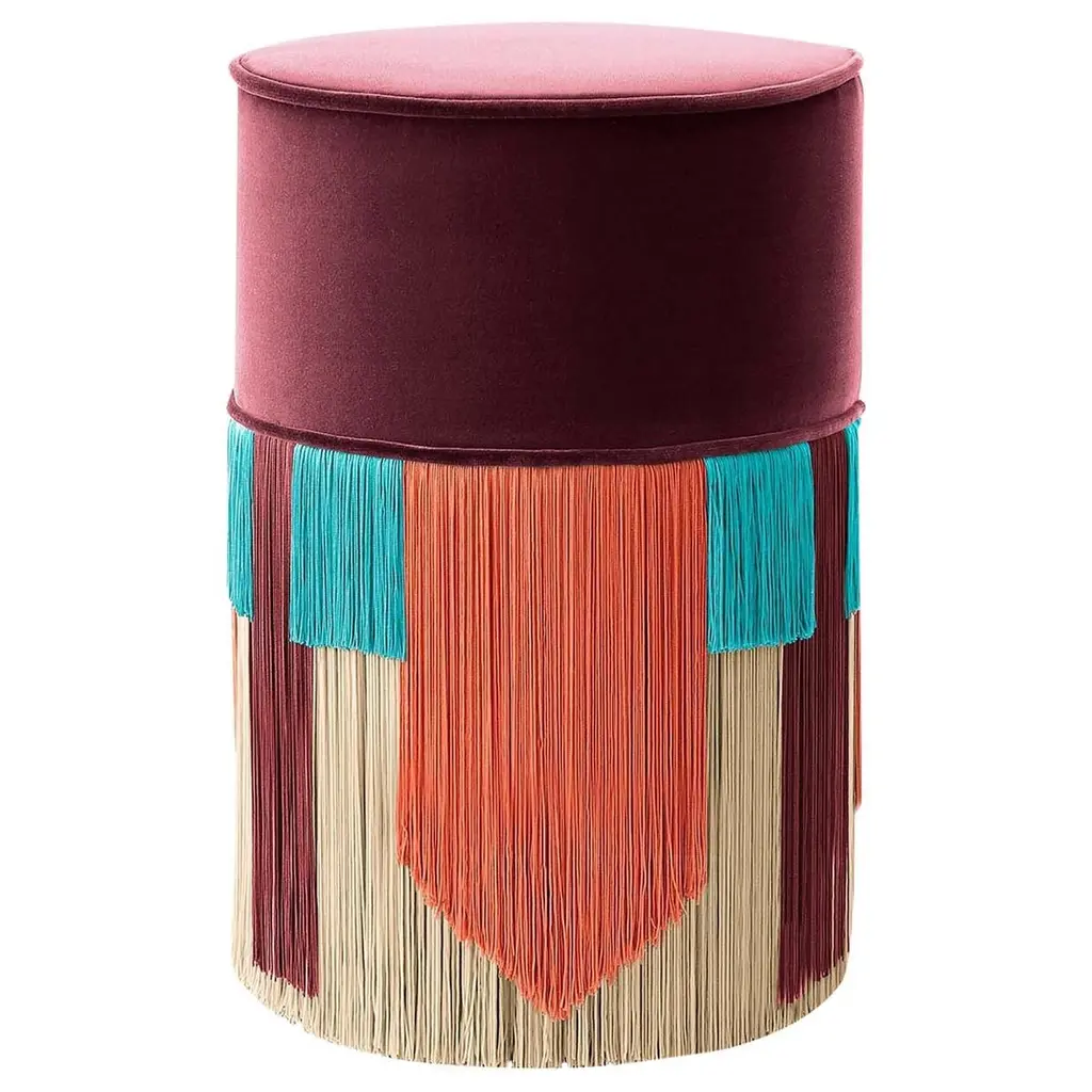 This chic Tribe Pouf by Lorenza Bozzoli is completely handcrafted and personalized with the artist's signature. Showcasing a gorgeous rust hue fabric seat, along with a patterned viscose and lurex fringe skirt. This piece may be customized upon request, please contact the Concierge for details.