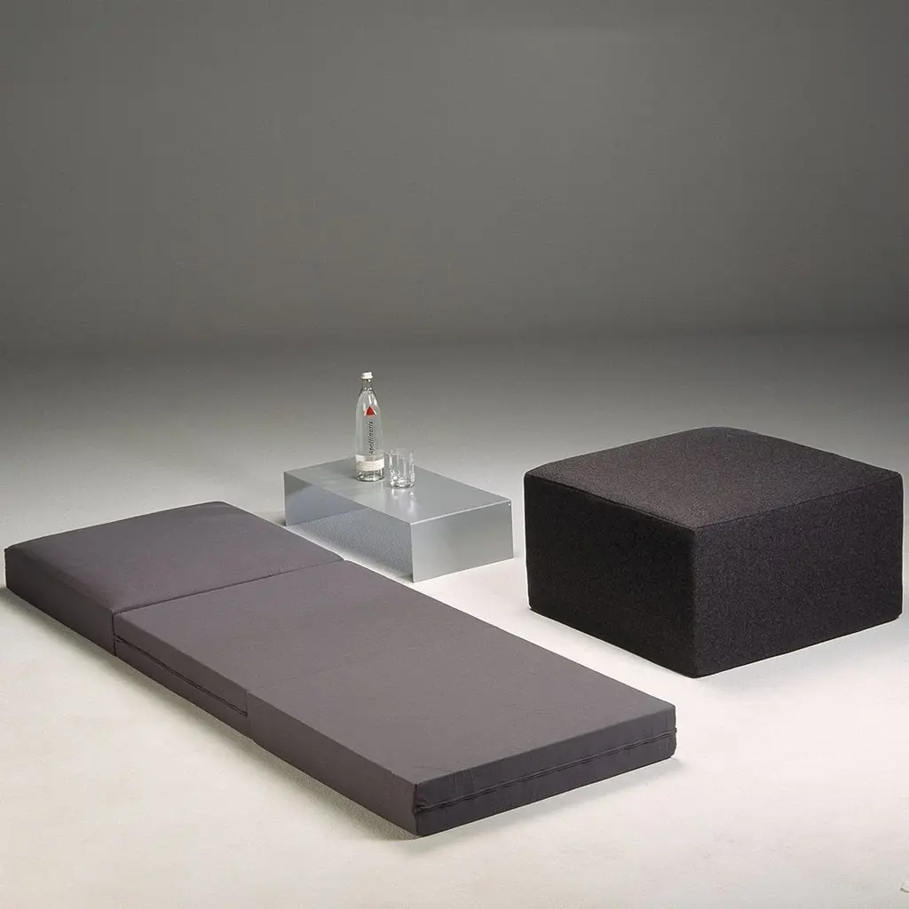MULTIFUNCTIONAL POUF. One, two, three. TRIO consist of a triple-fold mattress, which unfolds into a sleeping mattress – a perfect bed for your guest or for the children to play on. This pouf is a big hit in many homes, because it's decorative, functional and easy to store and fold out. A light tray table changes the pouf into a table. It has eight pockets for magazines etc.