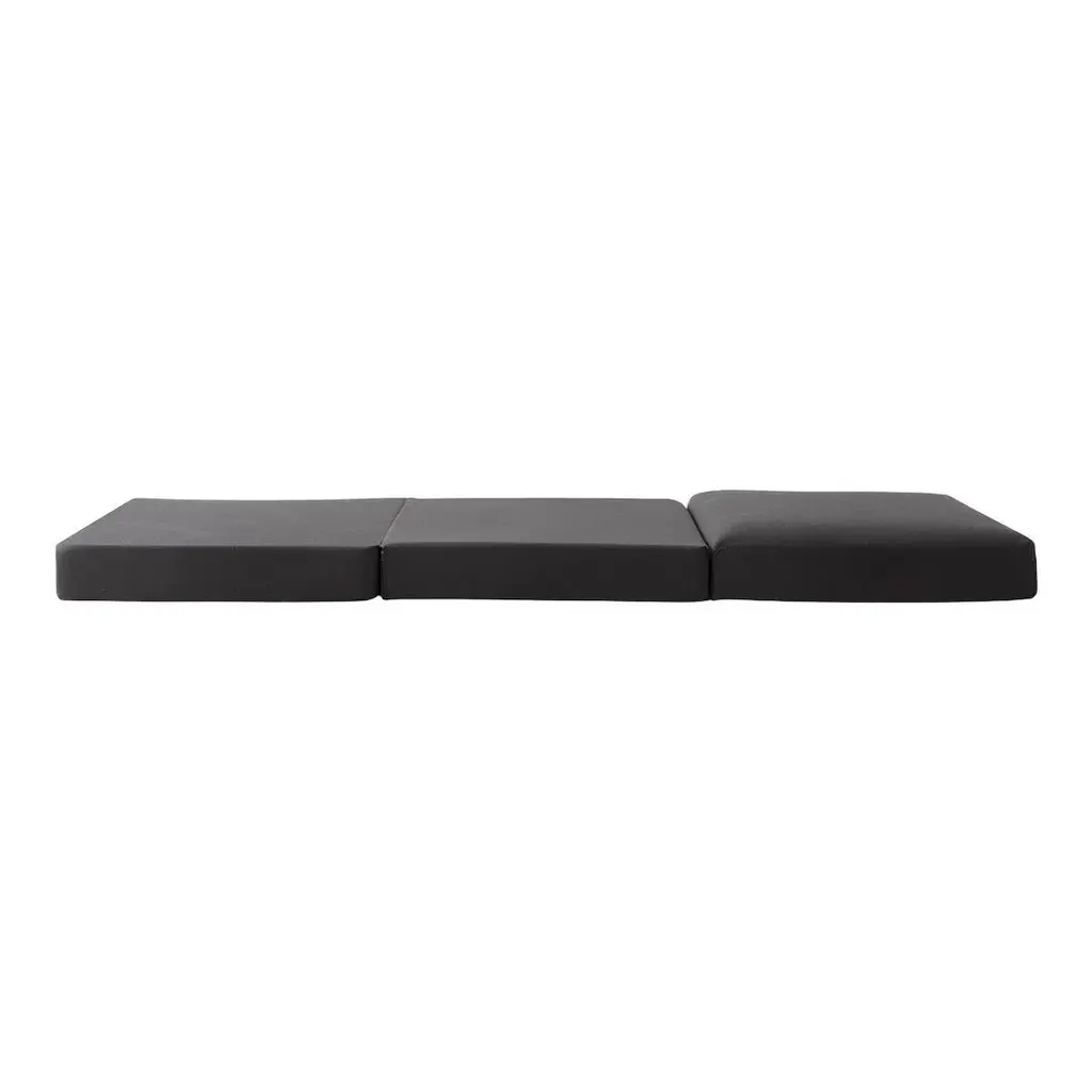 MULTIFUNCTIONAL POUF. One, two, three. TRIO consist of a triple-fold mattress, which unfolds into a sleeping mattress – a perfect bed for your guest or for the children to play on. This pouf is a big hit in many homes, because it's decorative, functional and easy to store and fold out. A light tray table changes the pouf into a table. It has eight pockets for magazines etc.