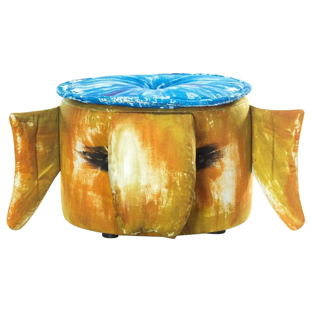 Tortoise-shaped pouf with carved wooden frame and matt orange lacquer; upholstery in Malgré Tout fabric.